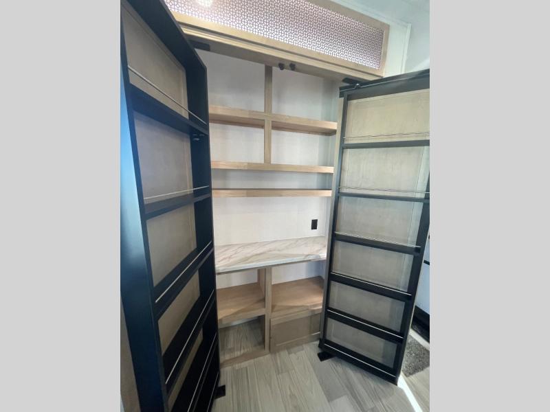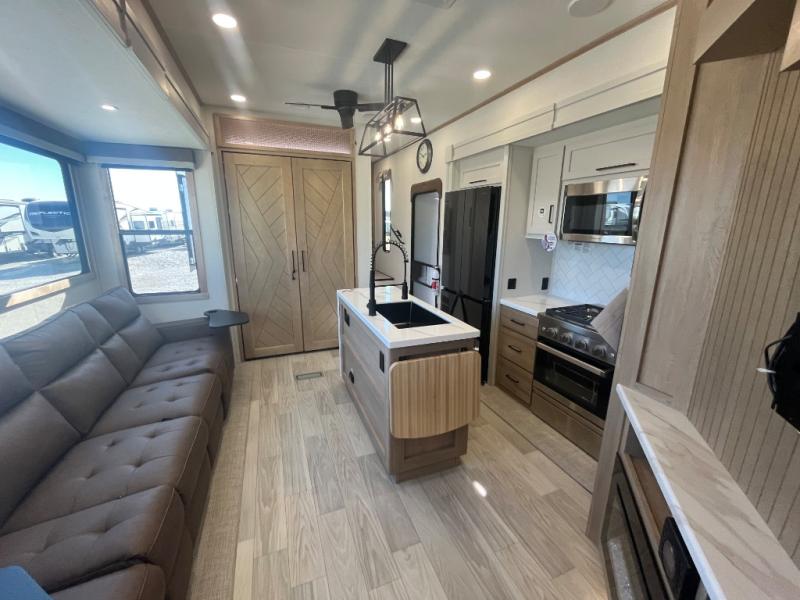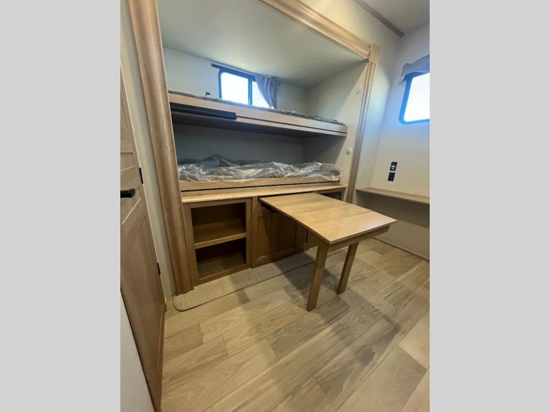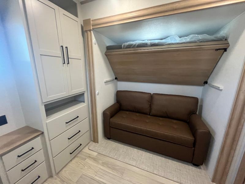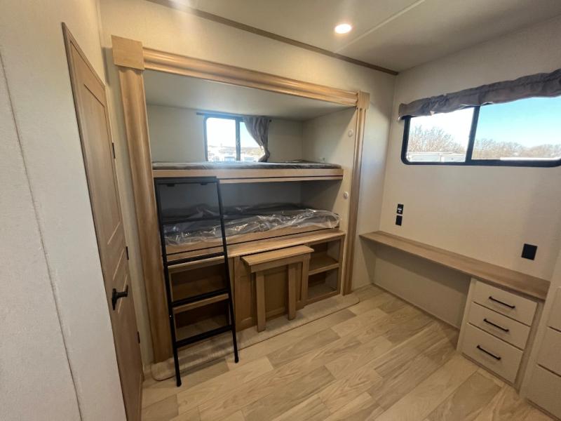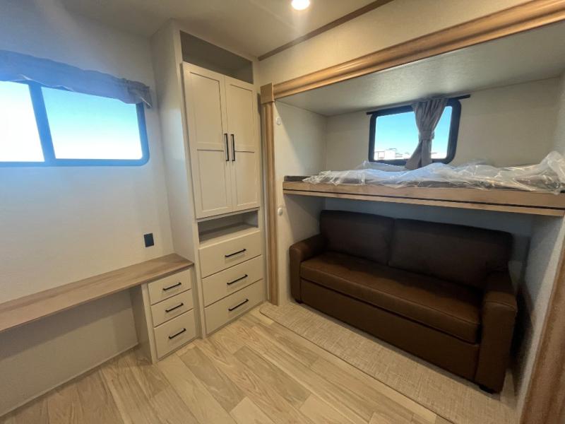 This spacious fifth wheel is designed for comfort and functionality from front to back. The front bedroom offers a king-size 72" x 80" bed, a dresser, and a wardrobe with shelves for all your storage needs. Adjacent to the bedroom is a full bathroom featuring a one-piece fiberglass shower, linen shelves, overhead cabinet, and a medicine cabinet. In the center, the main living area includes a large sofa in the expansive slide-out, perfect for relaxing or gathering, along with a kitchen island, a 3-burner range, a 16-cu. ft. refrigerator, and a butler pantry for added storage. At the rear, the bunkhouse provides generous sleeping space with two 32" x 74" bunks and a table on one side, a flip-up bunk and tri-fold sofa on the other, plus a built-in desk and wardrobe. This space also features its own half bath and a second entry door for added convenience.
