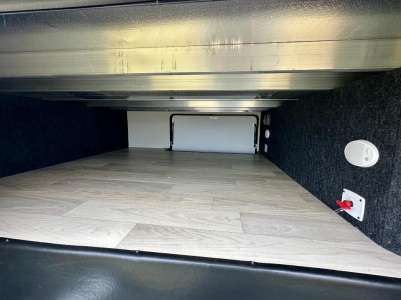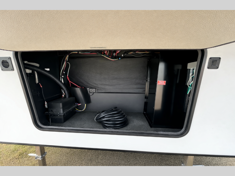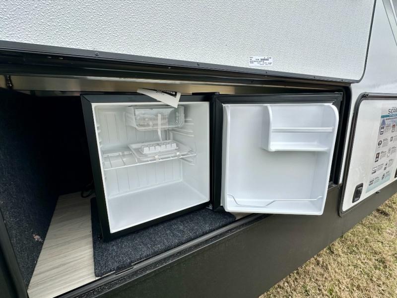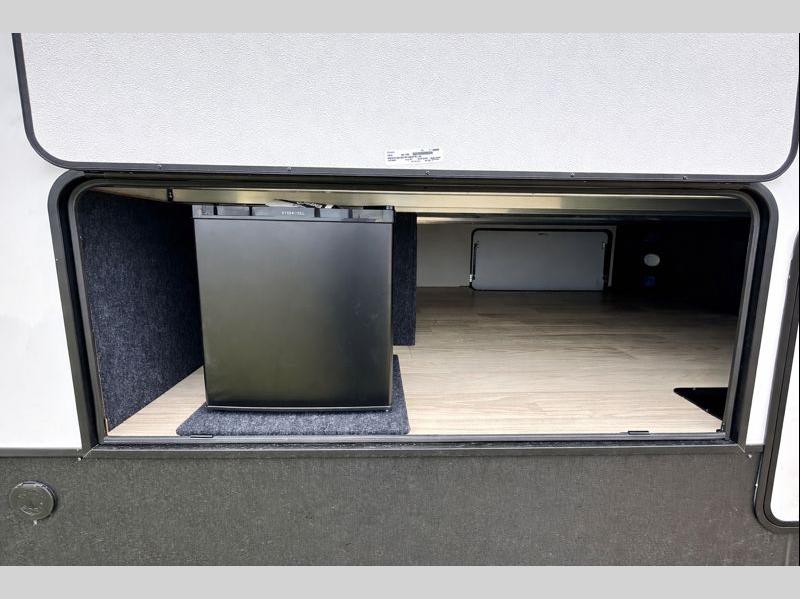 This fifth wheel is perfect for those seeking a comfortable, feature-rich home on wheels. Upon entering, you'll find a spacious rear living room, ideal for relaxation and entertainment. The room features a comfortable chaise lounge, sofa, and an entertainment center with a cozy fireplace. For added convenience, there's a hidden pantry, desk with a chair, and a shelf and cabinet for storage. The kitchen is well-appointed with a stylish kitchen island featuring a beautiful waterfall edge. Overhead cabinets provide ample storage, while the microwave and 12V refrigerator allow for easy meal prep. Plus, a butler pantry offers additional storage for kitchen essentials. A convenient half bath is located nearby, complete with a stackable washer and dryer prep if you want the option to add these appliances. The bedroom retreat features a comfortable king bed, a small dresser, and a tall dresser with a TV hookup. The adjacent walk-in bathroom closet boasts a one-piece fiberglass shower, dual sink, medicine cabinet, linen closet, and ample storage thanks to the various shelves, perfect for keeping your belongings organized. Exterior features include two awnings, one 12’ and the other 18’, providing ample shade and protection.