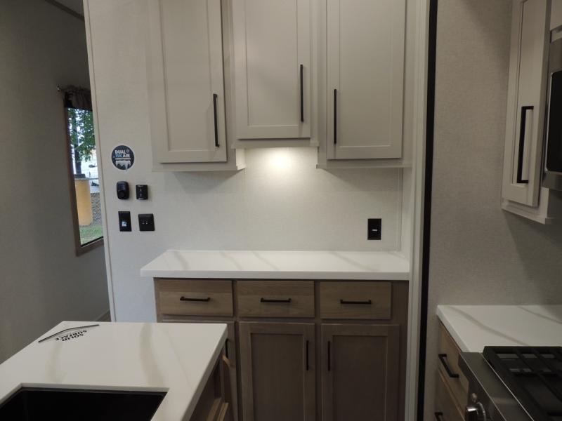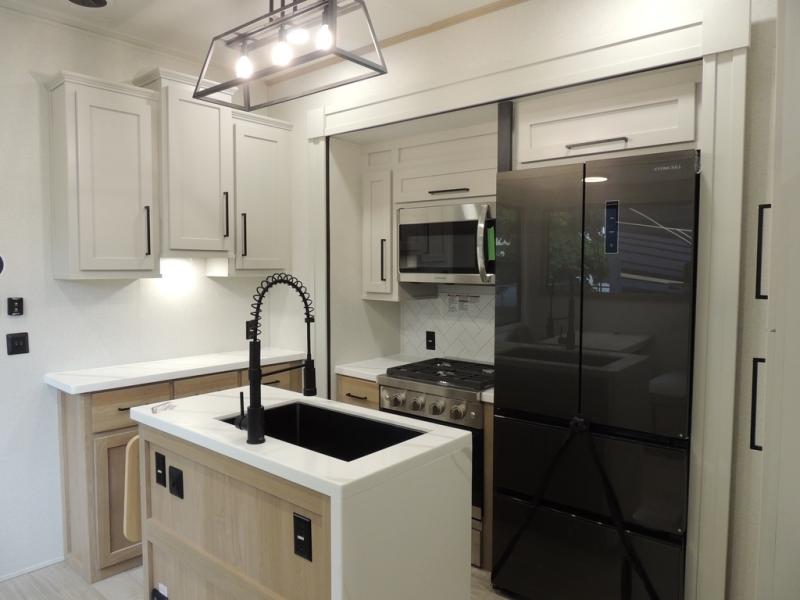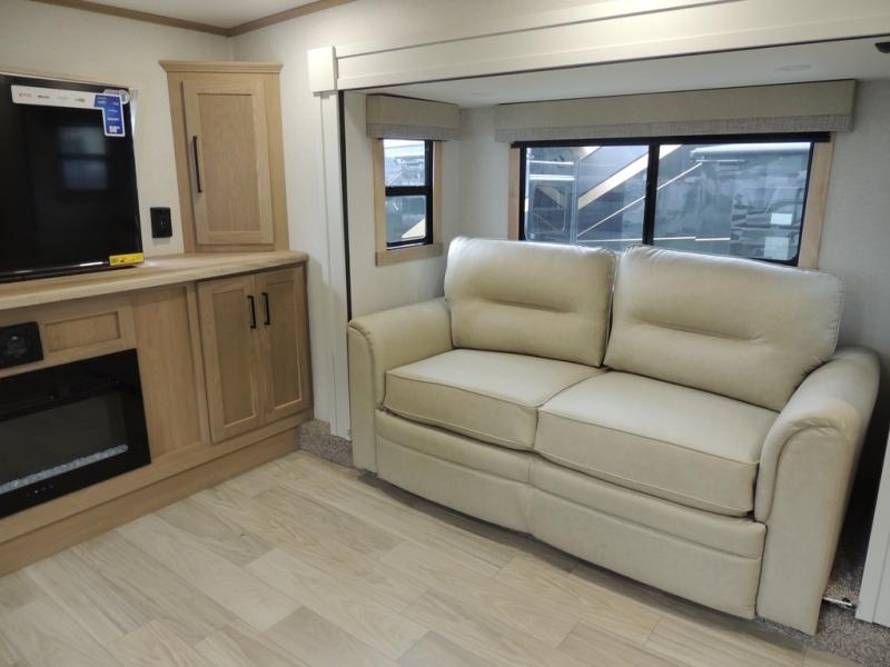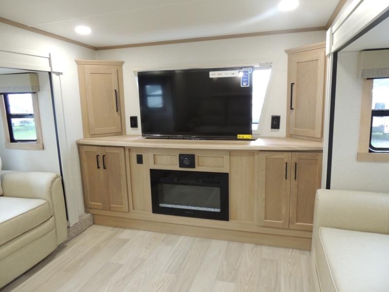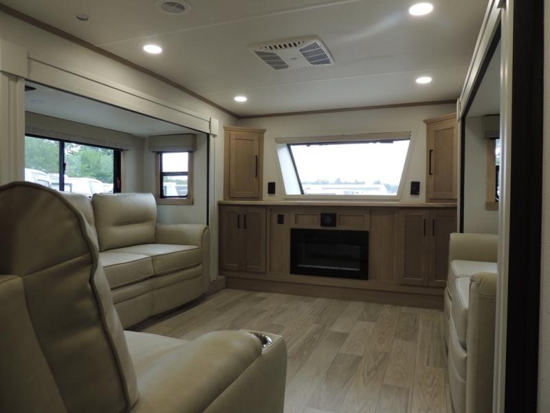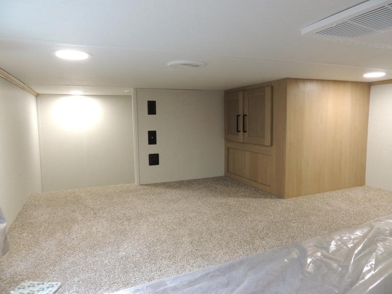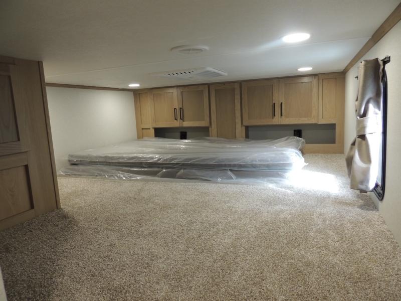 The perfect fifth wheel for a larger family! This unit sleeps eight or more with the full and half lofts above the rear master bedroom and bathroom. In the full loft area there are two 44" x 74" bunk mats for comfort as well as wardrobe/storage at the head of each. The master bedroom features a king size bed that slides out to create more space by the bed. A spacious bath features a walk-in shower for comfort and includes a seat so you can relax while you shower. A spacious kitchen features two slides, a free standing dinette in one, and the 12V refrigerator and stove in the other. There is also a center island with large sink for added food prep space. Head up the steps in front to a dual slide front living area with 50" TV and fireplace beneath the window. There is also theater seating opposite the TV, and a tri-fold hide-a-bed in each slide allowing added sleeping space when needed.