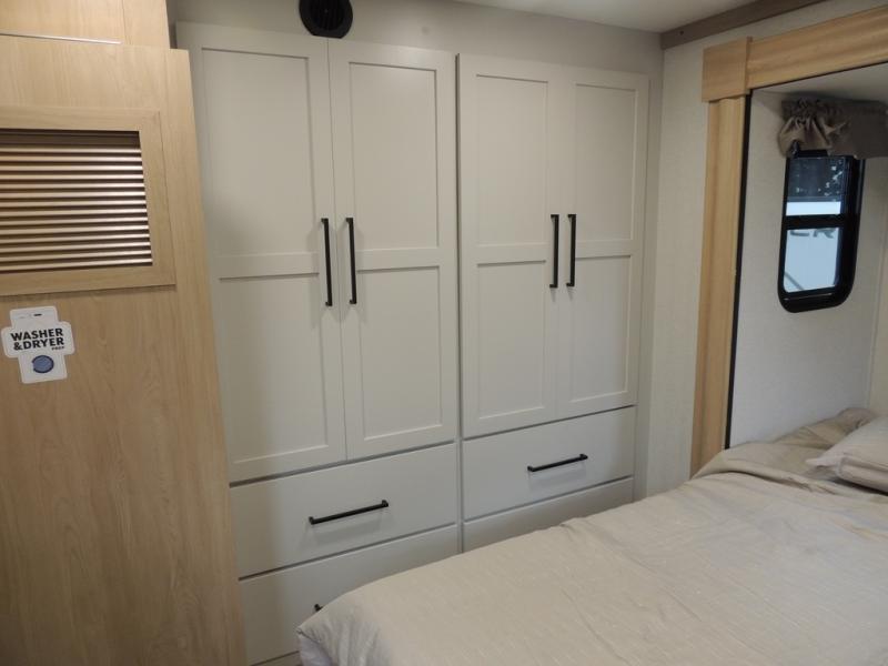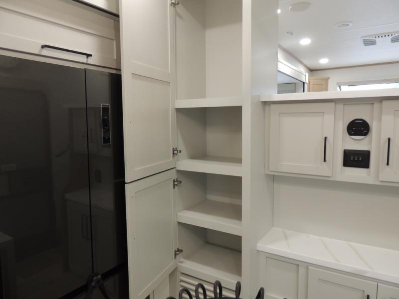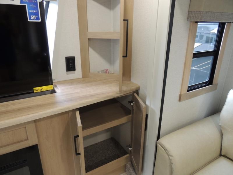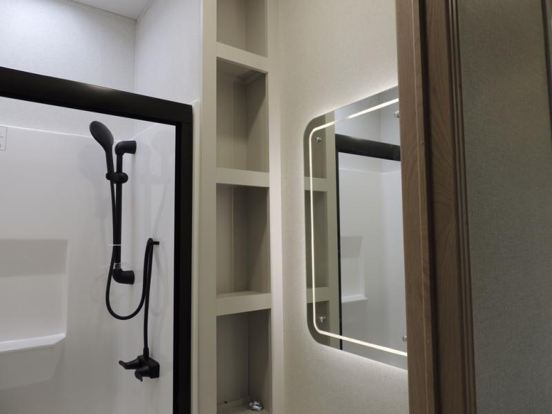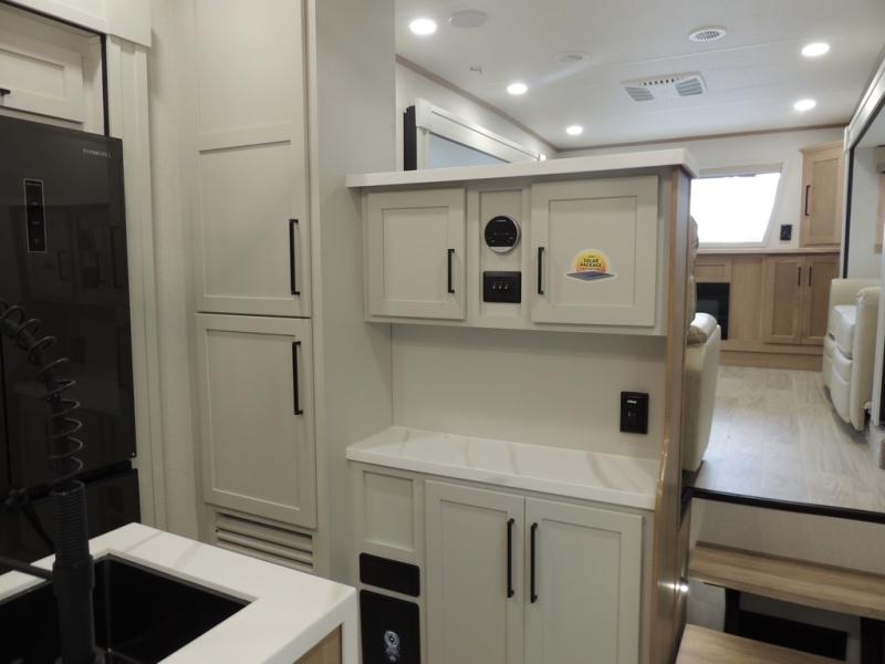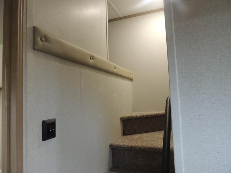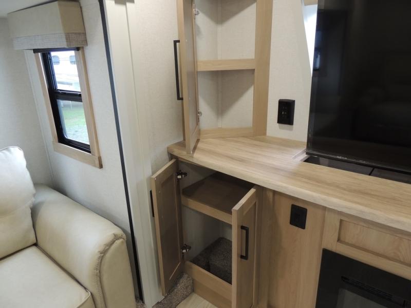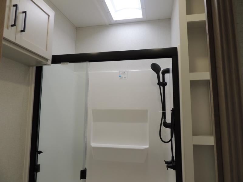 The perfect fifth wheel for a larger family! This unit sleeps eight or more with the full and half lofts above the rear master bedroom and bathroom. In the full loft area there are two 44" x 74" bunk mats for comfort as well as wardrobe/storage at the head of each. The master bedroom features a king size bed that slides out to create more space by the bed. A spacious bath features a walk-in shower for comfort and includes a seat so you can relax while you shower. A spacious kitchen features two slides, a free standing dinette in one, and the 12V refrigerator and stove in the other. There is also a center island with large sink for added food prep space. Head up the steps in front to a dual slide front living area with 50" TV and fireplace beneath the window. There is also theater seating opposite the TV, and a tri-fold hide-a-bed in each slide allowing added sleeping space when needed.