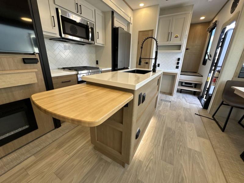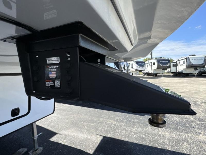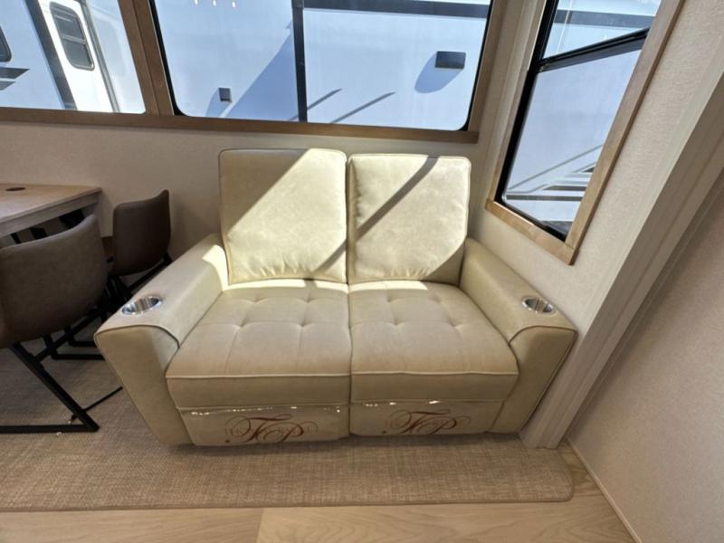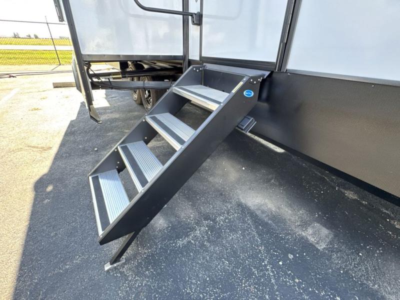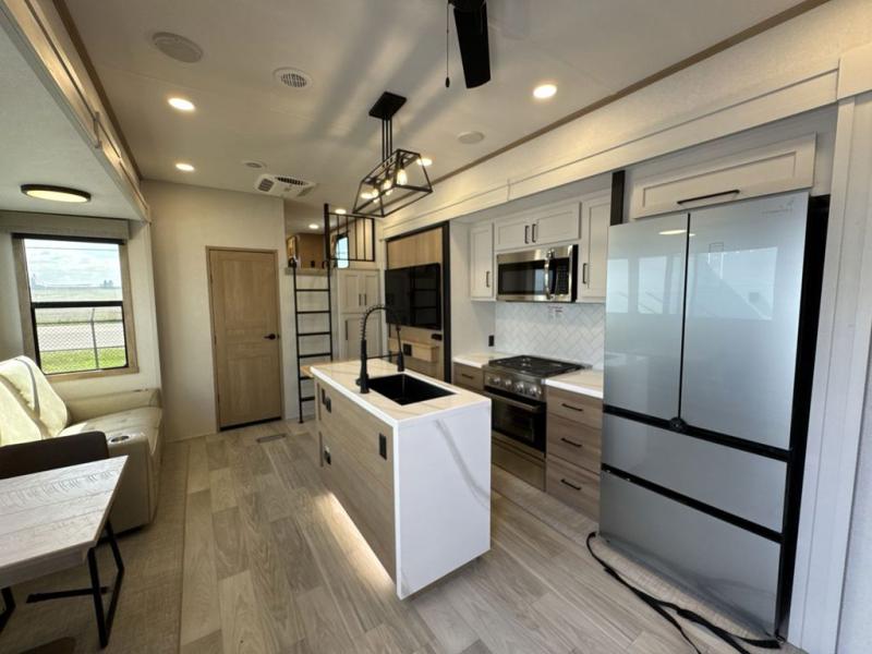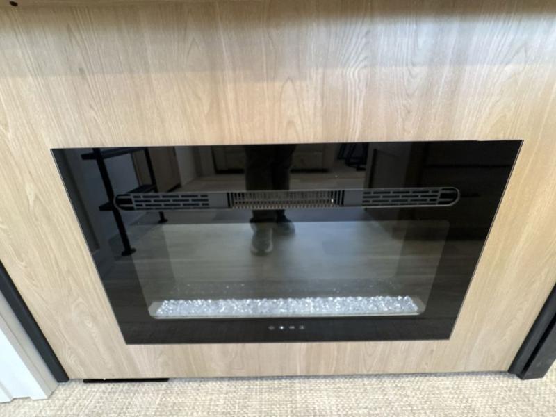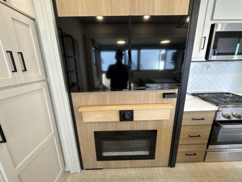 Enjoy a home on wheels with this fifth wheel! There are two bedrooms to choose from plus an upper loft with two 32" x 74" bunk mats, cabinets, and TV prep. The front private bedroom has a queen bed slide across from a dresser and a front wardrobe that is prepped to add an optional washer and dryer. The second bedroom has a queen bed slide across from a dresser with wardrobes on either side, plus it's very own full rear bathroom which has a 36" x 24" tub and a rear entry/exit door to the unit. The second full bathroom has a shower with a seat so everyone can get ready quickly in the morning. Prepare your best home cooked meals with the kitchen island and three burner cooktop then enjoy it at the free standing dinette. Relax in true comfort each night in the theater seating across from the fireplace and 50" TV at the entertainment center!