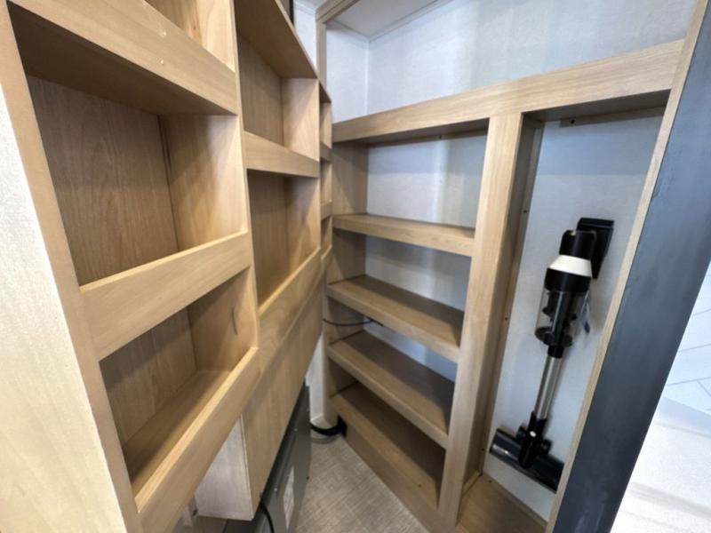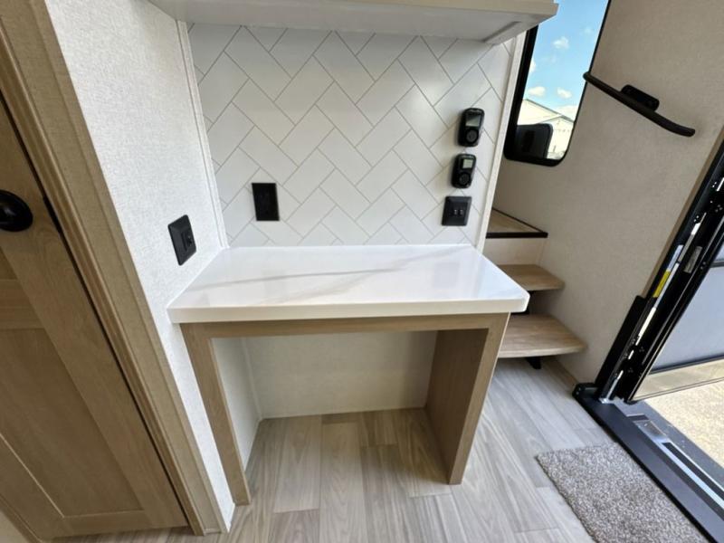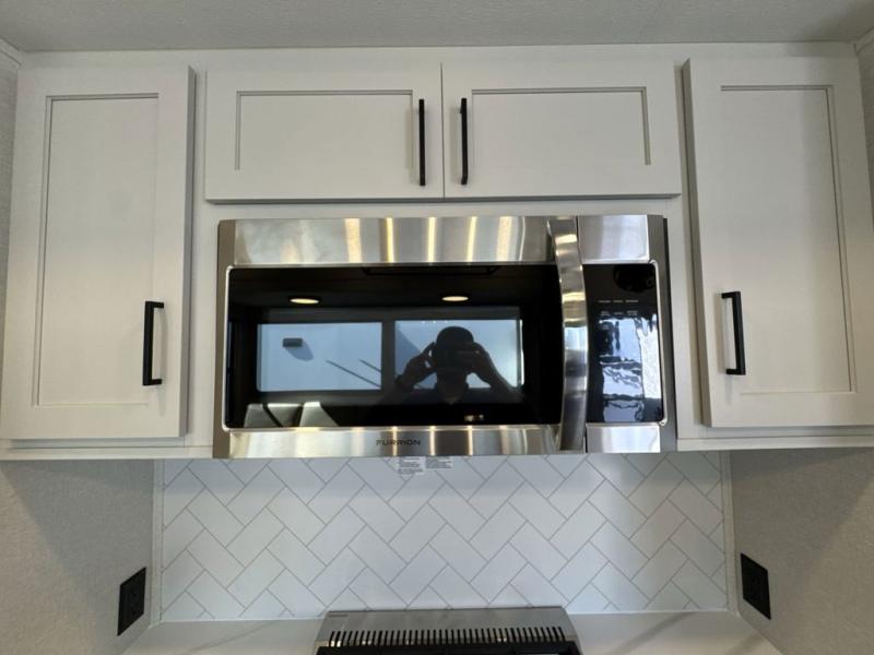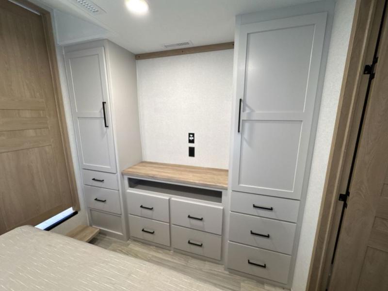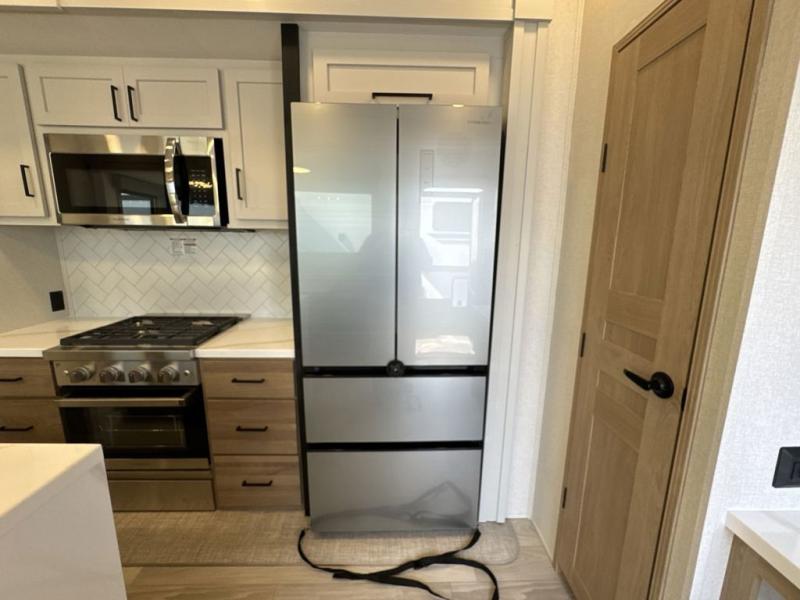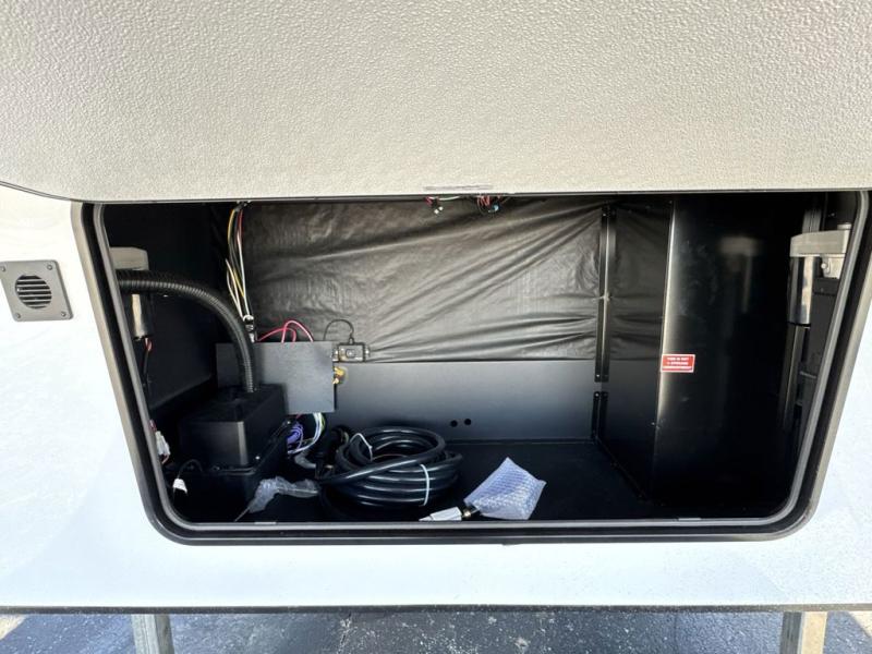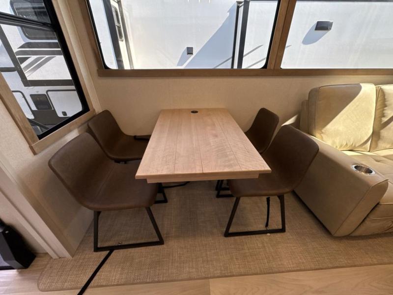 Enjoy a home on wheels with this fifth wheel! There are two bedrooms to choose from plus an upper loft with two 32" x 74" bunk mats, cabinets, and TV prep. The front private bedroom has a queen bed slide across from a dresser and a front wardrobe that is prepped to add an optional washer and dryer. The second bedroom has a queen bed slide across from a dresser with wardrobes on either side, plus it's very own full rear bathroom which has a 36" x 24" tub and a rear entry/exit door to the unit. The second full bathroom has a shower with a seat so everyone can get ready quickly in the morning. Prepare your best home cooked meals with the kitchen island and three burner cooktop then enjoy it at the free standing dinette. Relax in true comfort each night in the theater seating across from the fireplace and 50" TV at the entertainment center!
