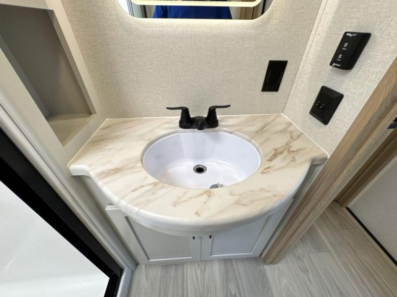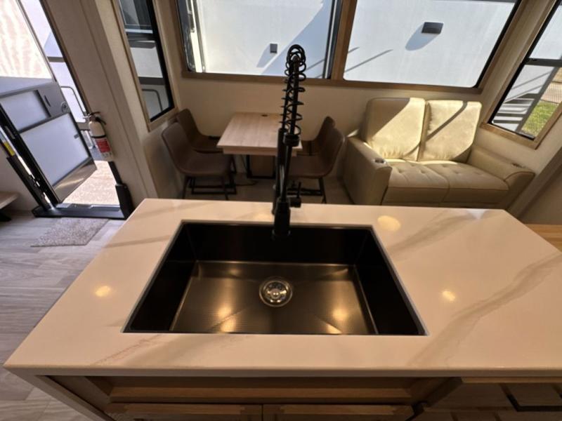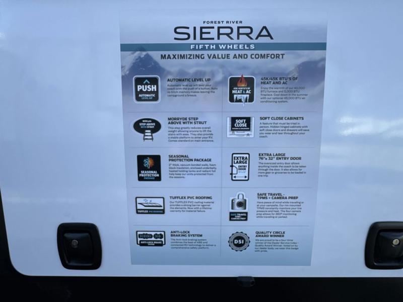 Each one of these Forest River Sierra fifth wheels are equipped with everything you need to make the most of each adventure! The underbelly armor will protect your unit's vitals from road debris and the painted two tone aerodynamic fiberglass front cap has an improved turning radius to make them easier to navigate. With an electric leveling system, you can set your unit up quick and easy then get to having fun faster than ever. The welded aluminum framed, vacuum bonded laminated superstructure will hold up through every adventure and the cambered powder coated frame comes with rust prohibitor to last longer. Each model also includes the Summit Package that comes with a king Wi-Fi extender system and Olympus antenna, a full coach water filter system, Goodyear tires with 7,000 lb. axles, and the list goes on. The interior is just as impressive with rustic wood plank linoleum, recessed residential lighting, a memory foam mattress, and mocha accent crown molding over the kitchen cabinets!
