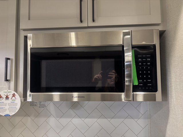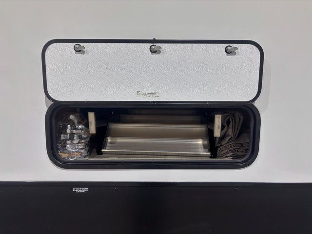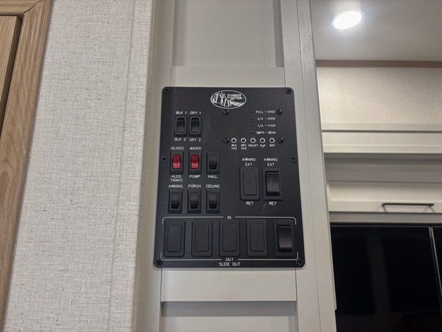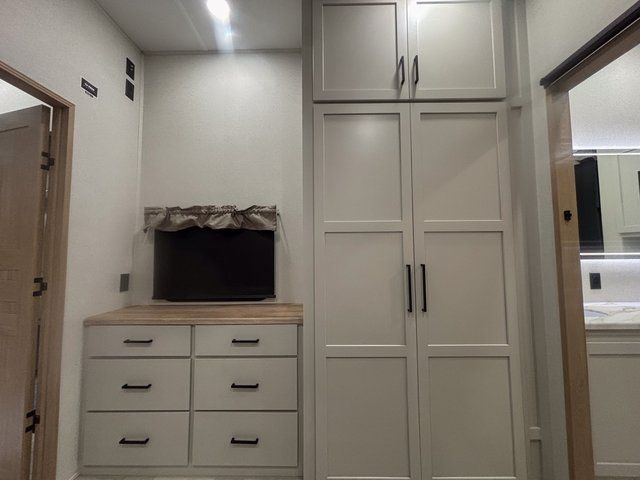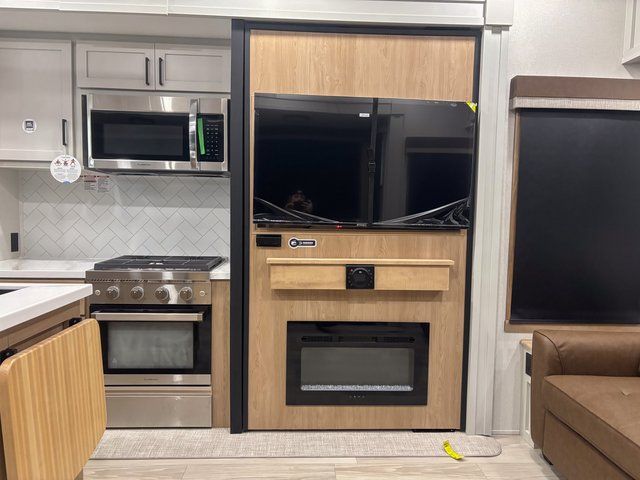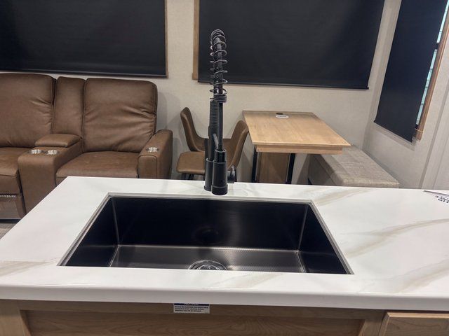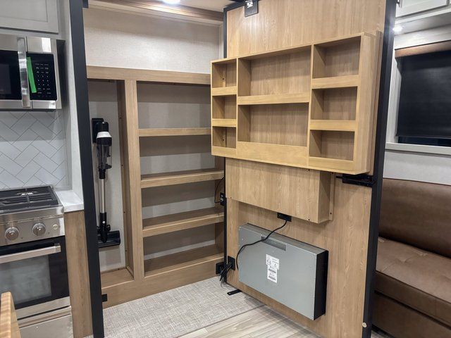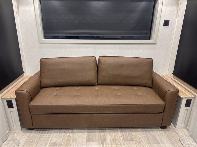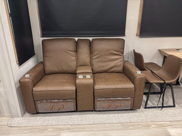 The front living area welcomes you with a tri-fold hide-a-bed sofa and theater seating positioned across from the entertainment center. A hidden pantry behind the TV adds extra storage without sacrificing style.