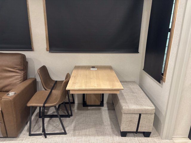 The free-standing dinette with bench and two chairs offers a comfortable place to gather for meals, games, or conversation.