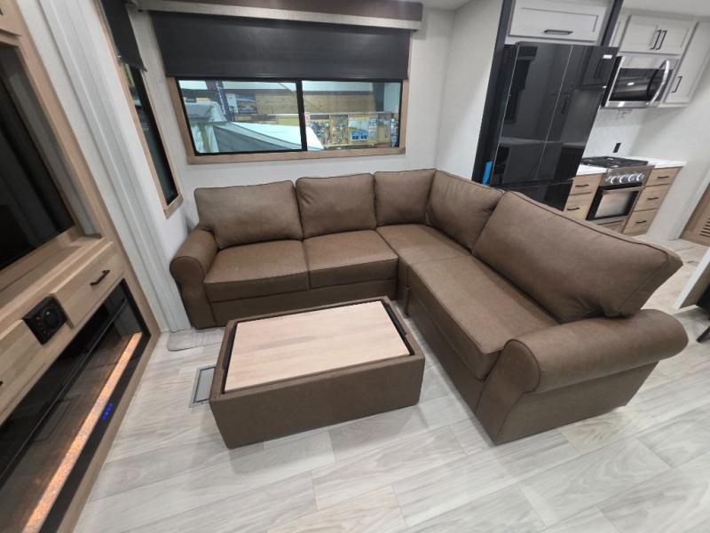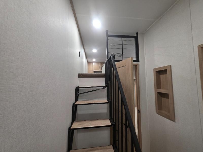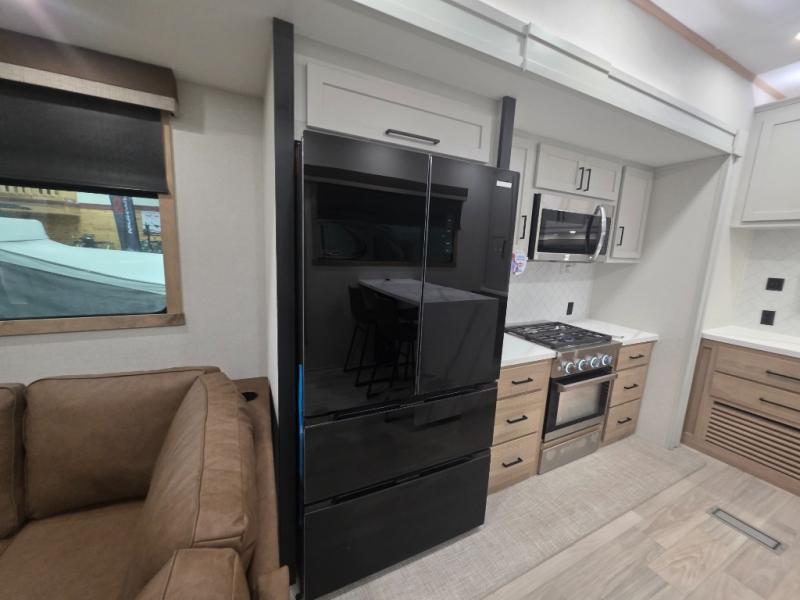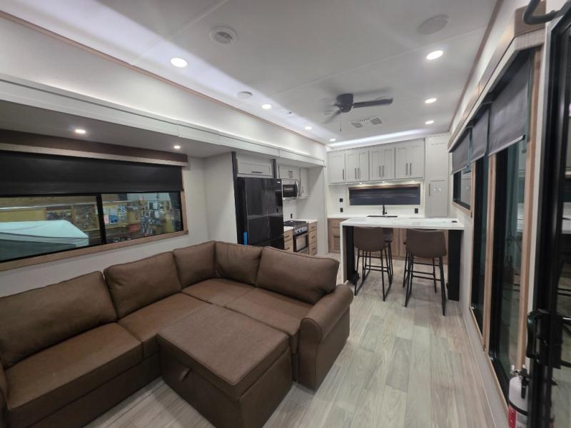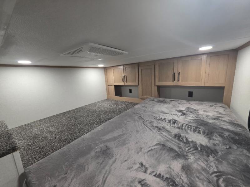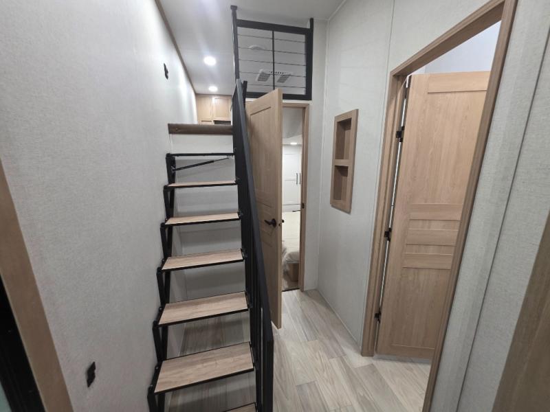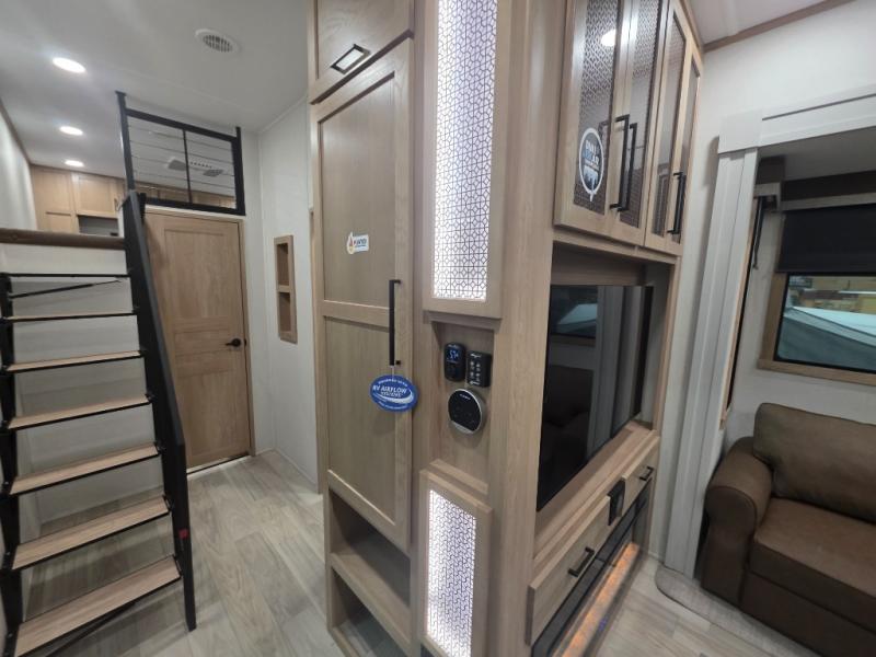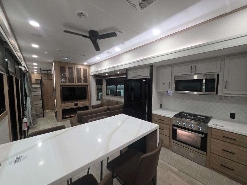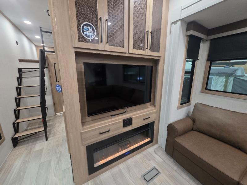 This incredible destination trailer has everything you need to live life to the fullest. Imagine retreating to a peaceful rear bedroom, complete with a king bed slide, spacious wardrobe, plus a closet with washer and dryer prep. Unwind and pamper yourself in style in the incredible full bathroom, featuring a linen closet, medicine cabinets, and a fiberglass shower with a seat. The living room is the heart of the home, boasting a comfortable sectional sofa, ottoman, and entertainment center perfect for gathering with family or friends and creating unforgettable memories. The loft is a cozy retreat for kids or guests, featuring two bunk mats, and a dual wardrobe/bookcases for their things. The front kitchen has a 19 cu. ft. refrigerator, overhead cabinet, microwave, three-burner cooktop, and free-standing dinette with a waterfall edge, and the pantry provides ample storage for all your favorite foods. Finally, step outside and enjoy the shade and protection of the two awnings and the two entry and two exit doors will make it easy to come and go.