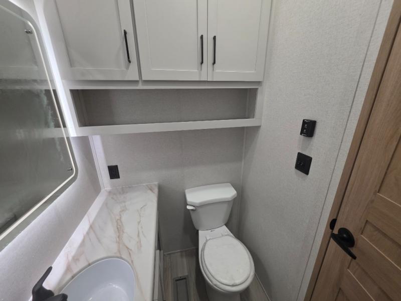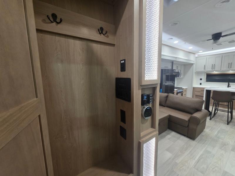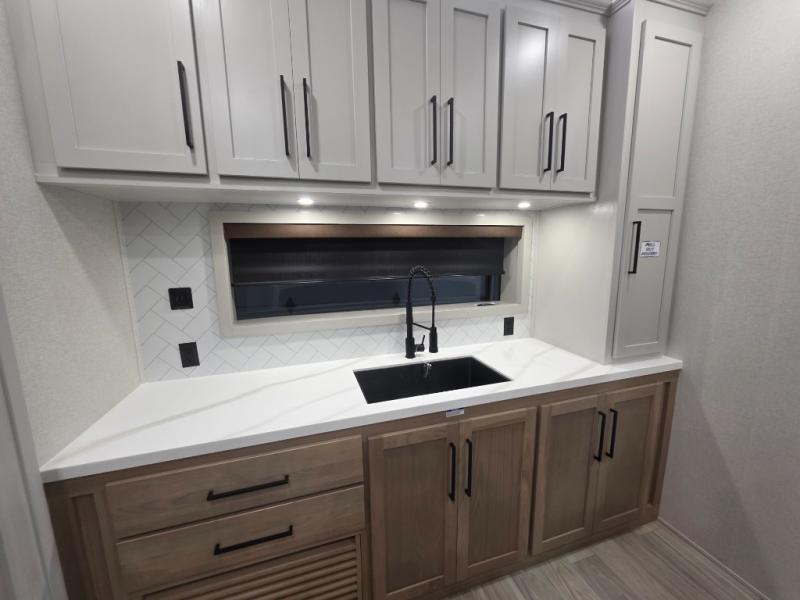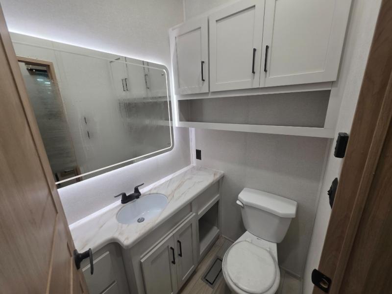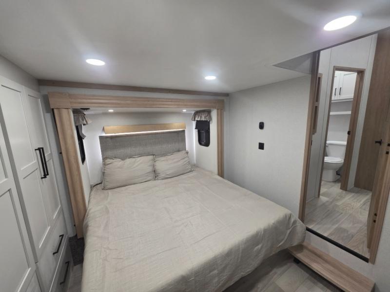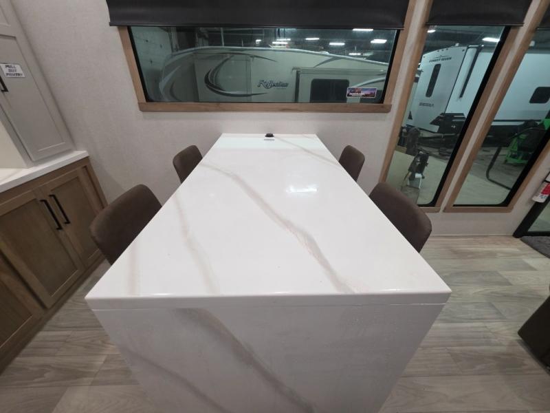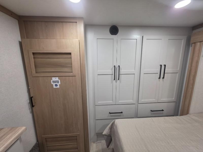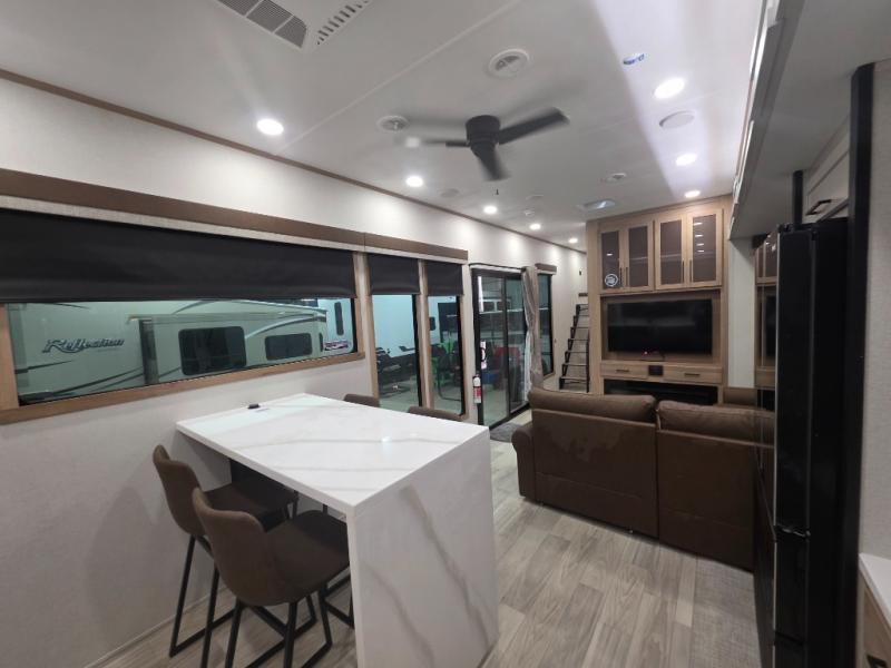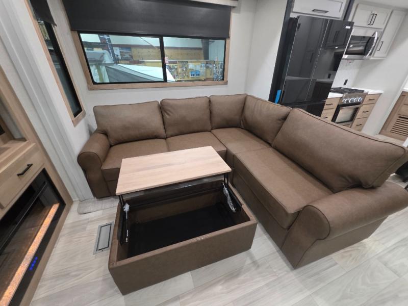 This incredible destination trailer has everything you need to live life to the fullest. Imagine retreating to a peaceful rear bedroom, complete with a king bed slide, spacious wardrobe, plus a closet with washer and dryer prep. Unwind and pamper yourself in style in the incredible full bathroom, featuring a linen closet, medicine cabinets, and a fiberglass shower with a seat. The living room is the heart of the home, boasting a comfortable sectional sofa, ottoman, and entertainment center perfect for gathering with family or friends and creating unforgettable memories. The loft is a cozy retreat for kids or guests, featuring two bunk mats, and a dual wardrobe/bookcases for their things. The front kitchen has a 19 cu. ft. refrigerator, overhead cabinet, microwave, three-burner cooktop, and free-standing dinette with a waterfall edge, and the pantry provides ample storage for all your favorite foods. Finally, step outside and enjoy the shade and protection of the two awnings and the two entry and two exit doors will make it easy to come and go.