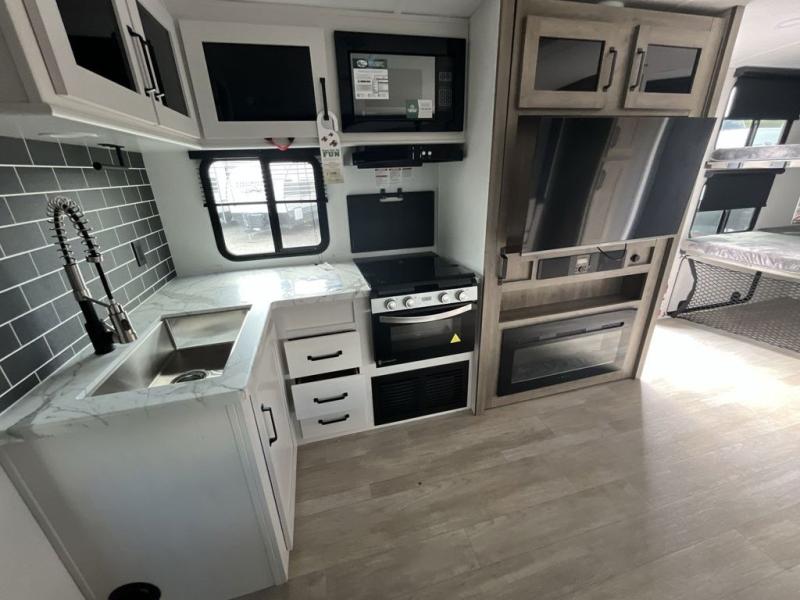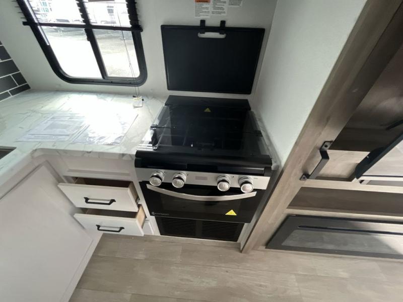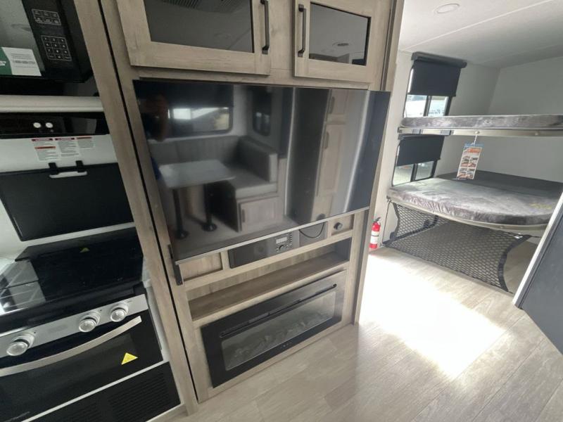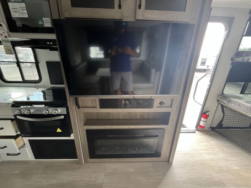 Your friends and family will love camping with you in this trailer that offers sleeping space for eight with the queen bed, the double-size bunks and the U-shaped dinette once it is easily set up for sleeping space. The cook will love the full kitchen with its cooktop, microwave, electric refrigerator plus hidden pantry behind the entertainment center. A full bath with a 30" x 36" shower will let you freshen up each day, and you'll love having your own space in the front private bedroom!