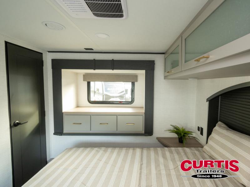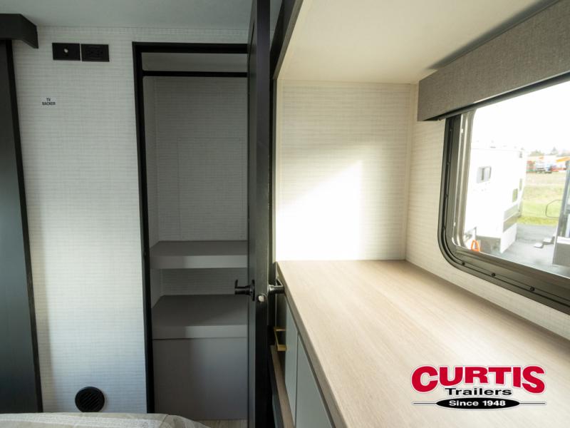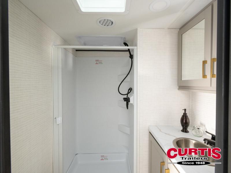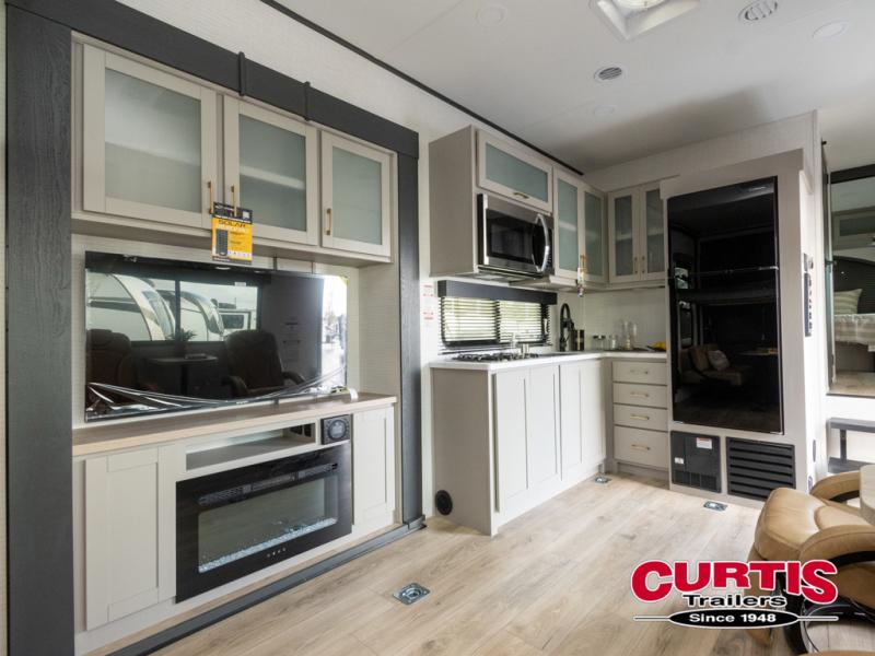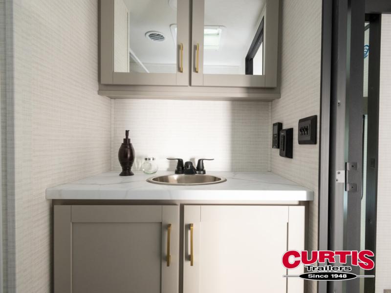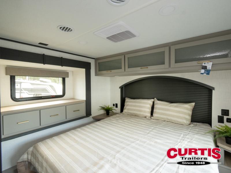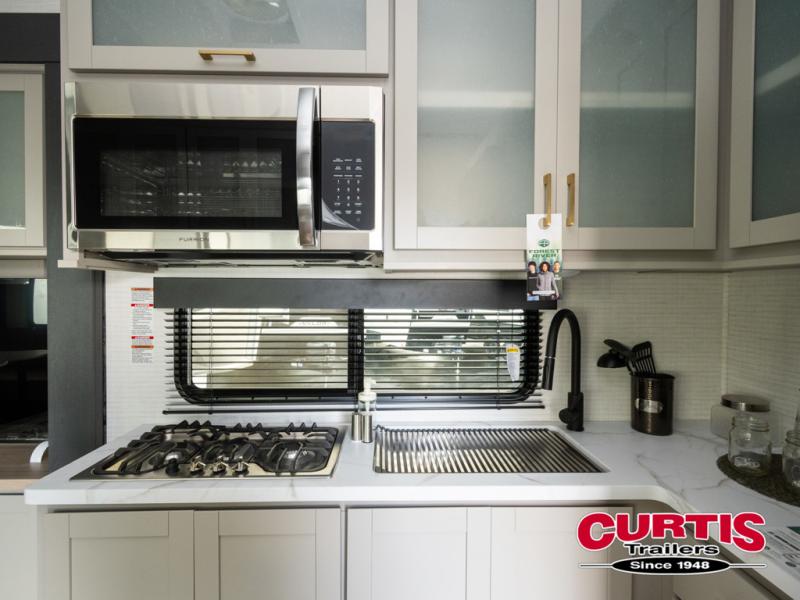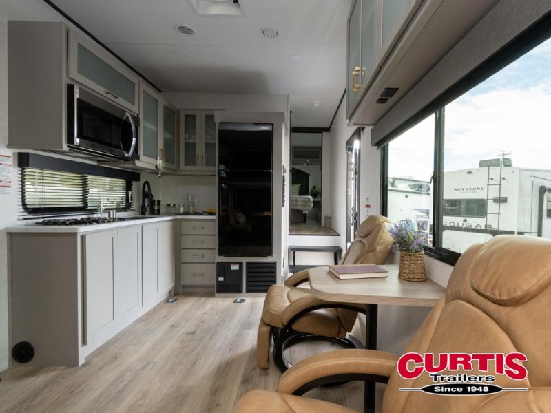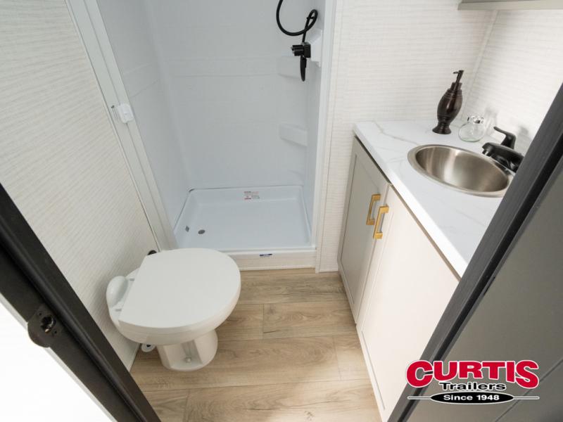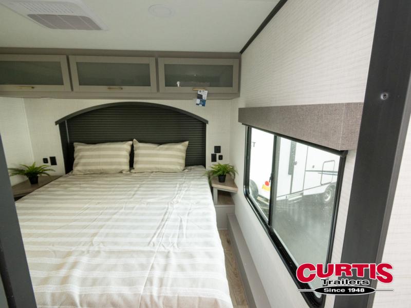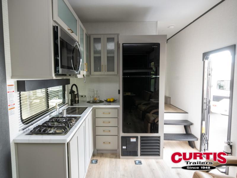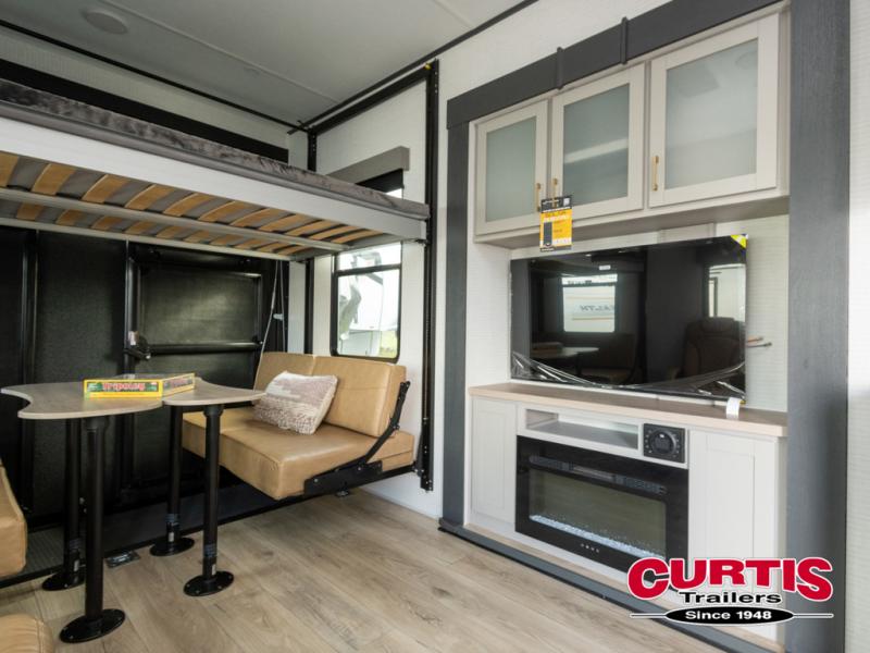 This toy hauler features 15' 7" of total garage space so you can easily fit your toys in! Once they're unloaded, you can relax on the electric pass-thru dinette or dual lounge chairs. There is also an entertainment center slide here. You'll find a cooktop and convection microwave in the kitchen to make meals each day. The full bath will let you clean up after trail riding, and the front private bedroom with a king bed is sure to bring a great night's rest. There is also a dresser slide out in the bedroom for added storage and space!
