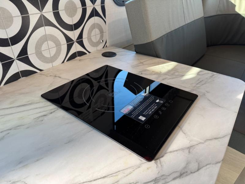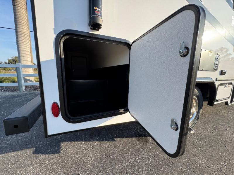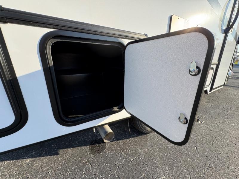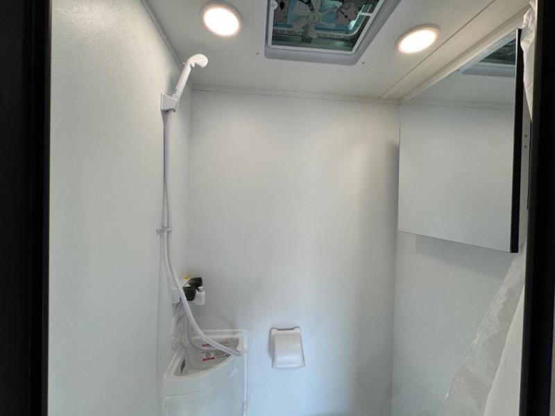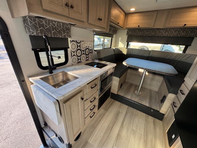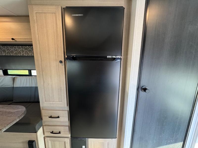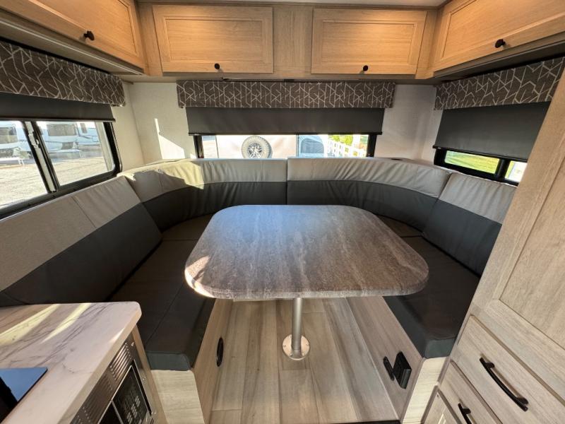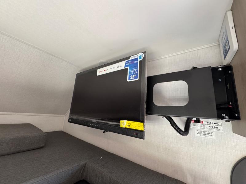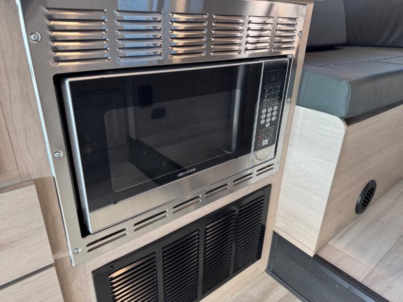 Upon entering this unit, you’re greeted by a spacious 60" x 80" cab-over bunk, providing plenty of comfortable sleeping space for family or guests. Near the entrance, a swing-arm 12V TV lets you enjoy your favorite shows and movies while on the road. Moving toward the center, you’ll find a pantry and a 10.7 cu. ft. refrigerator, perfect for storing both fresh groceries and dry goods. Adjacent to it is the well-designed wet bath, equipped with an oxygen-infused showerhead and flexible extension for a refreshing experience, complemented by a shower skylight and electric roof fan for added light and ventilation. Across the way, the kitchen comes fully equipped with a recessed two-burner range and flush glass cover, a convection microwave/air fryer, and a flip-up countertop that expands your workspace, making meal prep easy and efficient. At the rear, the inviting U-shaped dinette offers a cozy spot to relax, dine, or gather with friends, and at night, it effortlessly converts into an additional sleeping area so you can rest in complete comfort.