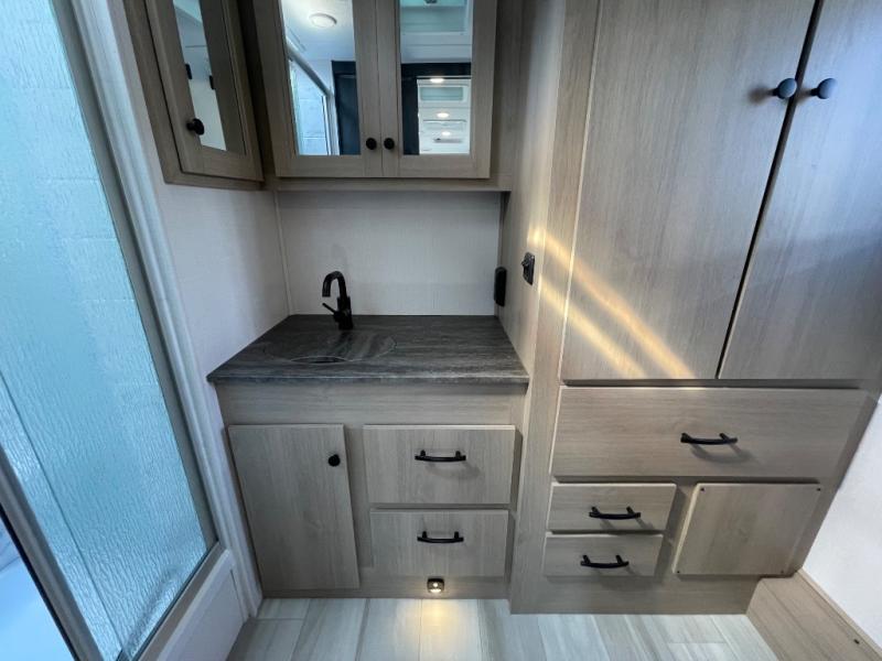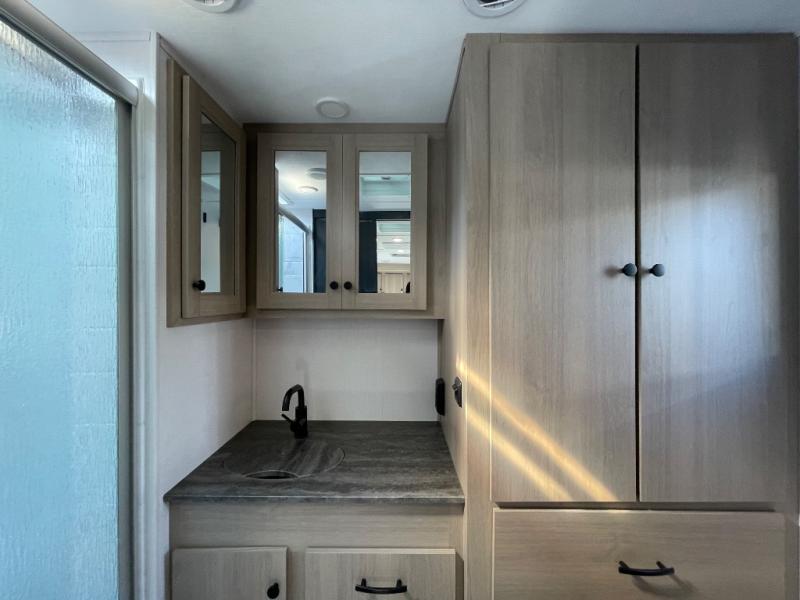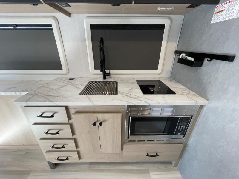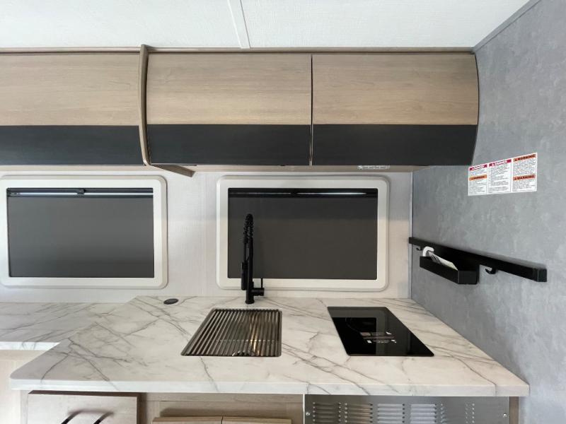 Trips across the state are made cozy in this single slide out coach for two! Once you've parked for the day, you can make lunch on the recessed induction cooktop or in the convection microwave. The sofa slide out provides a place to relax, and the Murphy bed can be folded out when you're ready for some shut-eye. You will appreciate how spacious the full rear bath is, and there is a wardrobe plus a linen closet here for ample storage. The cab-over bunk is only available with the Trekker Cap option; see dealer for more details.
