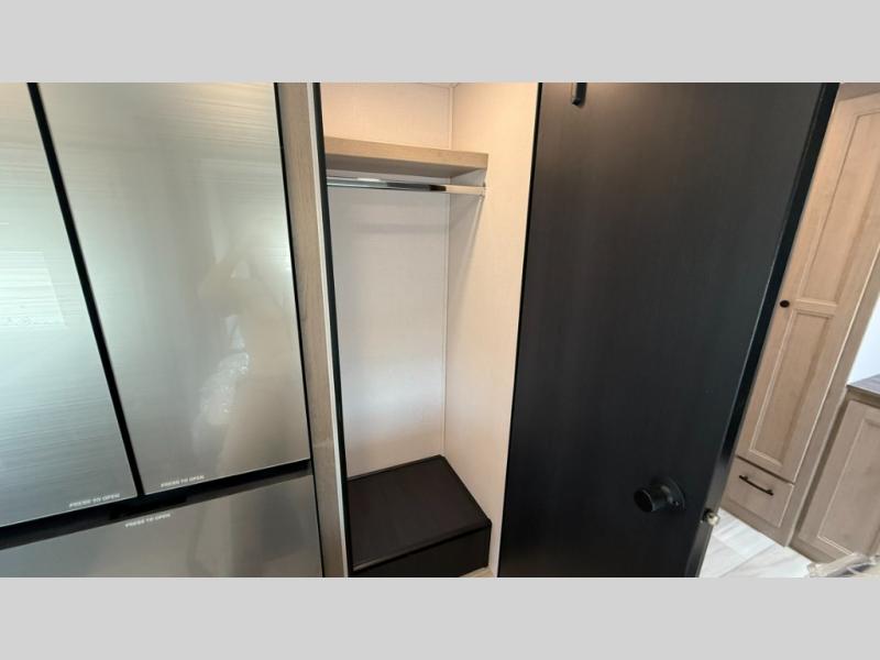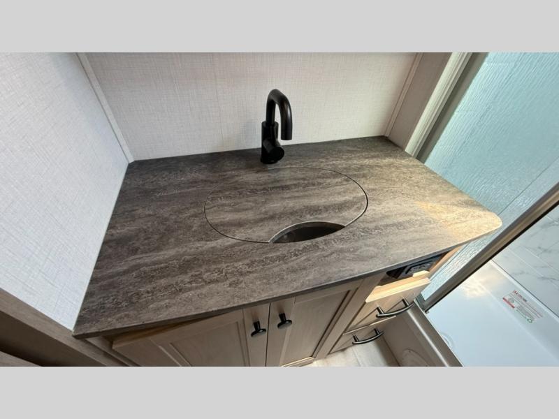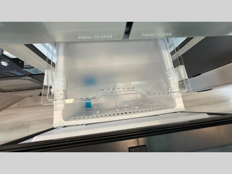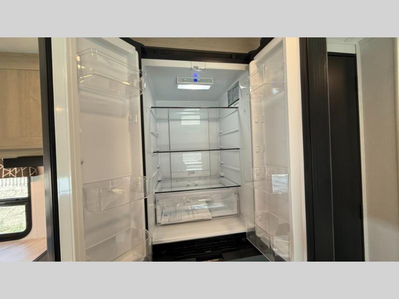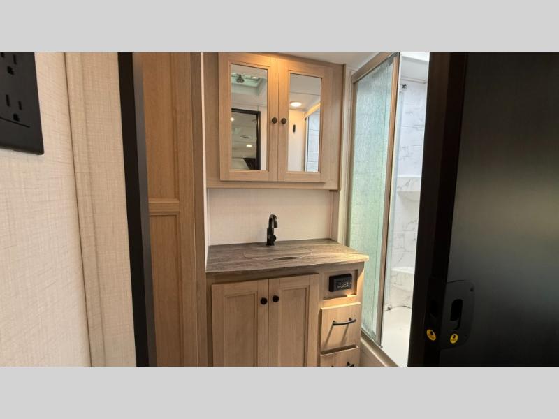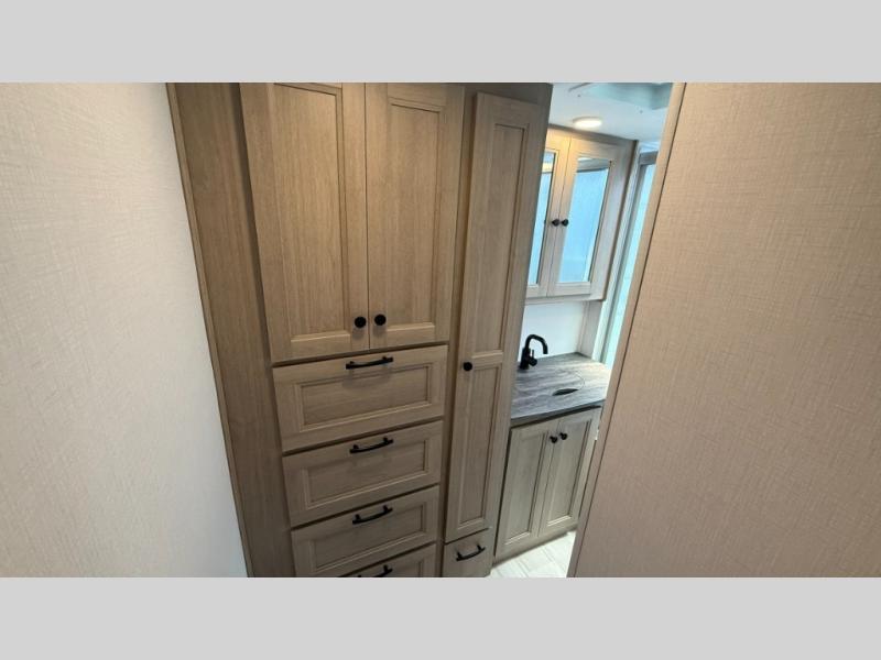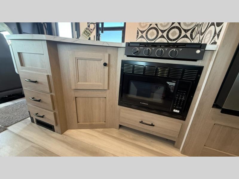 A lot of convenience has been packed into this coach with the full rear bathroom, the master suite, a complete kitchen, two TVs, and a bunk above the cab. An added bonus is the U-shaped dinette which can serve as a dining space or sleeping space depending on how you have it set up. If you don't need the bunk above cab for sleeping space, you could change it out for the optional Trekker cap with built-in entertainment center and storage. The kitchen is equipped with all of your favorites: a pantry, a convection microwave, a three-burner range, a flip-up countertop, and a 10.7-cubic foot refrigerator.