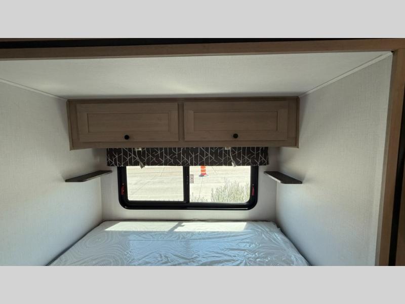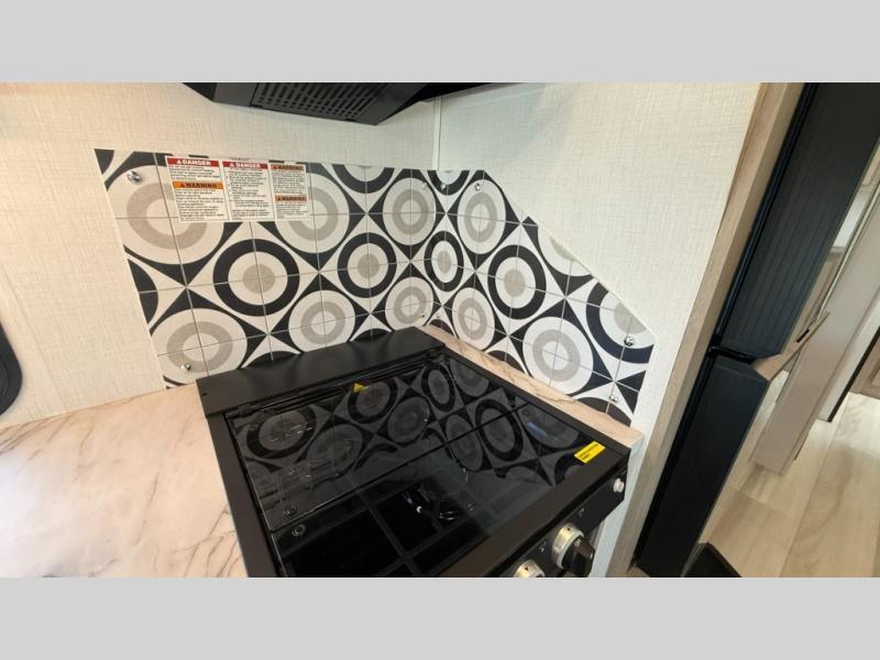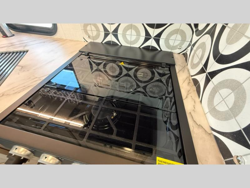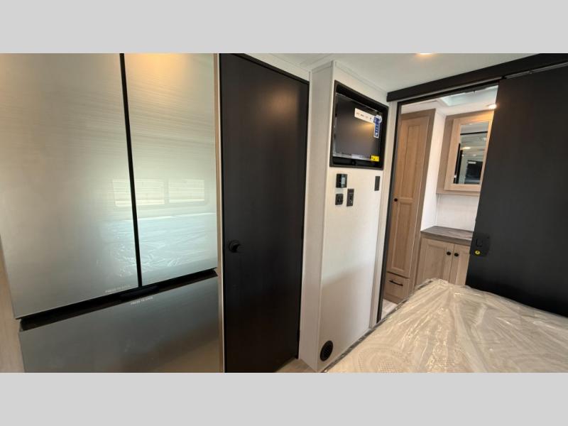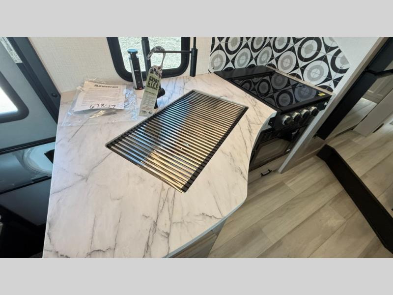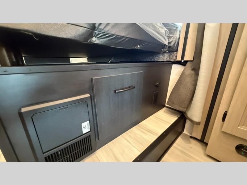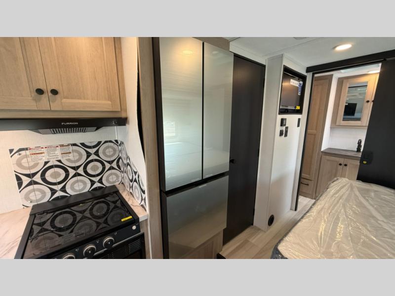 A lot of convenience has been packed into this coach with the full rear bathroom, the master suite, a complete kitchen, two TVs, and a bunk above the cab. An added bonus is the U-shaped dinette which can serve as a dining space or sleeping space depending on how you have it set up. If you don't need the bunk above cab for sleeping space, you could change it out for the optional Trekker cap with built-in entertainment center and storage. The kitchen is equipped with all of your favorites: a pantry, a convection microwave, a three-burner range, a flip-up countertop, and a 10.7-cubic foot refrigerator.