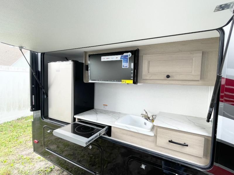 Grab your sunhat and your adventurous spirit and head out with this Sunseeker Classic Class C gas motorhome! There is a rear private bedroom to change your clothes and sleep soundly, and the RV queen bed slide adds more space to this area. The split-style bathroom has a 24" x 36" shower on one side of the coach while the lavatory and vanity stay secluded on the other side. If you don't need the extra sleeping space from the bunk over the cab, you can choose to add the optional Trekker cap with a built-in entertainment center and storage in its place. Sit back with a big bowl of cereal at the booth dinette, or get a little more comfortable on the sofa. You can also go outside to prepare some heartier food at the outdoor kitchen.