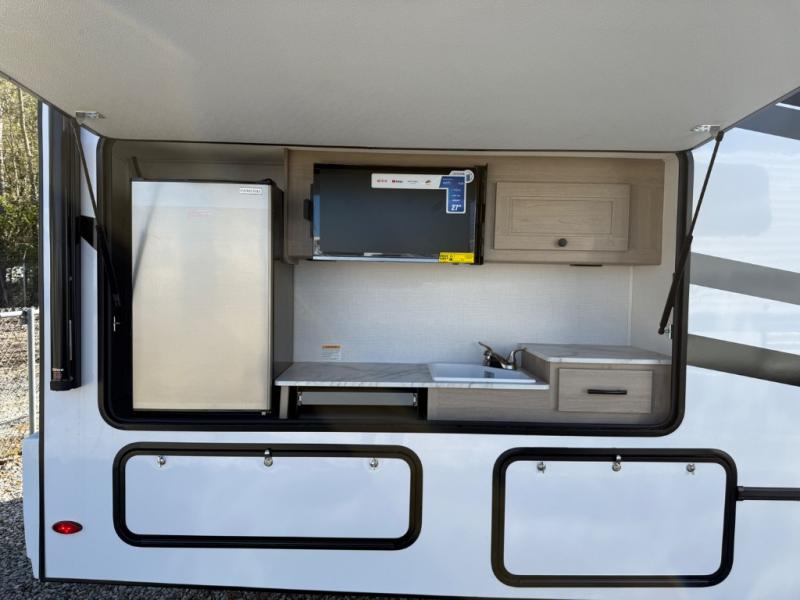 Grab your sunhat and your adventurous spirit and head out with this Sunseeker Classic Class C gas motorhome! There is a rear private bedroom to change your clothes and sleep soundly, and the RV queen bed slide adds more space to this area. The split-style bathroom has a 24" x 36" shower on one side of the coach while the lavatory and vanity stay secluded on the other side. If you don't need the extra sleeping space from the bunk over the cab, you can choose to add the optional Trekker cap with a built-in entertainment center and storage in its place. Sit back with a big bowl of cereal at the booth dinette, or get a little more comfortable on the sofa. You can also go outside to prepare some heartier food at the outdoor kitchen.