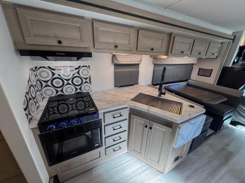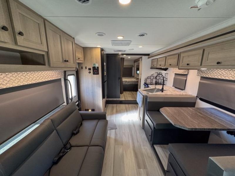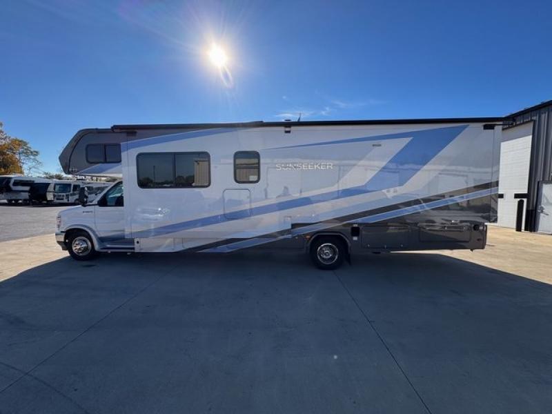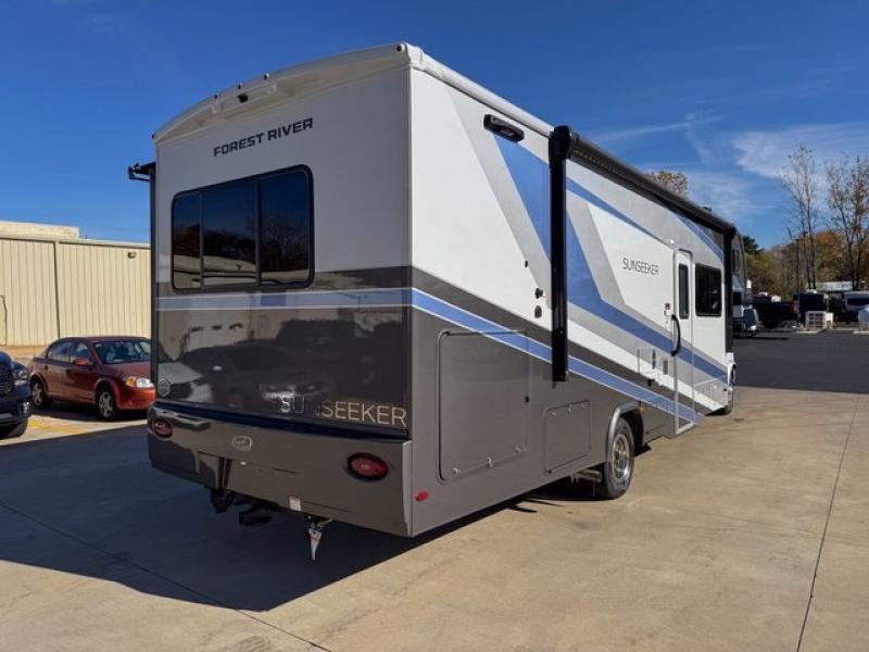 With any Sunseeker Classic Class C gas motorhome by Forest River, you will enjoy more features and quality construction at a great value! Each model comes standard with a fiberglass roof and 2" aluminum framed laminated sidewalls for maximum durability. The Winegard Air 360+ digital antenna is your all-in-one solution for your internet, TV, and FM signal needs, and you have Gateway 4G Wi-Fi capability too. The exterior has an outside shower, heated/enclosed tanks, Rotocast storage compartments, and a power awning with an LED light strip to name a few conveniences. Each drive will be made easy thanks to a 10" touchscreen CarPlay/Android radio with USB and Bluetooth, backup camera/side view cameras with a 3-way monitor, and Ultraleather seating for added comfort. You'll also love the black out roller shades, soft touch self-closing drawer guides, oxygen-infused shower head with a flexible extension, and many more interior comforts!