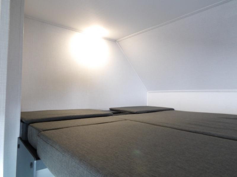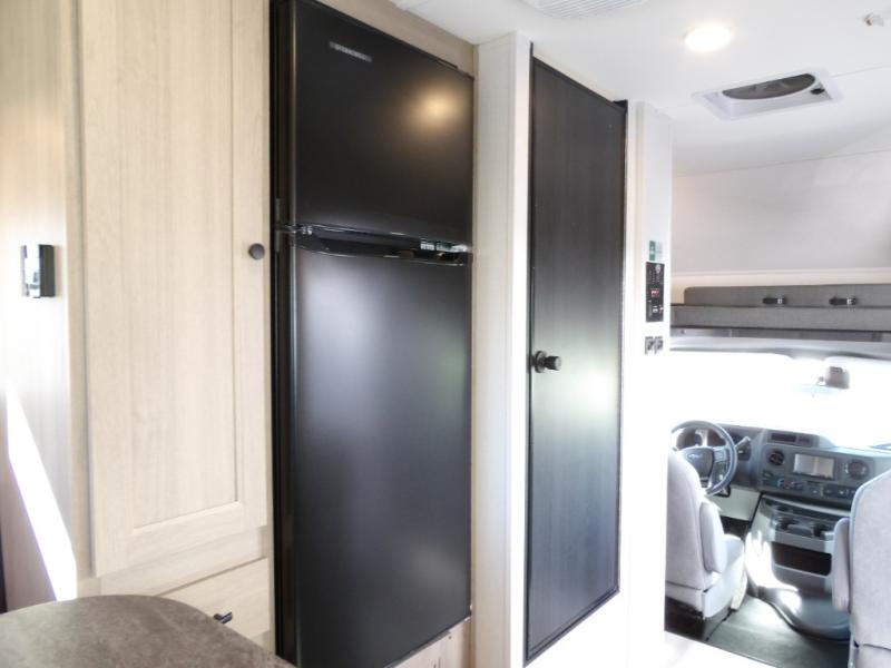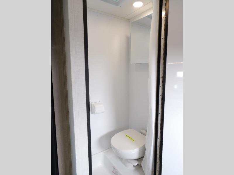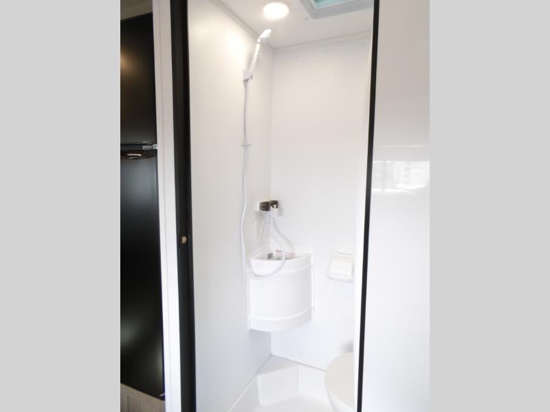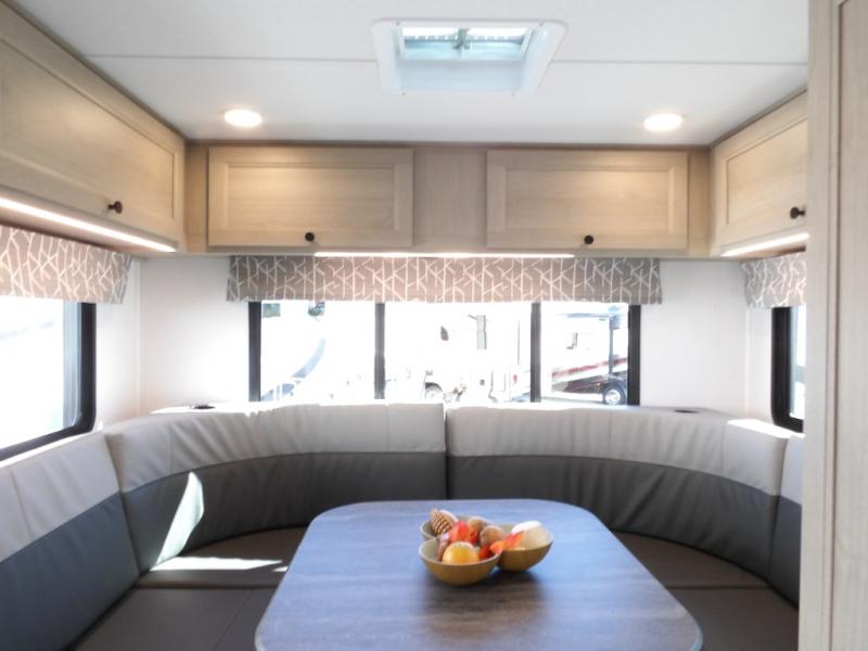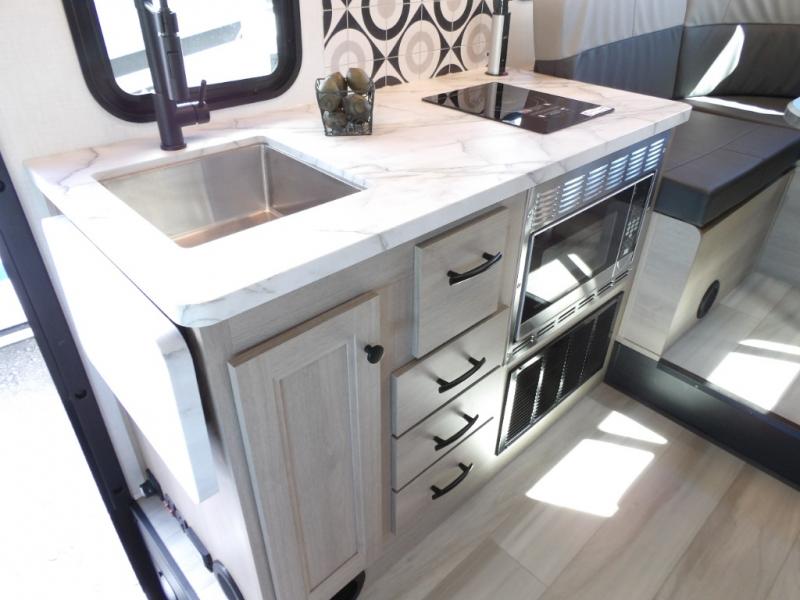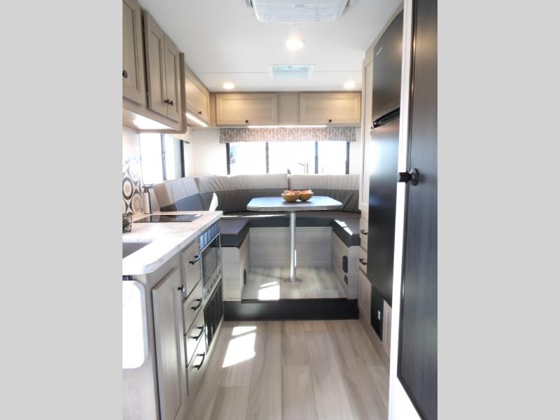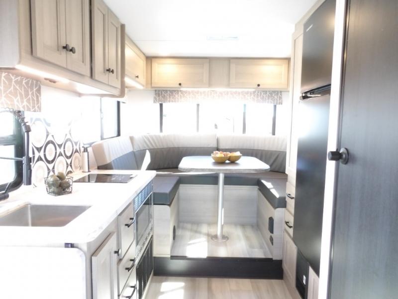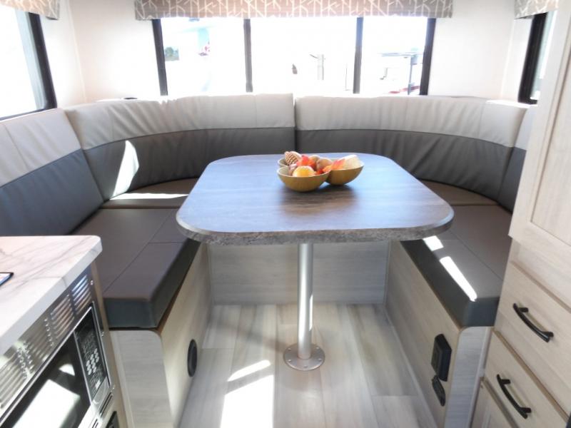 Upon entering this unit, you’re greeted by a spacious 60" x 80" cab-over bunk, providing plenty of comfortable sleeping space for family or guests. Near the entrance, a swing-arm 12V TV lets you enjoy your favorite shows and movies while on the road. Moving toward the center, you’ll find a pantry and a 10.7 cu. ft. refrigerator, perfect for storing both fresh groceries and dry goods. Adjacent to it is the well-designed wet bath, equipped with an oxygen-infused showerhead and flexible extension for a refreshing experience, complemented by a shower skylight and electric roof fan for added light and ventilation. Across the way, the kitchen comes fully equipped with a recessed two-burner range and flush glass cover, a convection microwave/air fryer, and a flip-up countertop that expands your workspace, making meal prep easy and efficient. At the rear, the inviting U-shaped dinette offers a cozy spot to relax, dine, or gather with friends, and at night, it effortlessly converts into an additional sleeping area so you can rest in complete comfort.