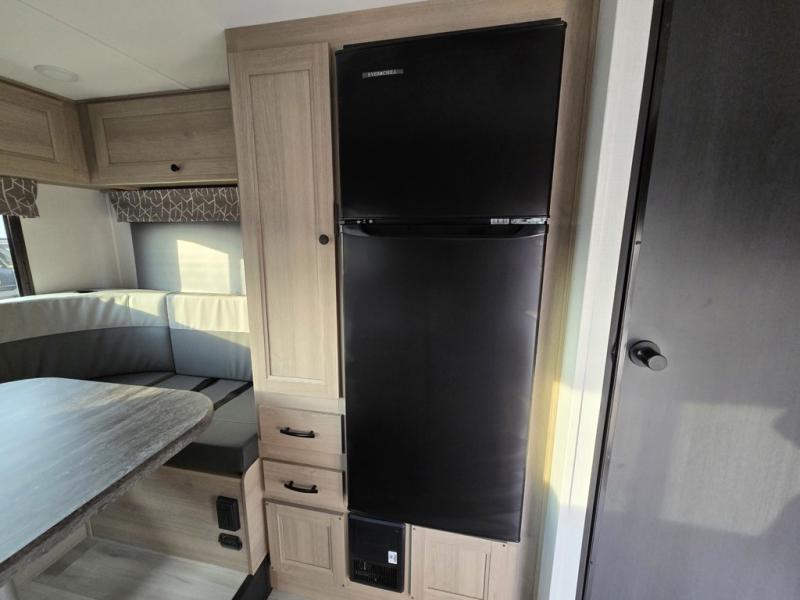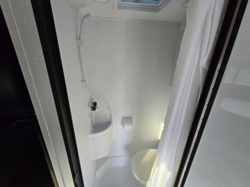 Upon entering this unit, you’re greeted by a spacious 60" x 80" cab-over bunk, providing plenty of comfortable sleeping space for family or guests. Near the entrance, a swing-arm 12V TV lets you enjoy your favorite shows and movies while on the road. Moving toward the center, you’ll find a pantry and a 10.7 cu. ft. refrigerator, perfect for storing both fresh groceries and dry goods. Adjacent to it is the well-designed wet bath, equipped with an oxygen-infused showerhead and flexible extension for a refreshing experience, complemented by a shower skylight and electric roof fan for added light and ventilation. Across the way, the kitchen comes fully equipped with a recessed two-burner range and flush glass cover, a convection microwave/air fryer, and a flip-up countertop that expands your workspace, making meal prep easy and efficient. At the rear, the inviting U-shaped dinette offers a cozy spot to relax, dine, or gather with friends, and at night, it effortlessly converts into an additional sleeping area so you can rest in complete comfort.