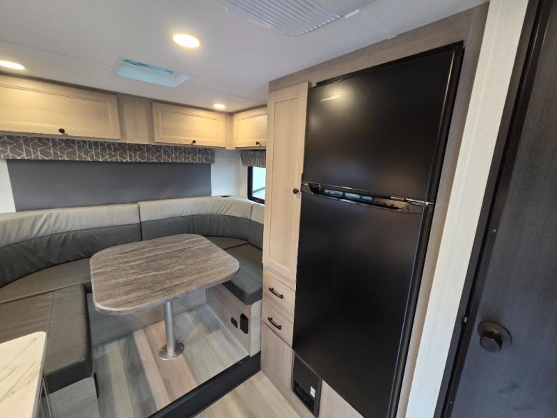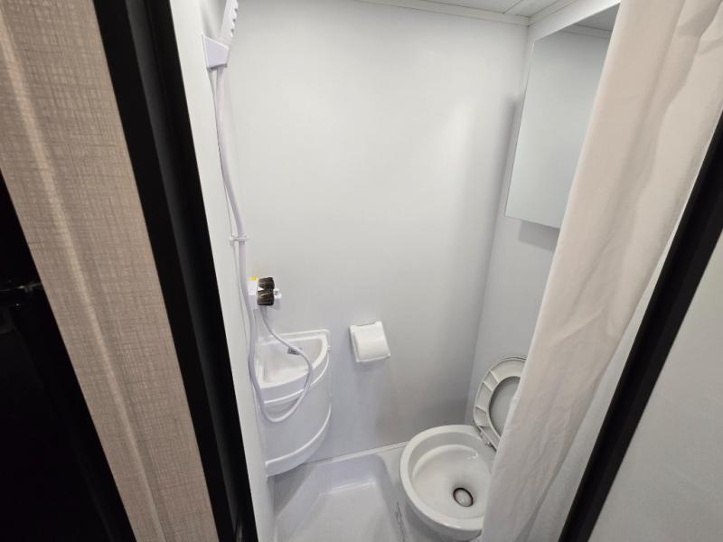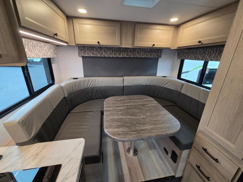 Upon entering this unit, you’re greeted by a spacious 60" x 80" cab-over bunk, providing plenty of comfortable sleeping space for family or guests. Near the entrance, a swing-arm 12V TV lets you enjoy your favorite shows and movies while on the road. Moving toward the center, you’ll find a pantry and a 10.7 cu. ft. refrigerator, perfect for storing both fresh groceries and dry goods. Adjacent to it is the well-designed wet bath, equipped with an oxygen-infused showerhead and flexible extension for a refreshing experience, complemented by a shower skylight and electric roof fan for added light and ventilation. Across the way, the kitchen comes fully equipped with a recessed two-burner range and flush glass cover, a convection microwave/air fryer, and a flip-up countertop that expands your workspace, making meal prep easy and efficient. At the rear, the inviting U-shaped dinette offers a cozy spot to relax, dine, or gather with friends, and at night, it effortlessly converts into an additional sleeping area so you can rest in complete comfort.