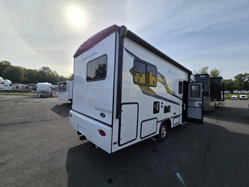 You'll want to plan more trips with this Sunseeker LE Class C gas motorhome! The queen-size bed can be sectioned off into a semi-private bedroom when you draw the privacy curtain, and the bathroom is also included in this space, so this creates a makeshift master suite. The U-shaped dinette has four seatbelts for traveling, and it also has two large storage drawers for keeping your board games and kitchen supplies hidden away. The kitchen includes a recessed three-burner range that you can use whenever you want to fry up some pancakes, and there is a convection microwave that will allow you to prepare fast meals. A cordless 12V charging plate is also included in the kitchen, and it allows you to charge your electronic devices.