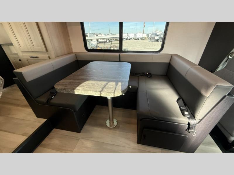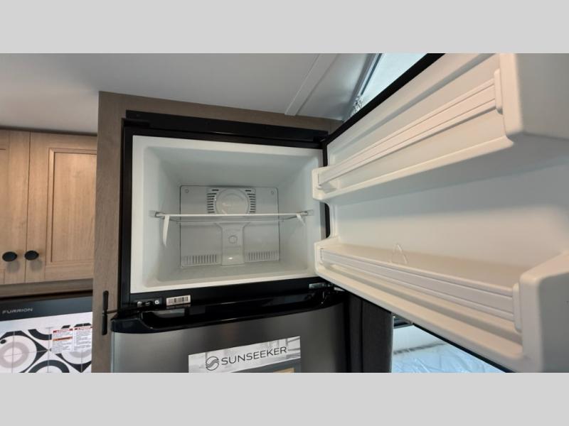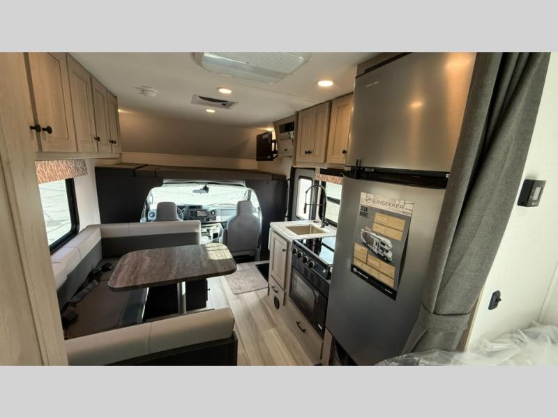 You'll want to plan more trips with this Sunseeker LE Class C gas motorhome! The queen-size bed can be sectioned off into a semi-private bedroom when you draw the privacy curtain, and the bathroom is also included in this space, so this creates a makeshift master suite. The U-shaped dinette has four seatbelts for traveling. The kitchen includes a recessed three-burner range that you can use whenever you want to fry up some pancakes, and there is a convection microwave that will allow you to prepare fast meals. A cordless 12V charging plate is also included in the kitchen, and it allows you to charge your electronic devices.