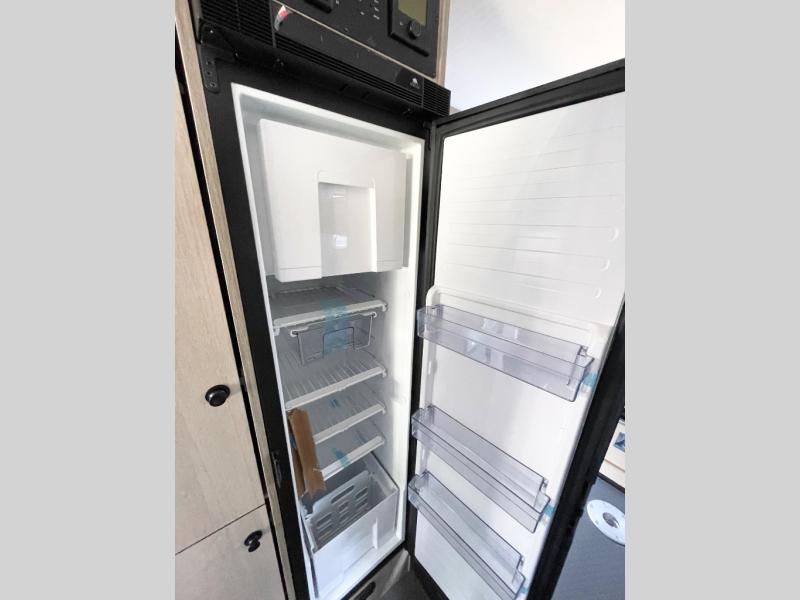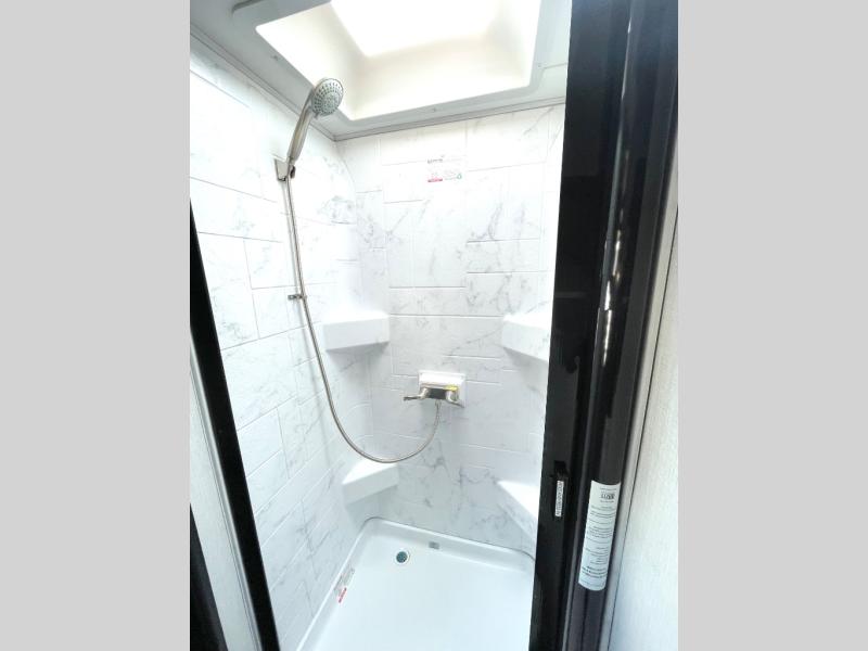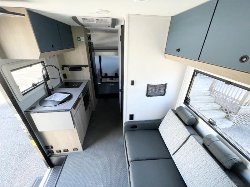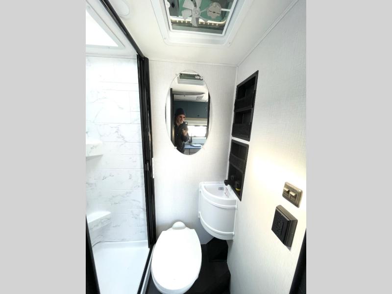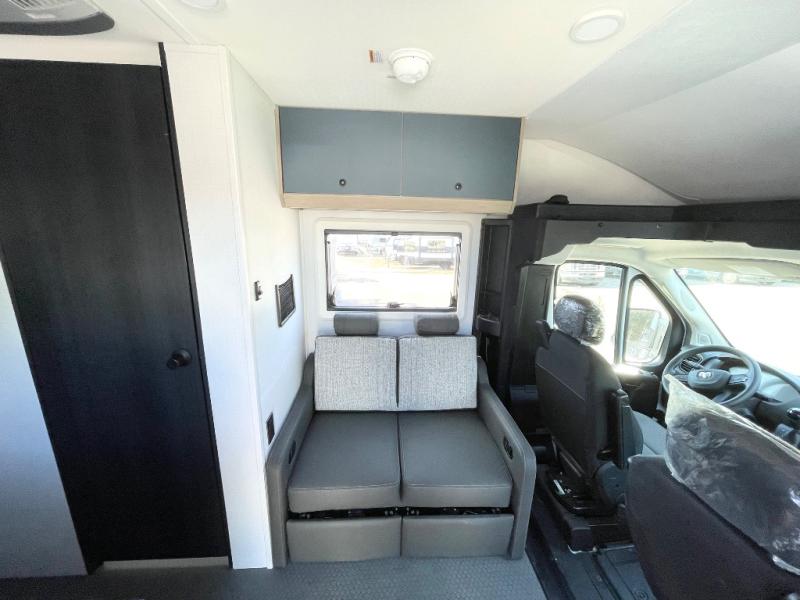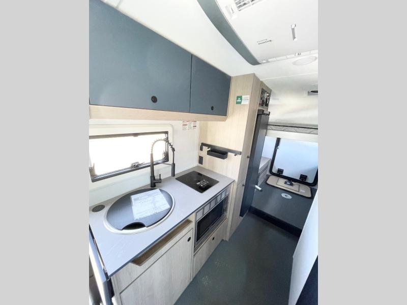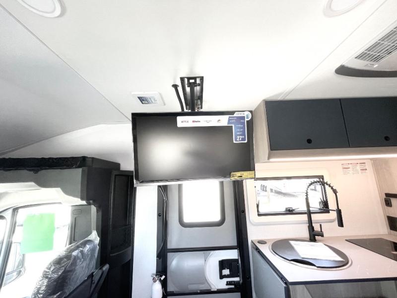 This compact coach is ready for adventure when you are! The swivel captain's seats can be turned around once you park so you can visit with those on the sofa. The mid-coach full bath will allow you to freshen up daily, and there is a shower skylight to provide more head room and natural lighting. When you're ready for lunch, you can prepare it on the single burner induction cooktop or in the microwave with an air fryer. There is also a flip-up countertop for more prep space plus a 12V refrigerator and pantry for food storage. In the back there are dual cabinets below a Euro power lift bed that will provide versatile sleeping space, plus there is a rear access door to let fresh air in and easily unpack gear!