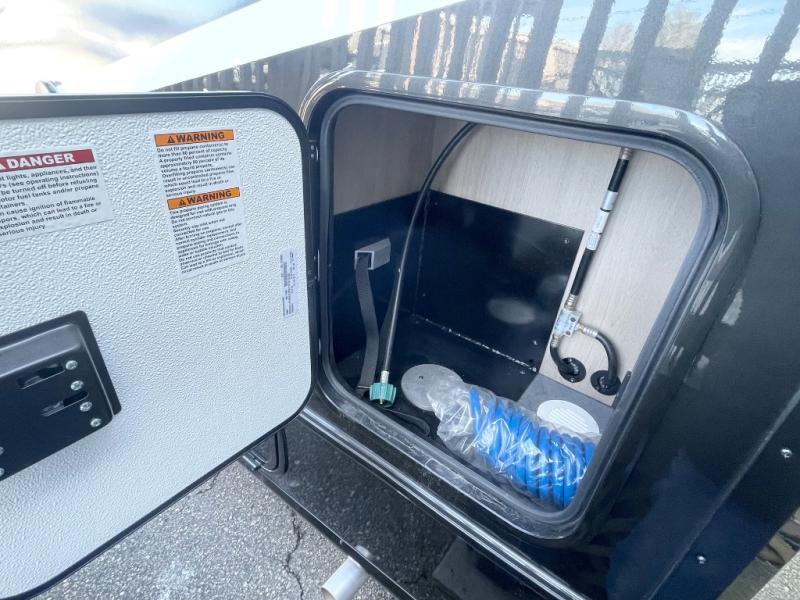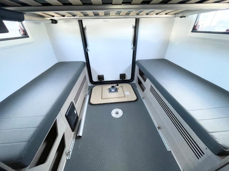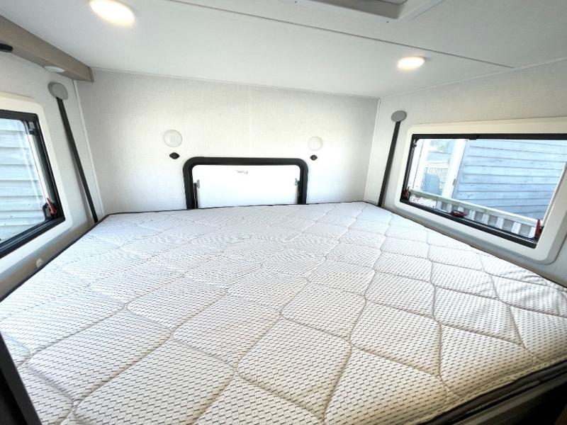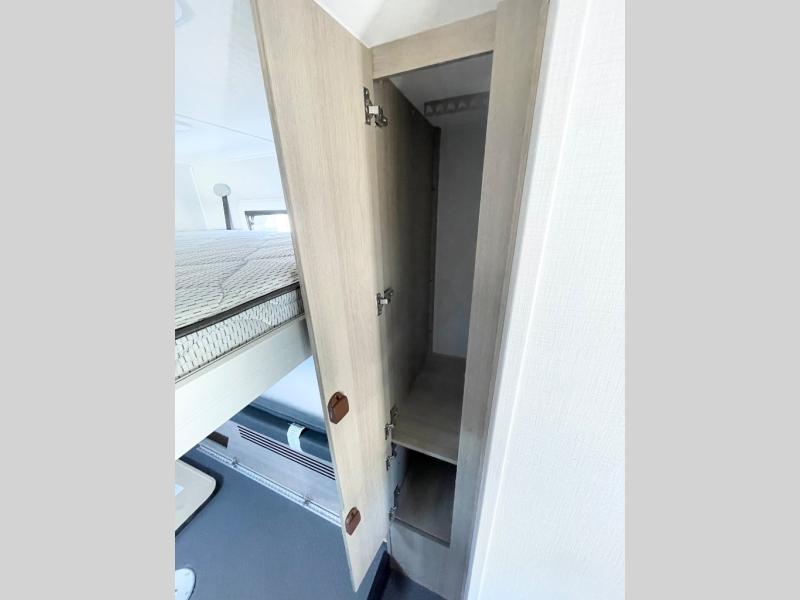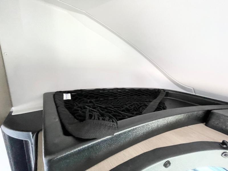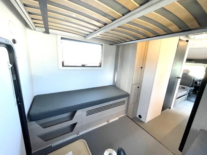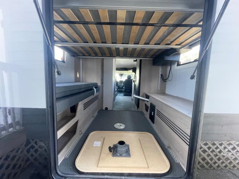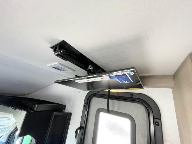 This compact coach is ready for adventure when you are! The swivel captain's seats can be turned around once you park so you can visit with those on the sofa. The mid-coach full bath will allow you to freshen up daily, and there is a shower skylight to provide more head room and natural lighting. When you're ready for lunch, you can prepare it on the single burner induction cooktop or in the microwave with an air fryer. There is also a flip-up countertop for more prep space plus a 12V refrigerator and pantry for food storage. In the back there are dual cabinets below a Euro power lift bed that will provide versatile sleeping space, plus there is a rear access door to let fresh air in and easily unpack gear!