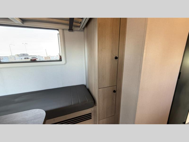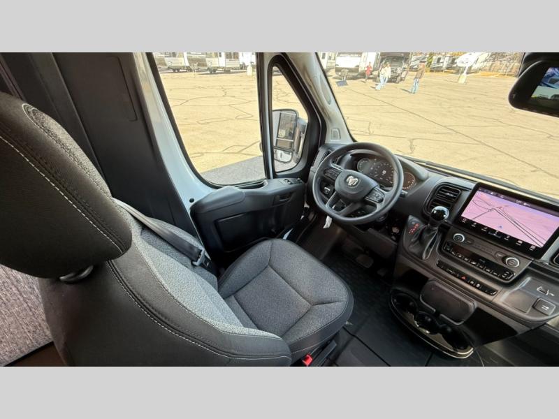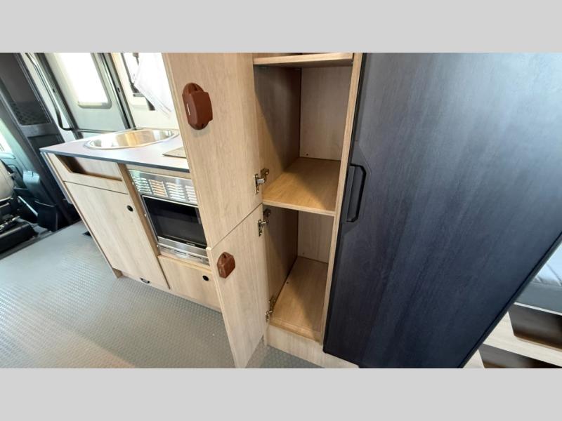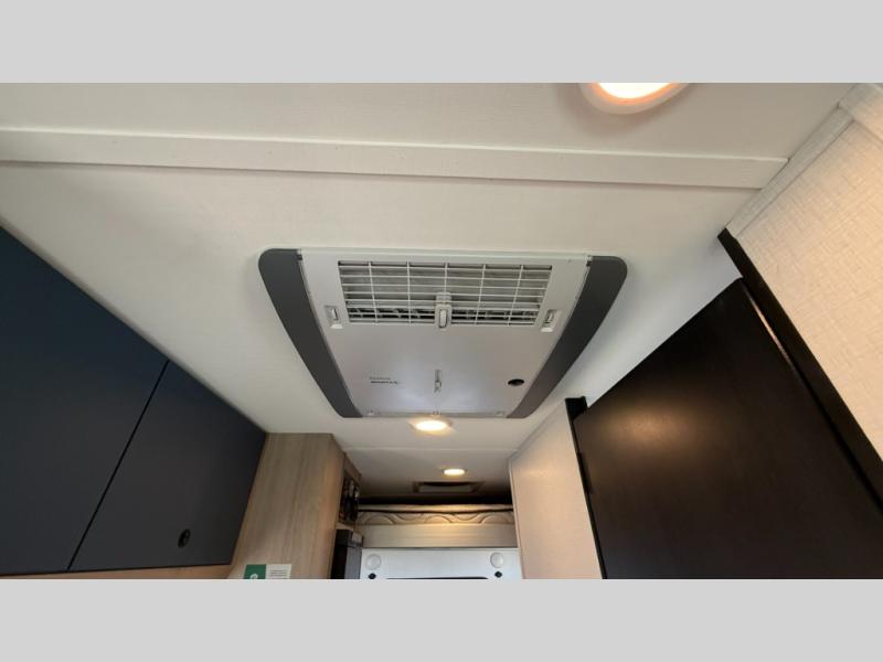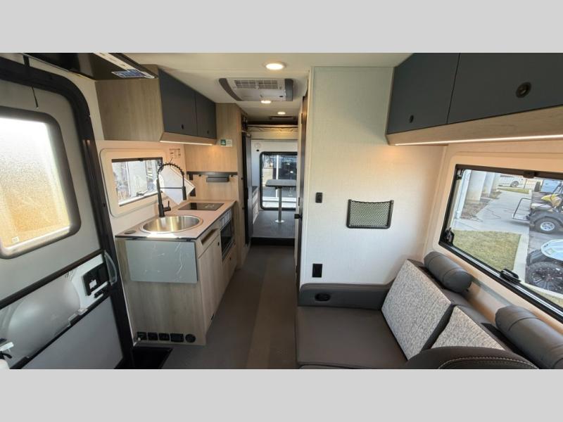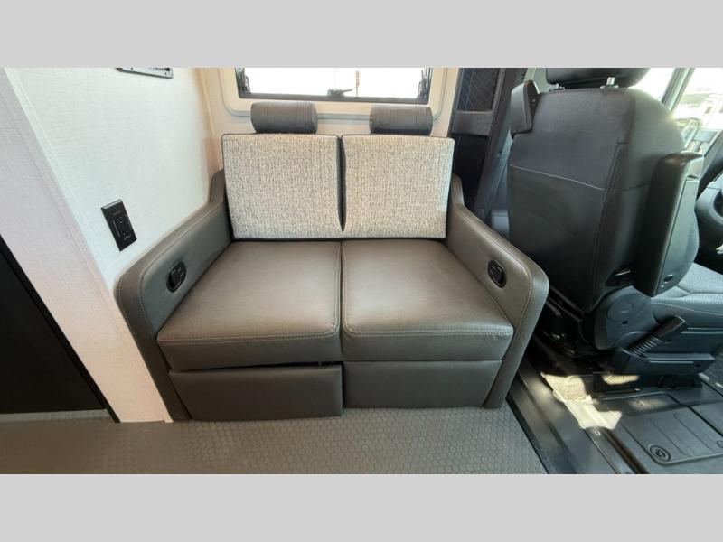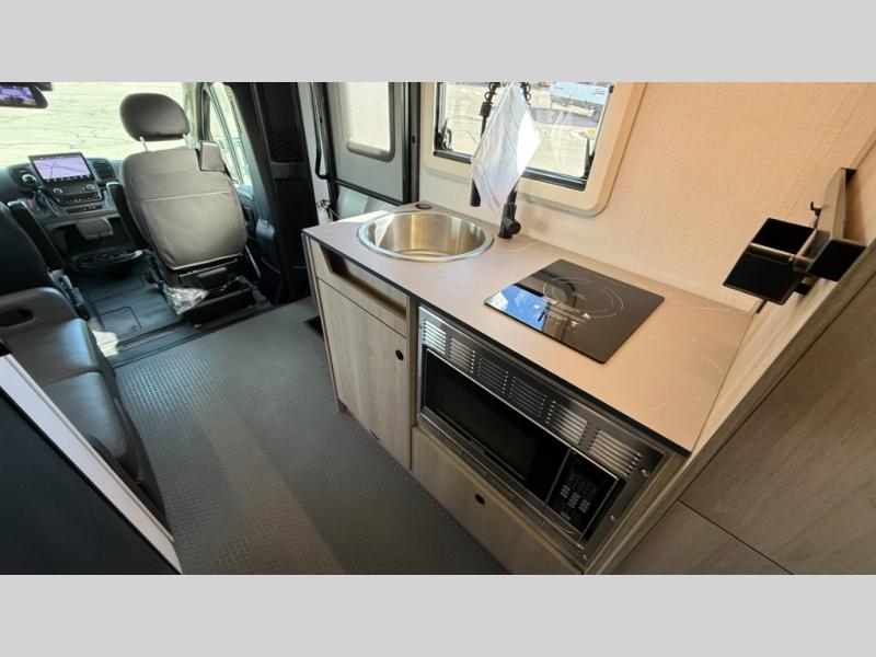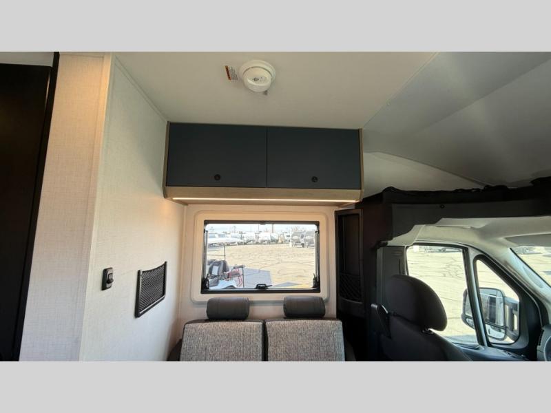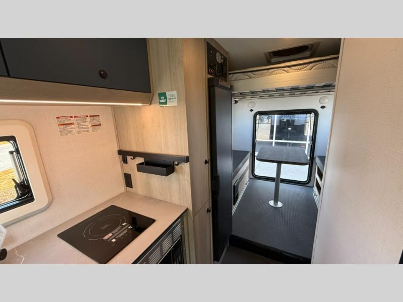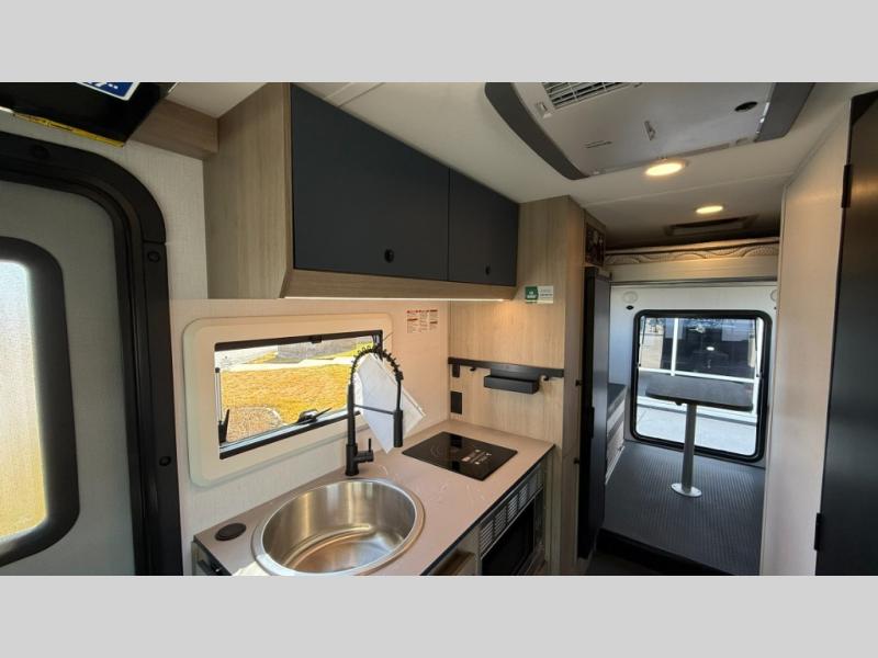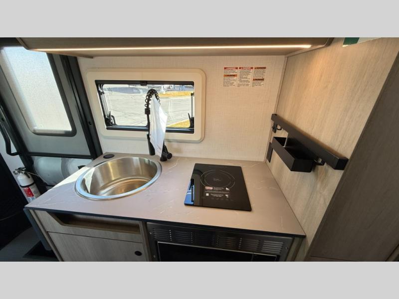 This compact coach is ready for adventure when you are! The swivel captain's seats can be turned around once you park so you can visit with those on the sofa. The mid-coach full bath will allow you to freshen up daily, and there is a shower skylight to provide more head room and natural lighting. When you're ready for lunch, you can prepare it on the single burner induction cooktop or in the microwave with an air fryer. There is also a flip-up countertop for more prep space plus a 12V refrigerator and pantry for food storage. In the back there are dual cabinets below a Euro power lift bed that will provide versatile sleeping space, plus there is a rear access door to let fresh air in and easily unpack gear!