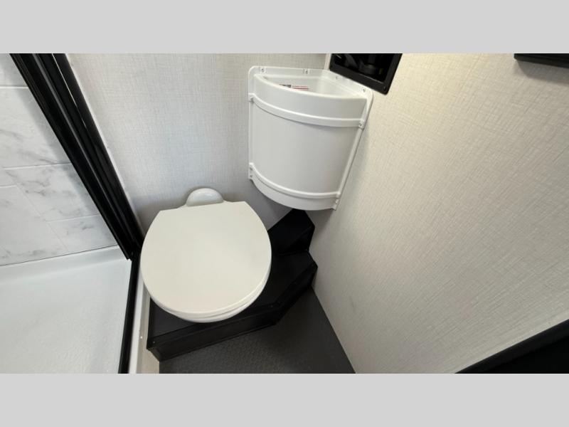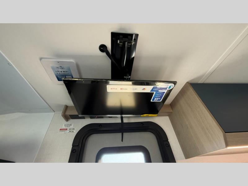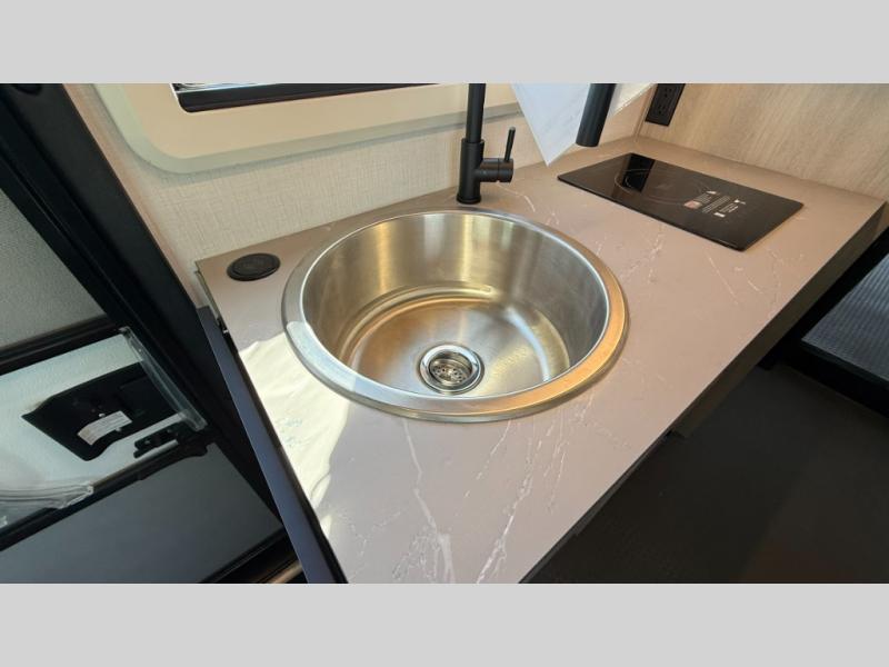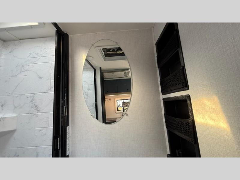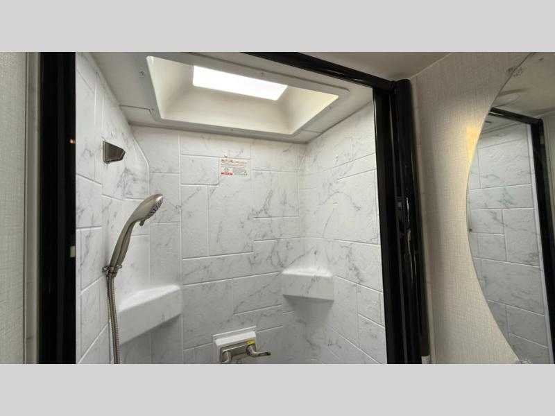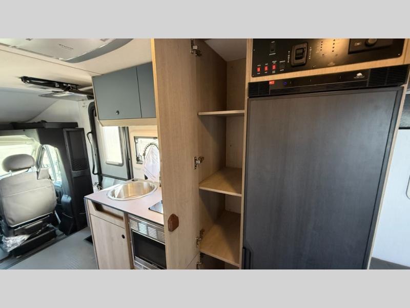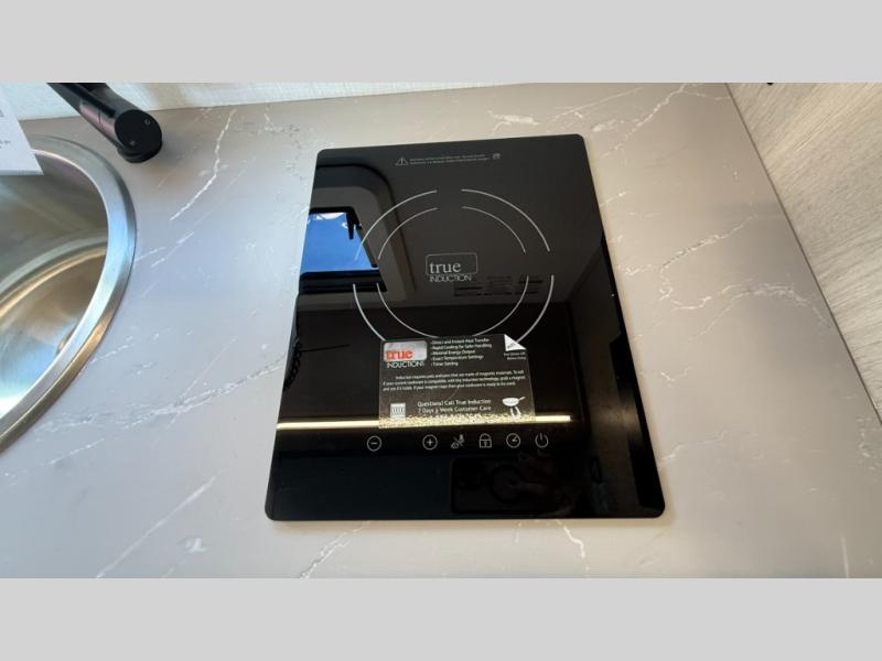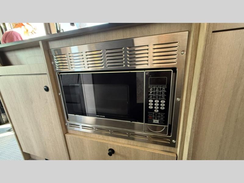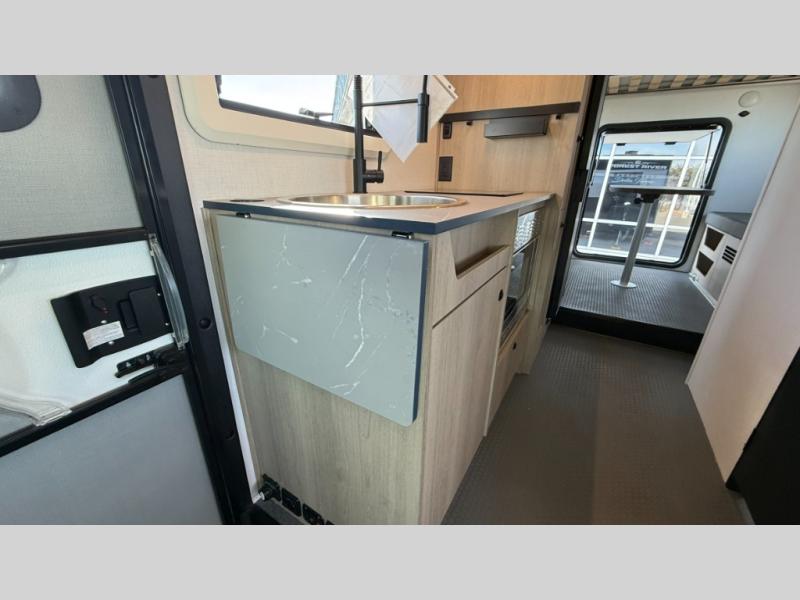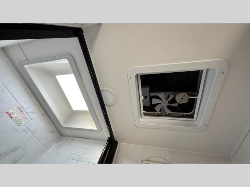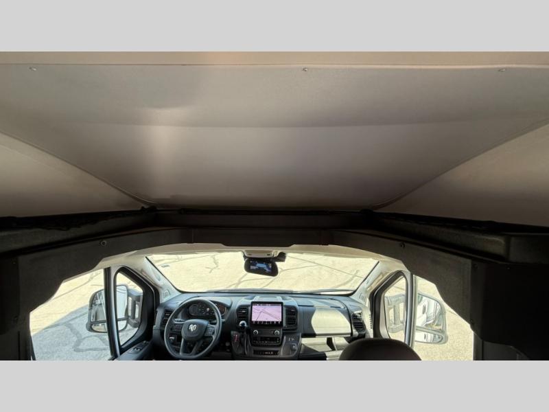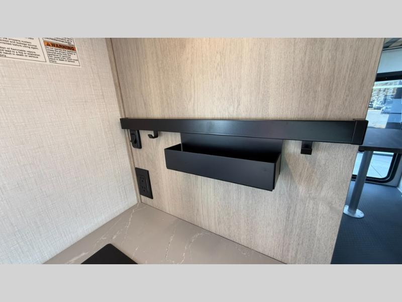 This compact coach is ready for adventure when you are! The swivel captain's seats can be turned around once you park so you can visit with those on the sofa. The mid-coach full bath will allow you to freshen up daily, and there is a shower skylight to provide more head room and natural lighting. When you're ready for lunch, you can prepare it on the single burner induction cooktop or in the microwave with an air fryer. There is also a flip-up countertop for more prep space plus a 12V refrigerator and pantry for food storage. In the back there are dual cabinets below a Euro power lift bed that will provide versatile sleeping space, plus there is a rear access door to let fresh air in and easily unpack gear!