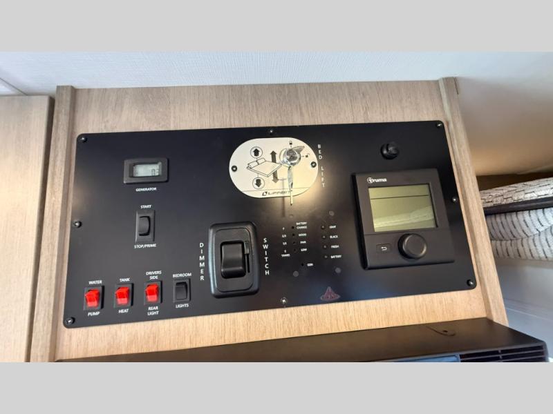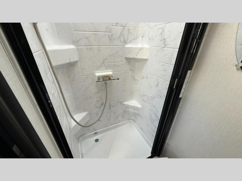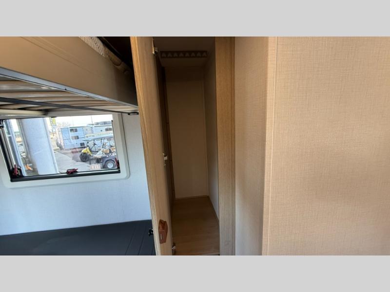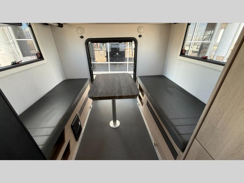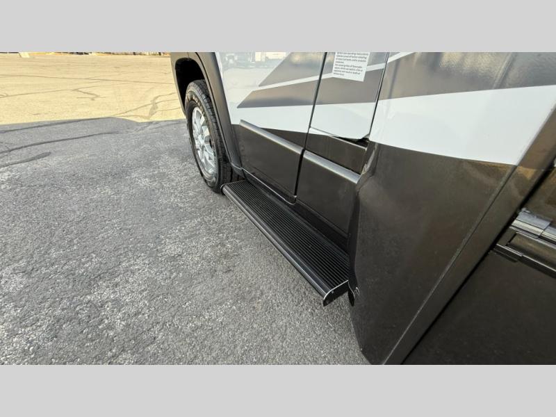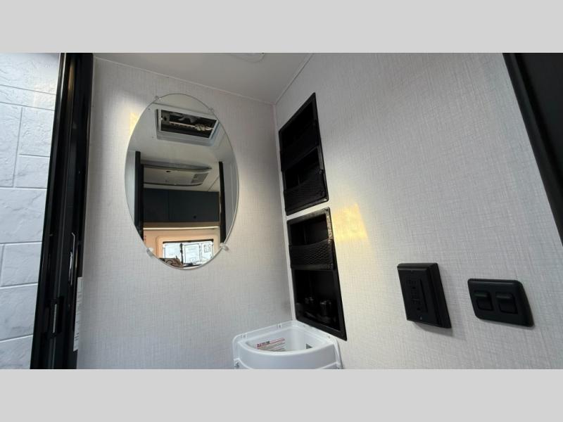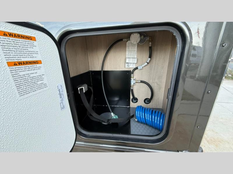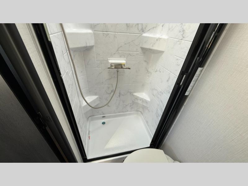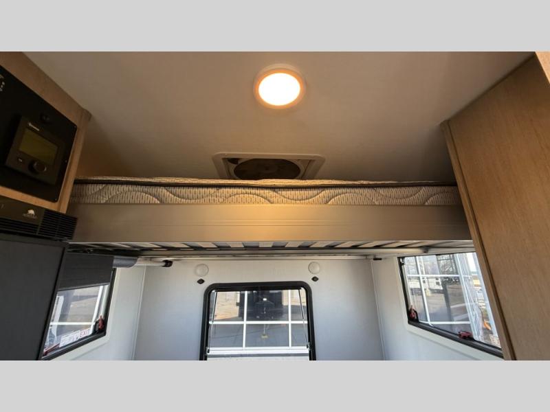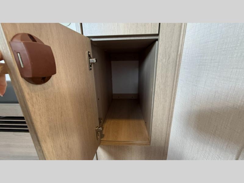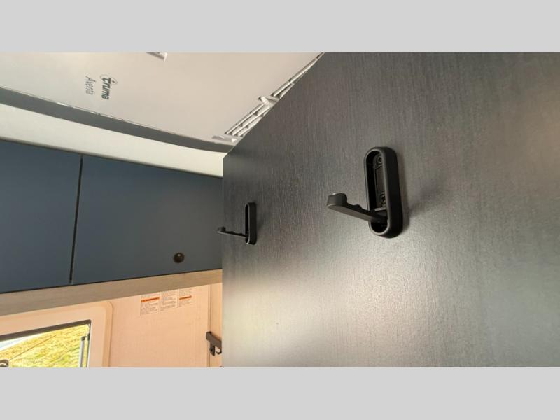 This compact coach is ready for adventure when you are! The swivel captain's seats can be turned around once you park so you can visit with those on the sofa. The mid-coach full bath will allow you to freshen up daily, and there is a shower skylight to provide more head room and natural lighting. When you're ready for lunch, you can prepare it on the single burner induction cooktop or in the microwave with an air fryer. There is also a flip-up countertop for more prep space plus a 12V refrigerator and pantry for food storage. In the back there are dual cabinets below a Euro power lift bed that will provide versatile sleeping space, plus there is a rear access door to let fresh air in and easily unpack gear!