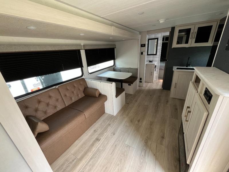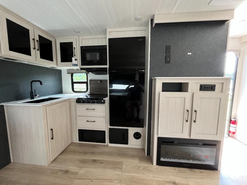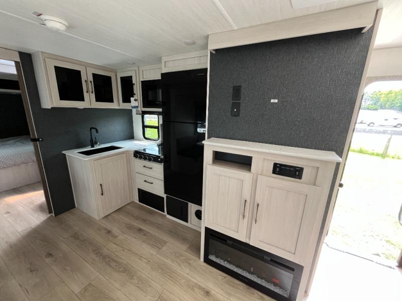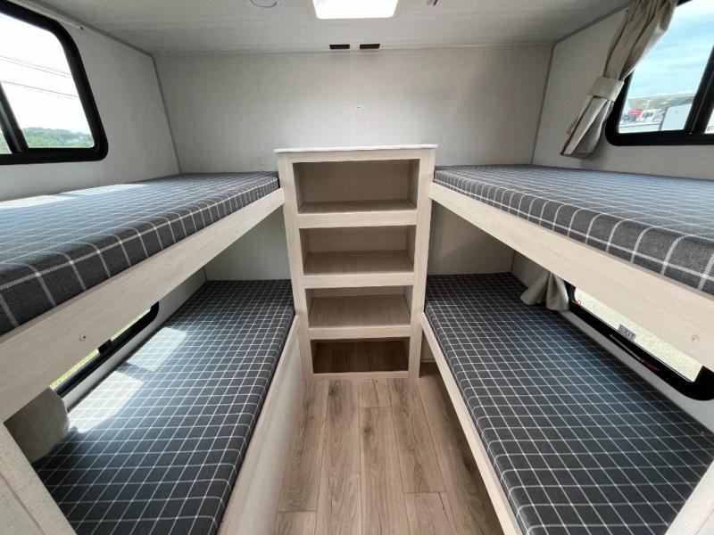Head to your favorite camping spot with your favorite people in this spacious, dual entry travel trailer! The large slide out houses the booth dinette and sofa where you can relax in the evenings and even let guests sleep over who haven't claimed the quad bunks in the rear bunkhouse. A walk-thru bath is convenient for all, and the full kitchen lets you whip up your best meals in the microwave with an air fryer. And a walk-in pantry with washer and dryer prep makes it easier to go full-time if you choose! When it's time to call it a night, the front master bedroom with a queen bed will provide you with your own space to retreat to, and there are dual bedside wardrobes to keep your clothes organized.