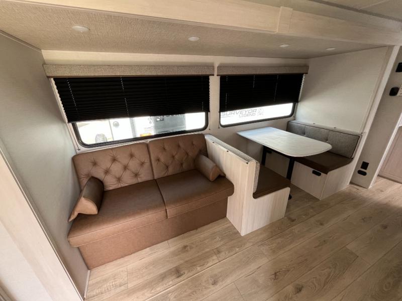 Value and versatility go hand-in-hand with the Surveyor Camp Series travel trailers by Forest River. The solid construction includes a 2" aluminum framed floor with block foam insulation and a sealed underbelly with forced heat and radiant foil insulation. A 100-watt roof mounted solar panel will provide some off-grid power, and the power tongue jack will let you easily hitch up and go whenever you're ready. Additional stand-out features include Surf(X) seamless countertops throughout, two A/C units, an electric awning with LED light strip, black glass friction hinge entry door(s), and so much more!