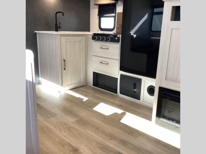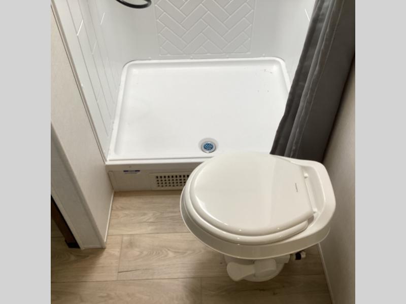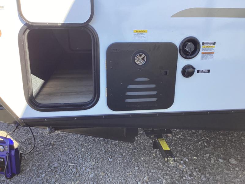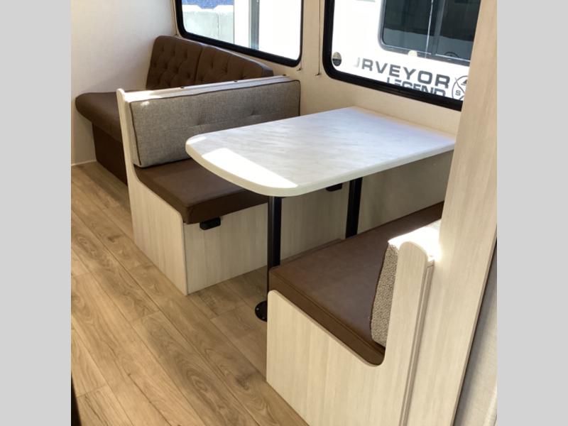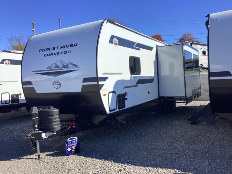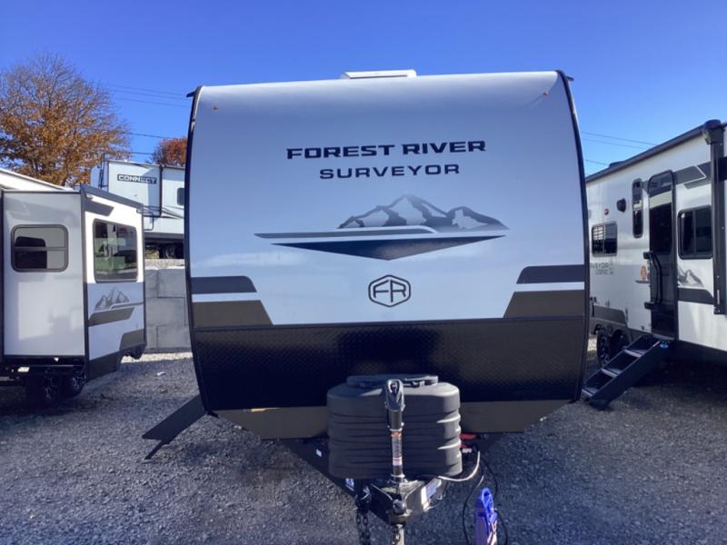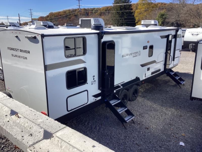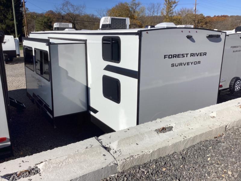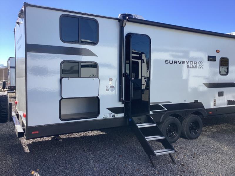 Value and versatility go hand-in-hand with the Surveyor Camp Series travel trailers by Forest River. The solid construction includes a 2" aluminum framed floor with block foam insulation and a sealed underbelly with forced heat and radiant foil insulation. A 100-watt roof mounted solar panel will provide some off-grid power, and the power tongue jack will let you easily hitch up and go whenever you're ready. Additional stand-out features include Surf(X) seamless countertops throughout, two A/C units, an electric awning with LED light strip, black glass friction hinge entry door(s), and so much more!