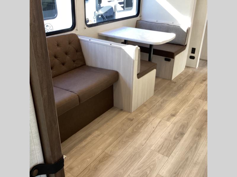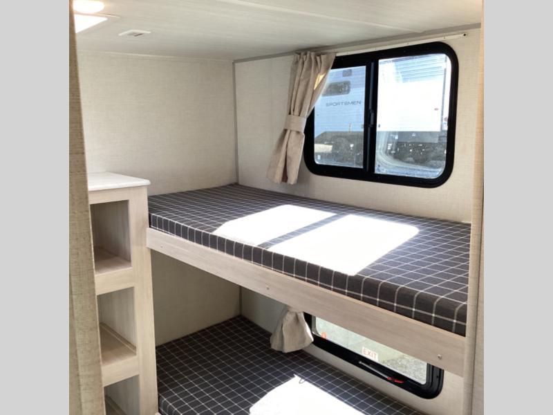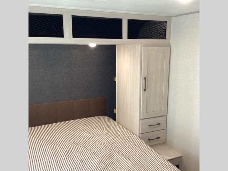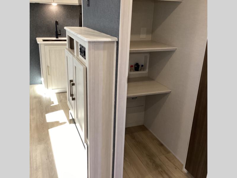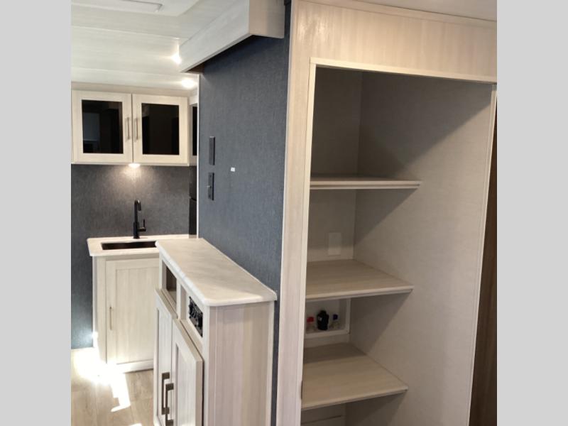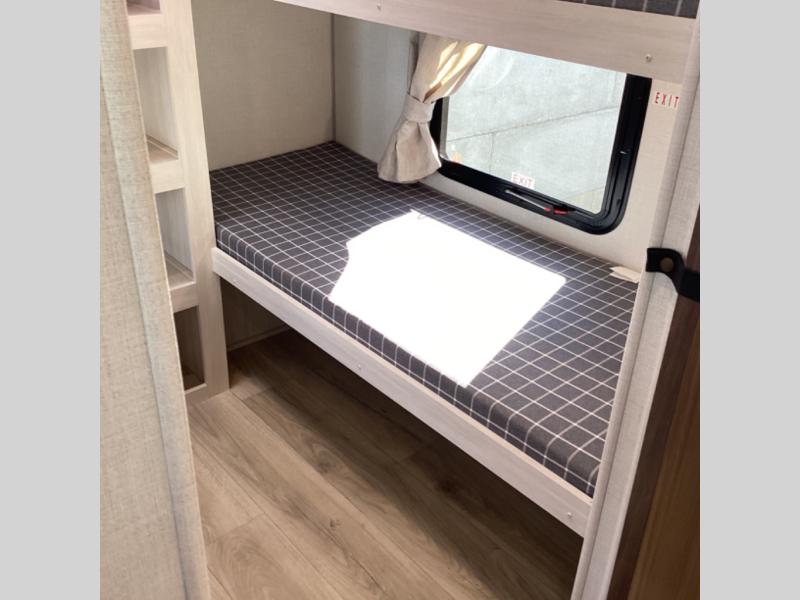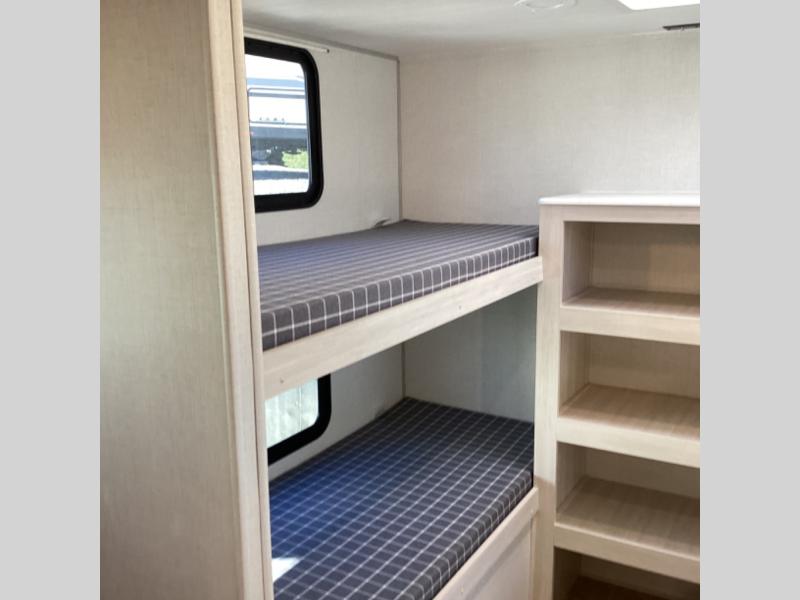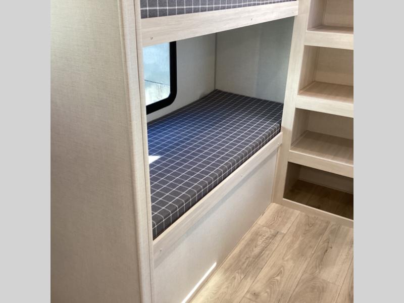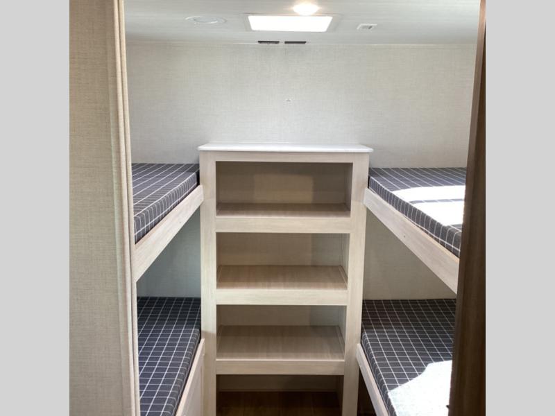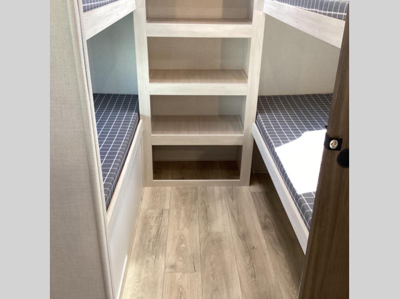 Head to your favorite camping spot with your favorite people in this spacious, dual entry travel trailer! The large slide out houses the booth dinette and sofa where you can relax in the evenings and even let guests sleep over who haven't claimed the quad bunks in the rear bunkhouse. A walk-thru bath is convenient for all, and the full kitchen lets you whip up your best meals in the microwave with an air fryer. And a walk-in pantry with washer and dryer prep makes it easier to go full-time if you choose! When it's time to call it a night, the front master bedroom with a queen bed will provide you with your own space to retreat to, and there are dual bedside wardrobes to keep your clothes organized.