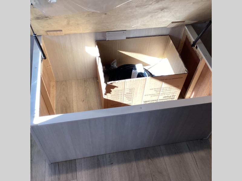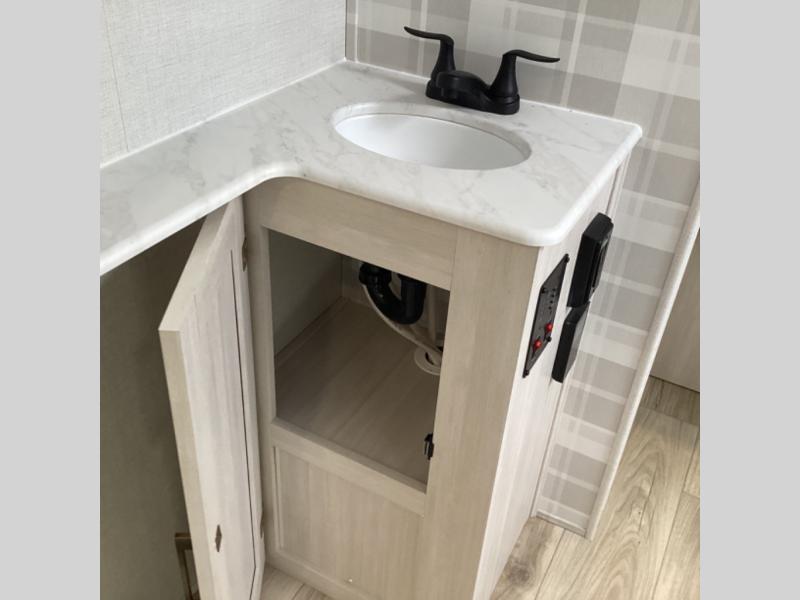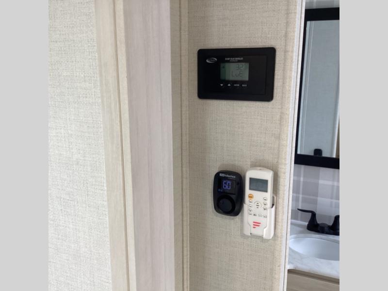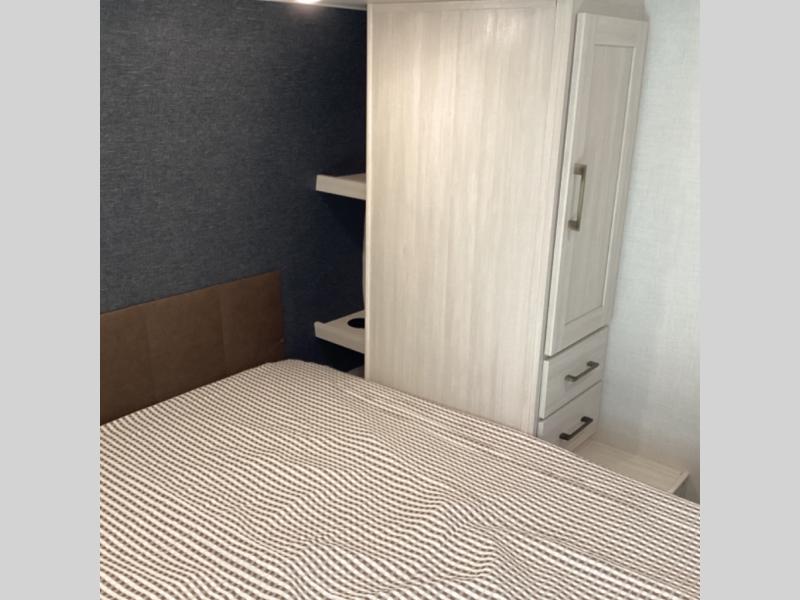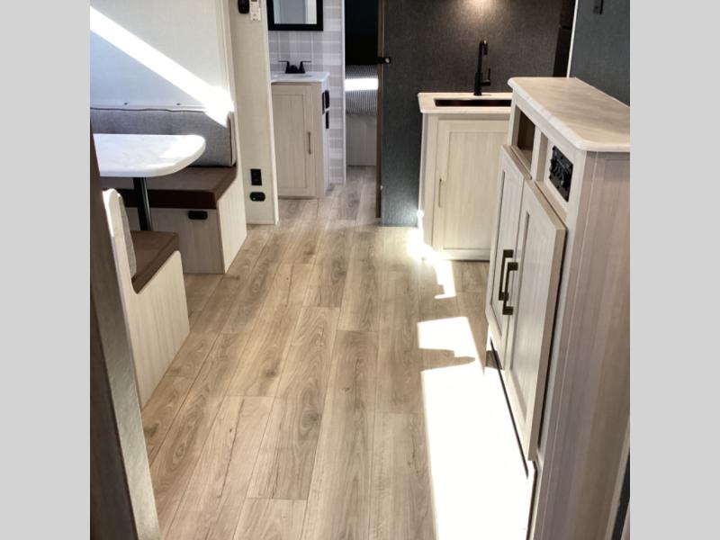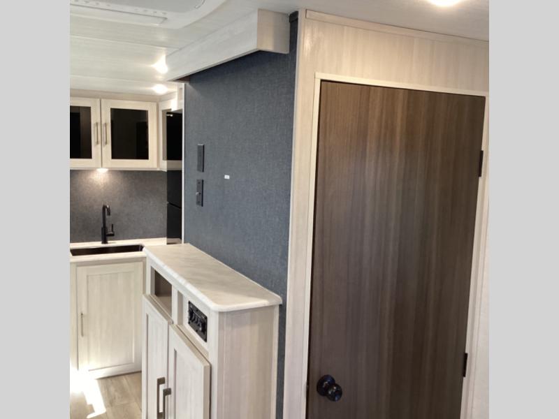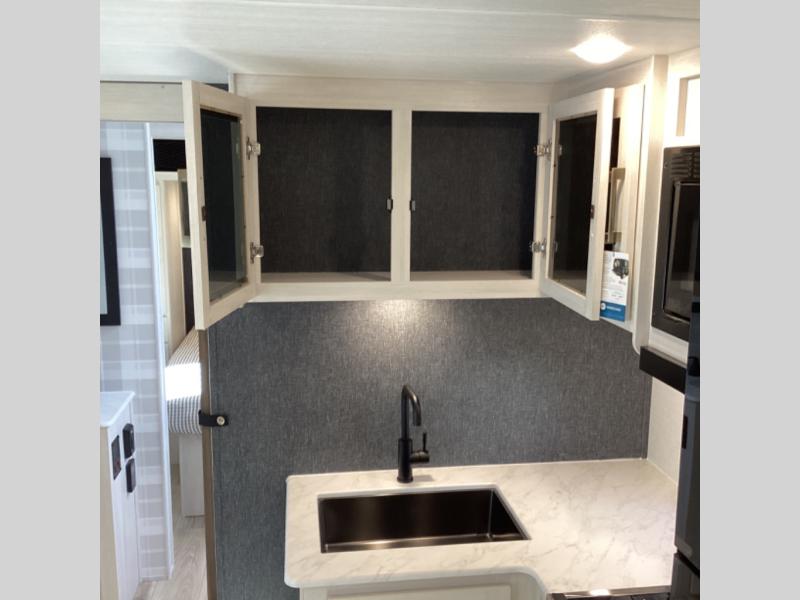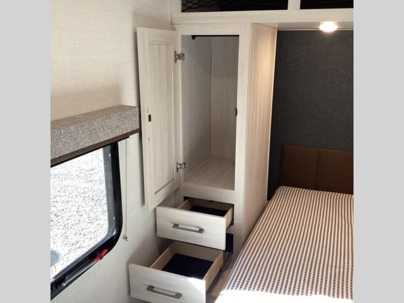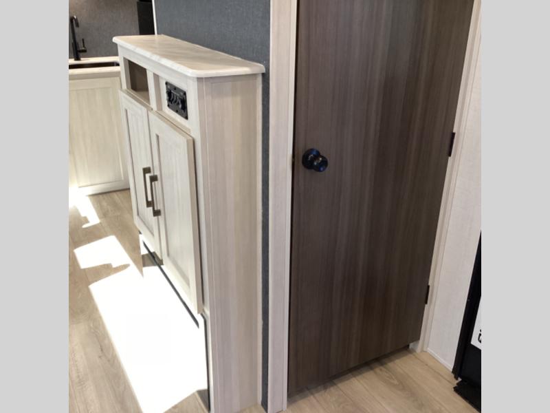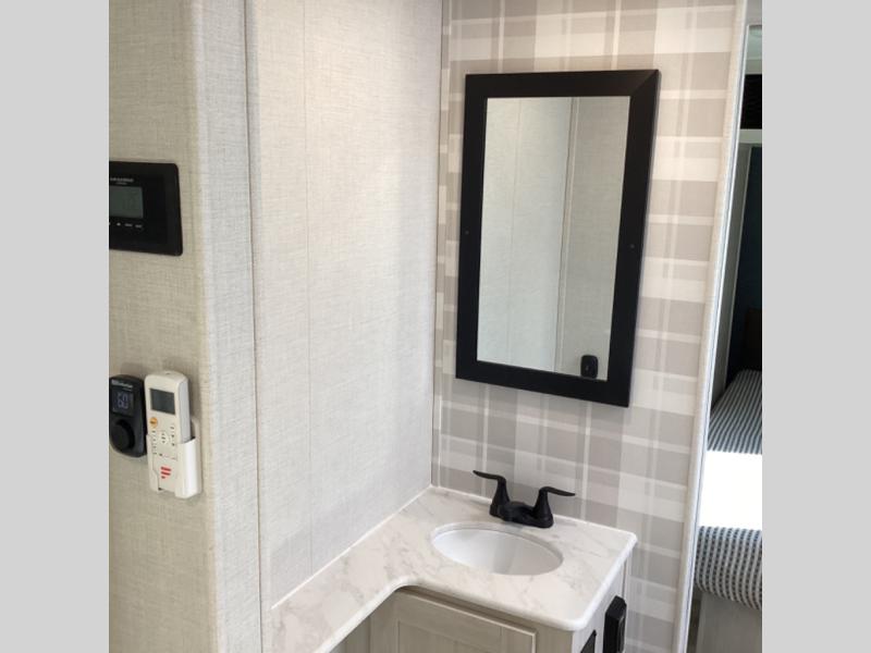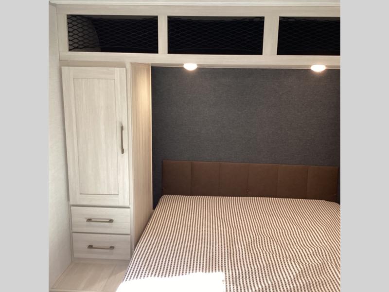 Head to your favorite camping spot with your favorite people in this spacious, dual entry travel trailer! The large slide out houses the booth dinette and sofa where you can relax in the evenings and even let guests sleep over who haven't claimed the quad bunks in the rear bunkhouse. A walk-thru bath is convenient for all, and the full kitchen lets you whip up your best meals in the microwave with an air fryer. And a walk-in pantry with washer and dryer prep makes it easier to go full-time if you choose! When it's time to call it a night, the front master bedroom with a queen bed will provide you with your own space to retreat to, and there are dual bedside wardrobes to keep your clothes organized.