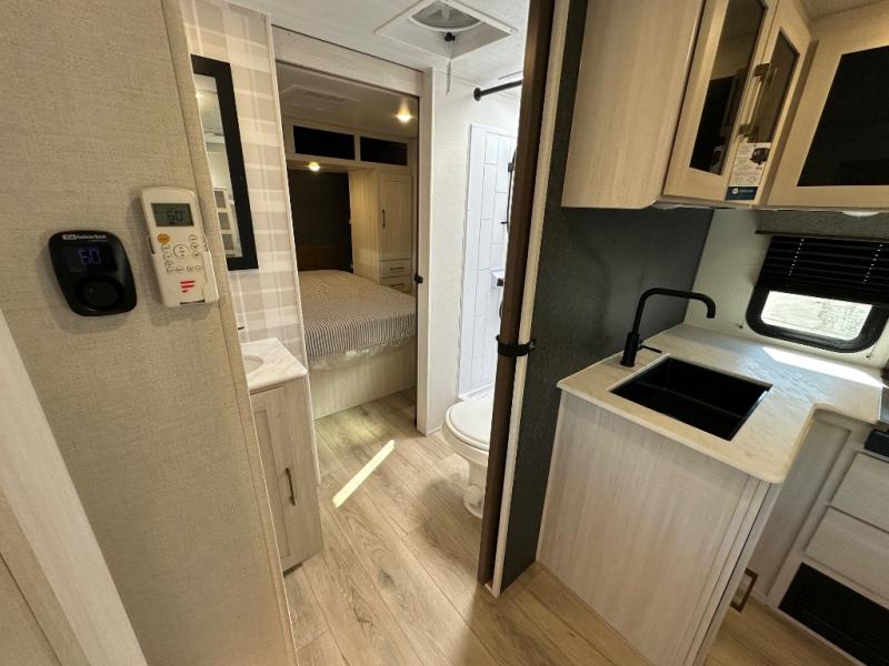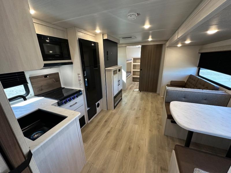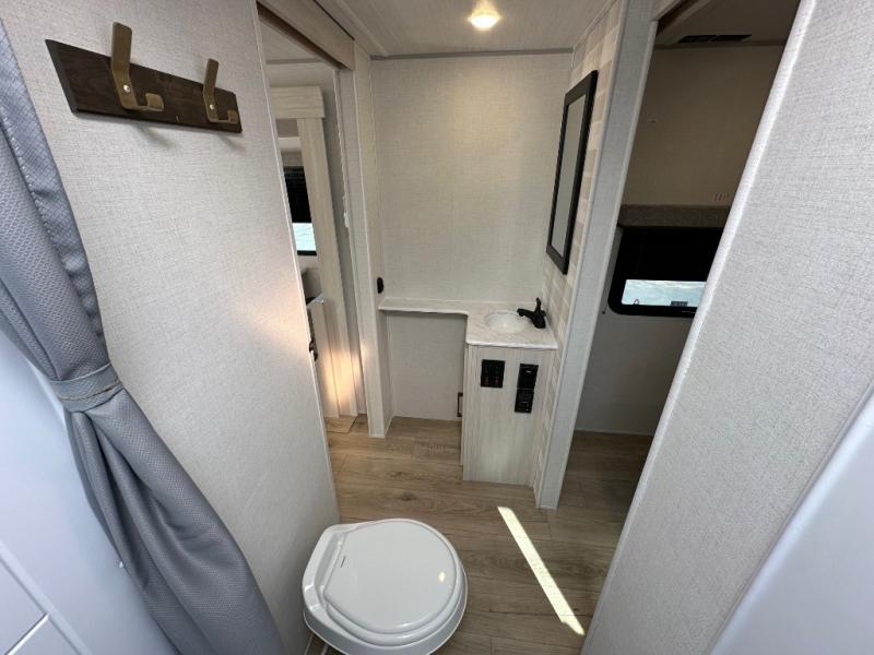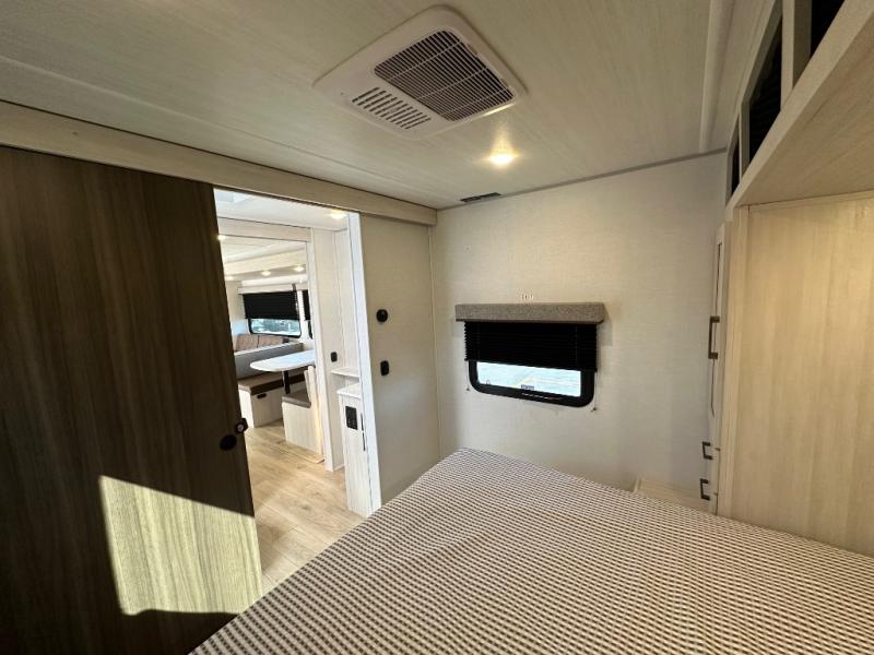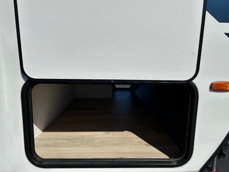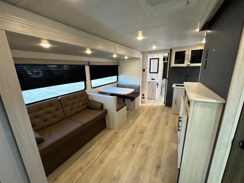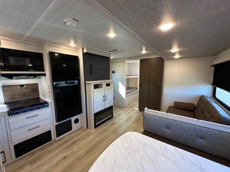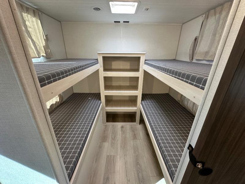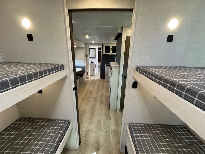 Head to your favorite camping spot with your favorite people in this spacious, dual-entry travel trailer! The large slide-out houses the booth dinette and plush sofa, creating a massive central hub for relaxation. The real highlight is the rear private bunkhouse, which features quad bunks and a dedicated wardrobe, providing a secluded space for the kids or guests to call their own. The walk-thru bath layout is incredibly convenient, offering a natural flow through the coach and doubling as a buffer for privacy between the living area and the master suite.