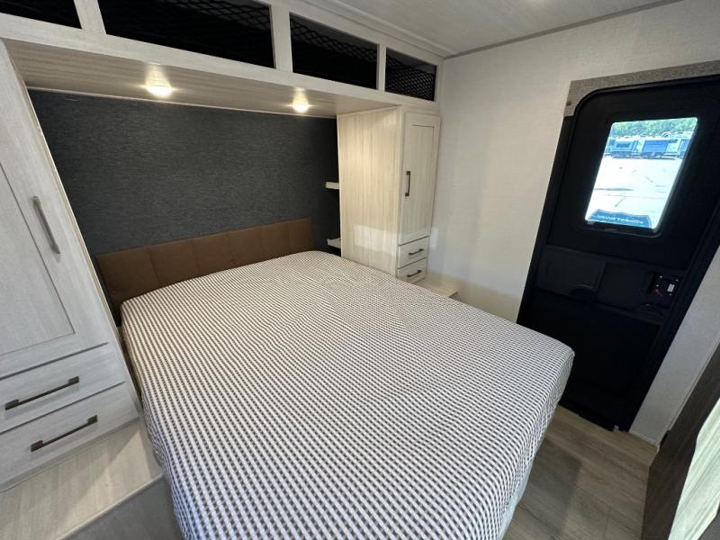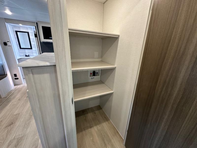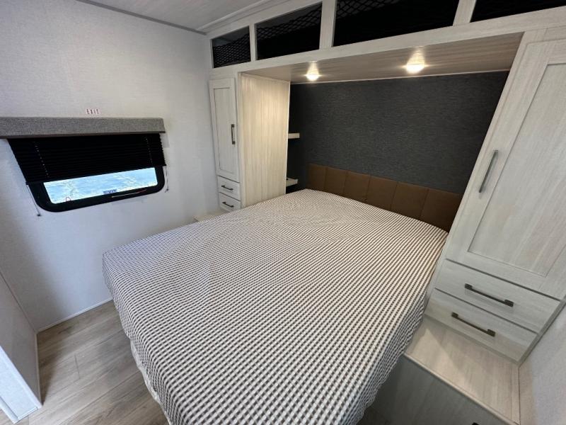 Culinary enthusiasts will love the full kitchen, which features a modern microwave with an air fryer and a high-capacity 12V refrigerator. Storage is a top priority in this model, featuring an impressive walk-in pantry that comes uniquely equipped with washer and dryer prep—making it one of the few trailers in its class ready for full-time living or extended cross-country journeys. When it's time to retreat, the front master bedroom offers a 60" x 80" residential queen bed with dual bedside wardrobes and overhead cabinets to keep everything tidy.