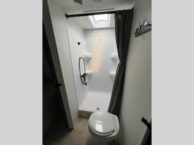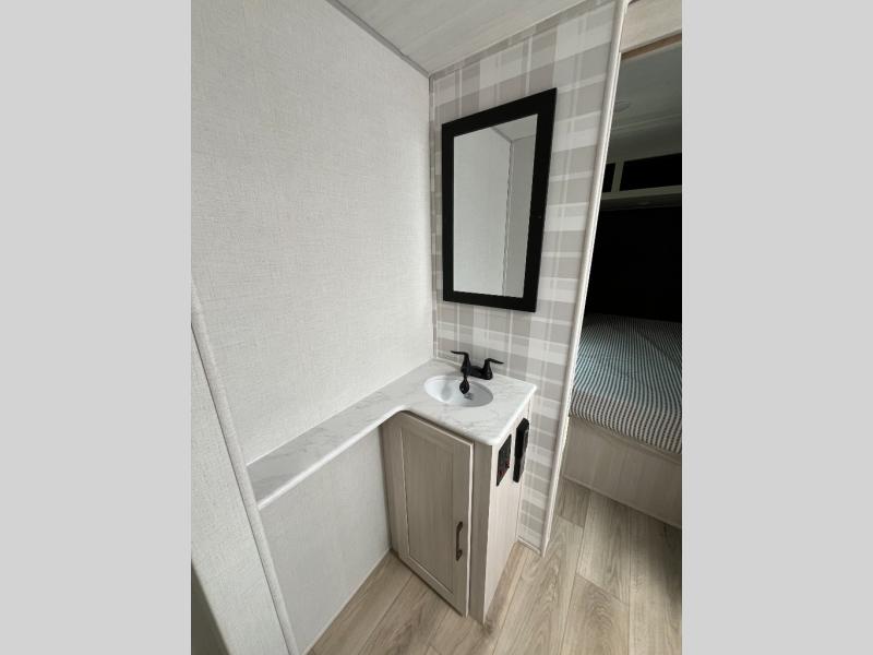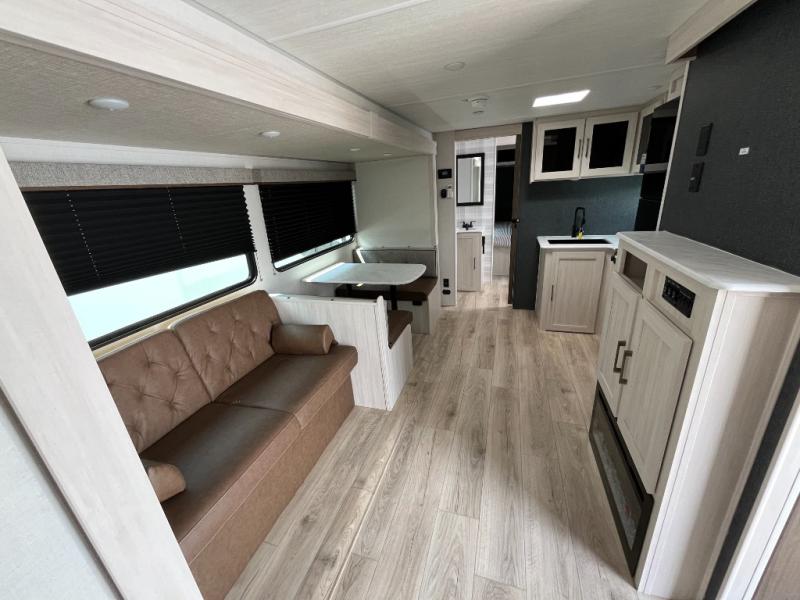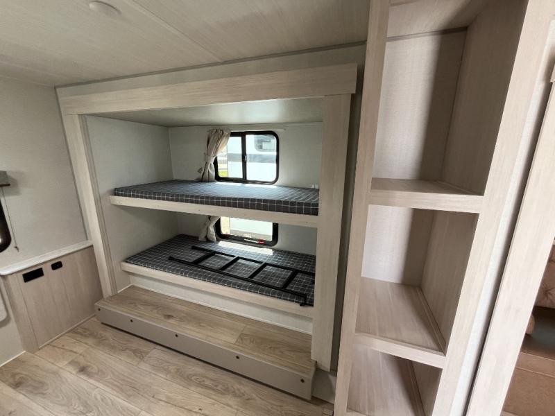 Head to your favorite camping spot with your favorite people in this spacious, dual entry travel trailer! The large slide out houses the booth dinette and sofa where you can relax in the evenings and even let guests sleep over who haven't claimed the triple bunks in the rear bunkhouse. There is also a bunkhouse sofa, two wardrobes, cubbies, and a flip-up desk if you need a space to work. A walk-thru bath is convenient for all, and the full kitchen lets you whip up your best meals in the microwave with an air fryer. There is also a walk-in pantry with washer and dryer prep if you choose to add those appliances. When it's time to call it a night, the front master bedroom with a queen bed will provide you with your own space to retreat to, and there are dual bedside wardrobes to keep your clothes organized.