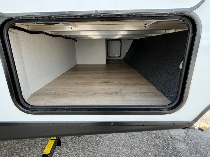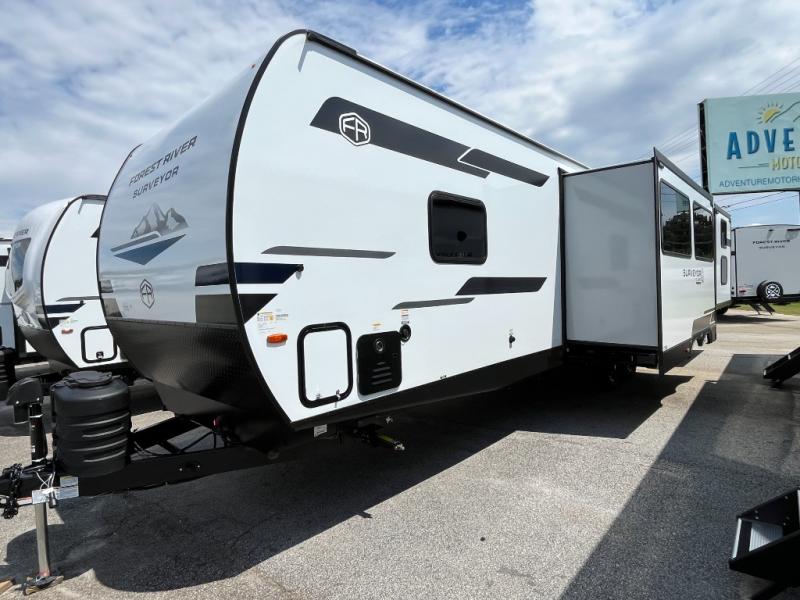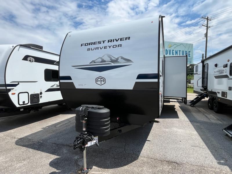 Value and versatility go hand-in-hand with the Surveyor Camp Series travel trailers by Forest River. The solid construction includes a 2" aluminum framed floor with block foam insulation and a sealed underbelly with forced heat and radiant foil insulation. A 100-watt roof mounted solar panel will provide some off-grid power, and the power tongue jack will let you easily hitch up and go whenever you're ready. Additional stand-out features include Surf(X) seamless countertops throughout, two A/C units, an electric awning with LED light strip, black glass friction hinge entry door(s), and so much more!