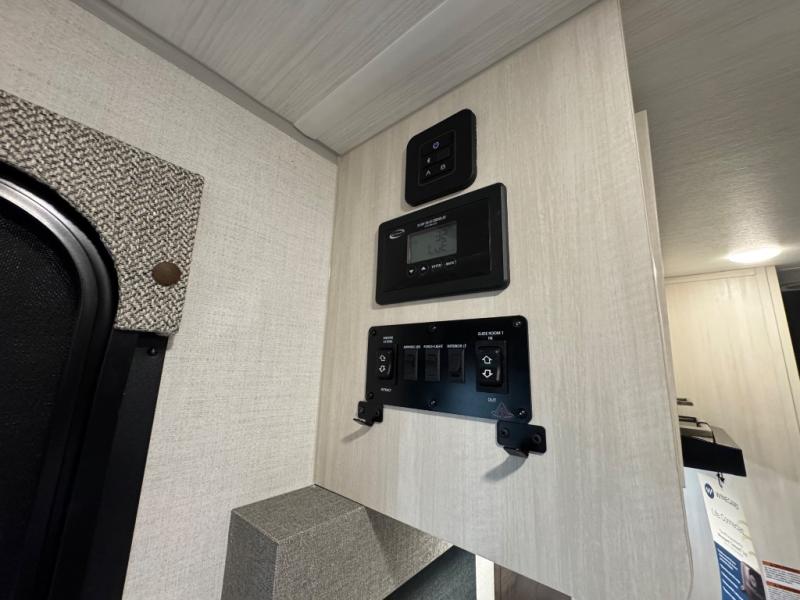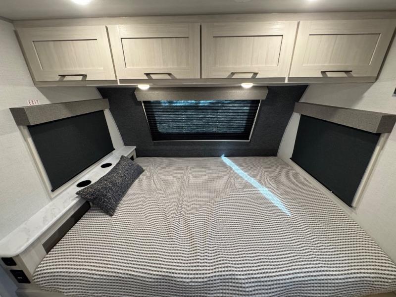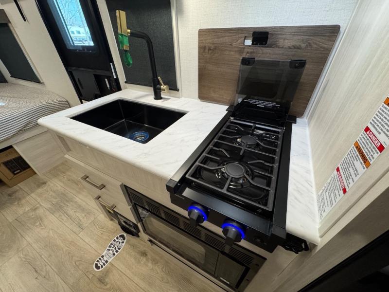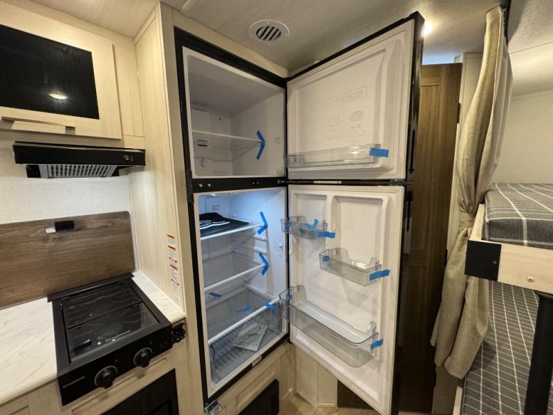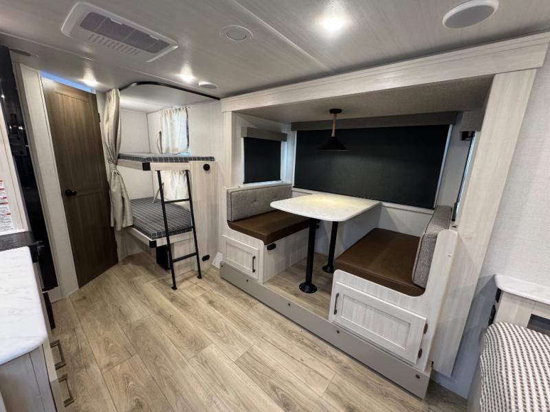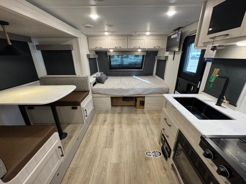 Bring along family or friends in this travel trailer that can sleep up to five people each night. The dinette slide will provide the chef space to cook on the two burner cooktop, or they may just head outdoors to cook on the outside kitchen. There is also an outdoor shelf here and a spray port for your convenience. The true queen-size bed up front is sure to provide a great night's rest, plus there is a "Stargazer" front window that will allow natural light in and beautiful starry nights.
