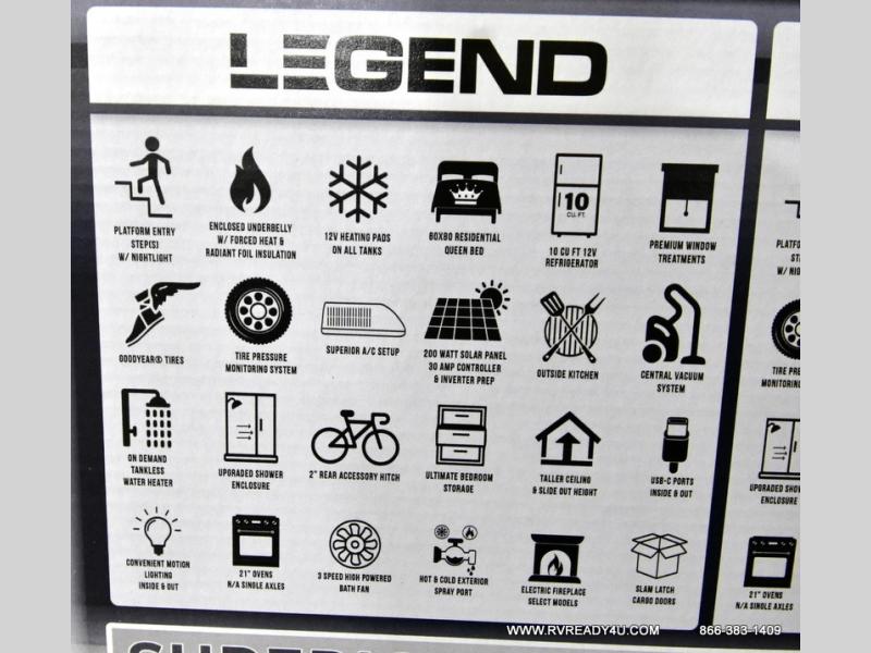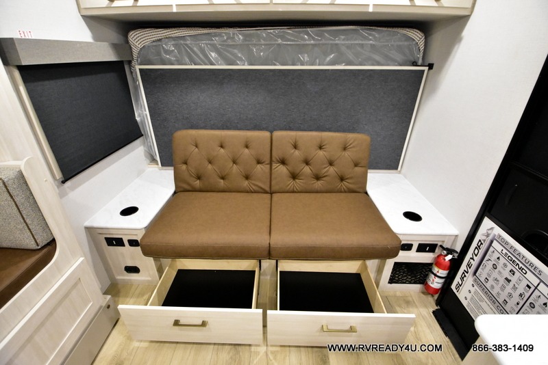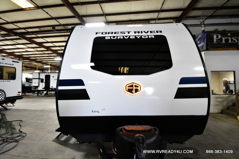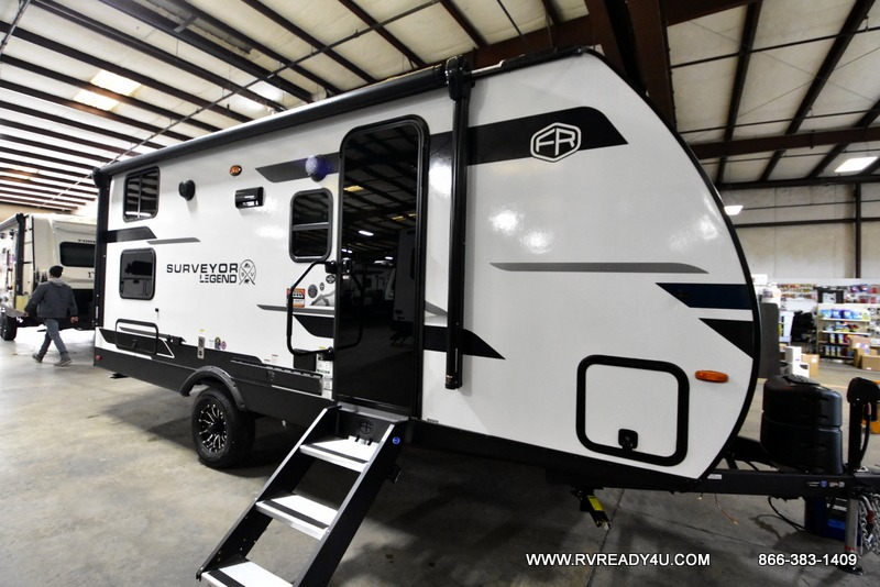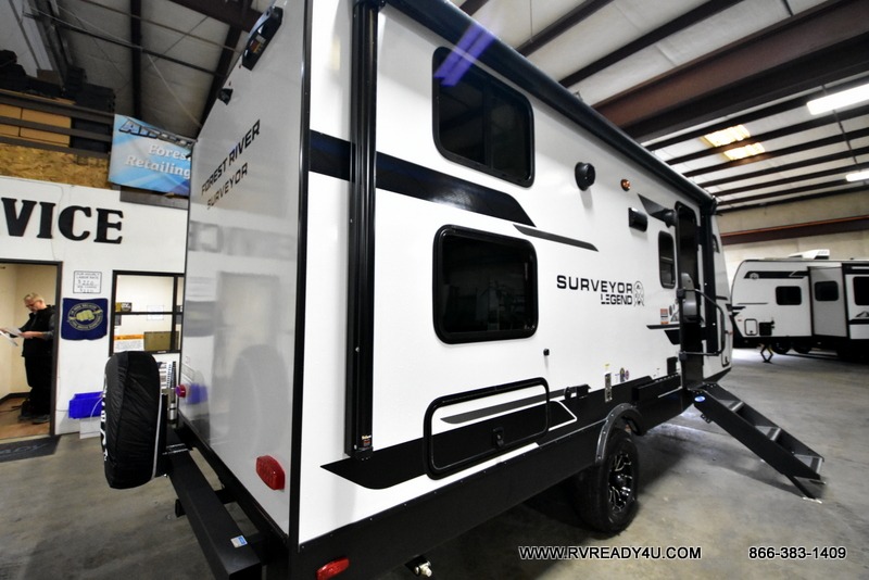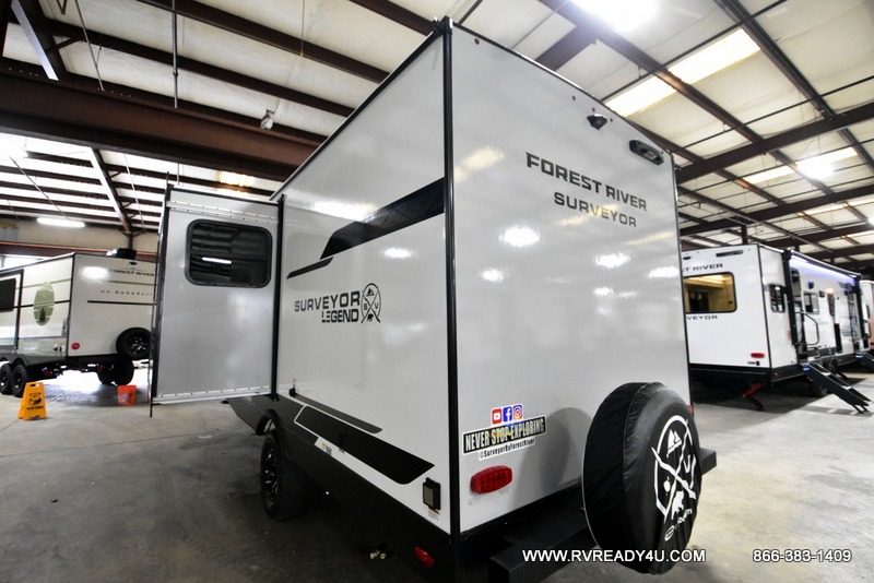 With any Surveyor Legend travel trailer by Forest River you will enjoy quality craftsmanship, convenient amenities, and at-home comforts. The Azdel composite walls provide a longer-lasting trailer, and the power tongue jack with hitch light makes getting back on the road quick and easy. There are also Goodyear® tires and a tire pressure monitoring system (TPMS) for more confident, hassle-free towing. Each model is built with thoughtful details like slam-latch exterior baggage doors and an automotive-style tinted front windshield that gives the front cap a sleek look while letting in natural light. You’ll appreciate camping with a tankless water heater for endless hot showers, a 2" rear accessory hitch to bring bikes or extra gear along, plus a central vacuum system that helps keep your easy-to-clean interior looking fresh.