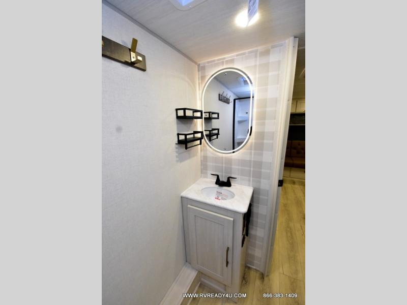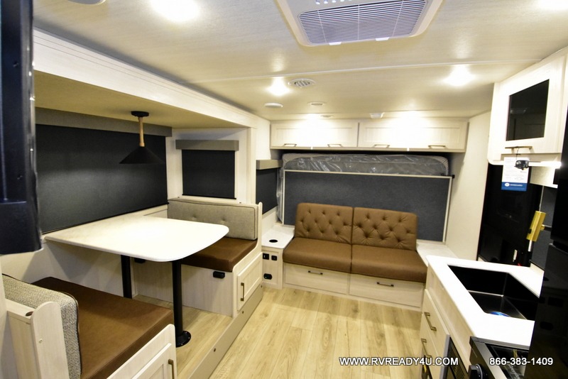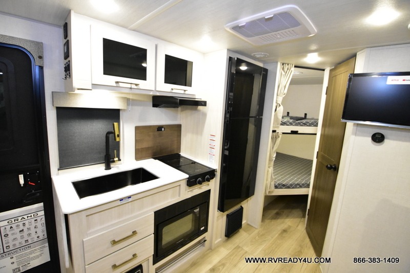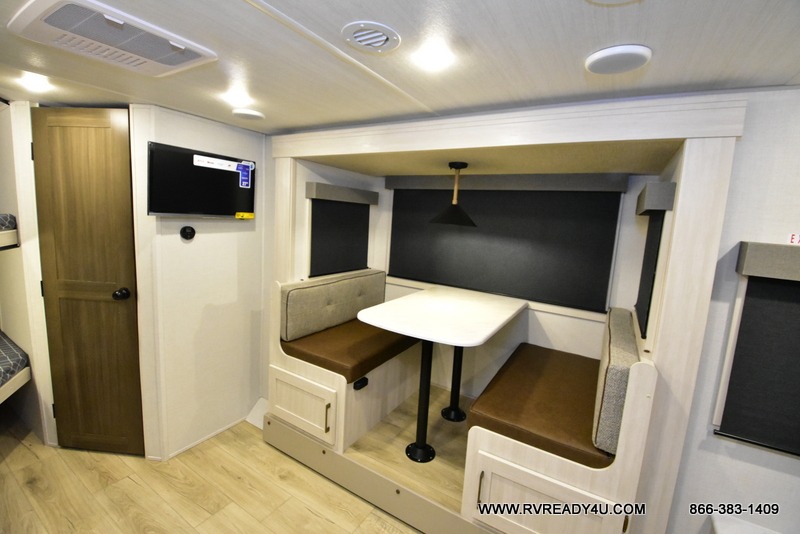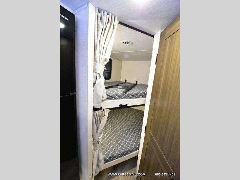 Experiencing the camping lifestyle just got easier with this travel trailer! The outdoor kitchen includes griddle and a shelf, plus there is a two burner cooktop inside if the weather isn't cooperating. There is a dinette slide where you can play a game of cards at, and the HD TV will allow you to keep up on your favorite shows. The kids or your guests can make themselves comfortable on the oversized bunks with a ladder, and the spacious full bath is close by for easy nighttime use. This model also includes a front queen-size Murphy bed with two end tables to set your books or phone on, plus there is overhead storage for your valuables.
