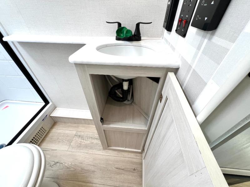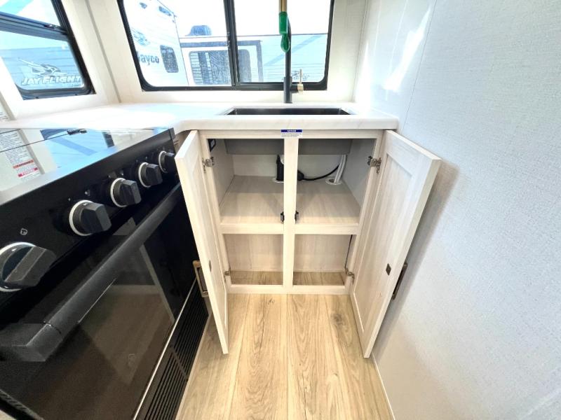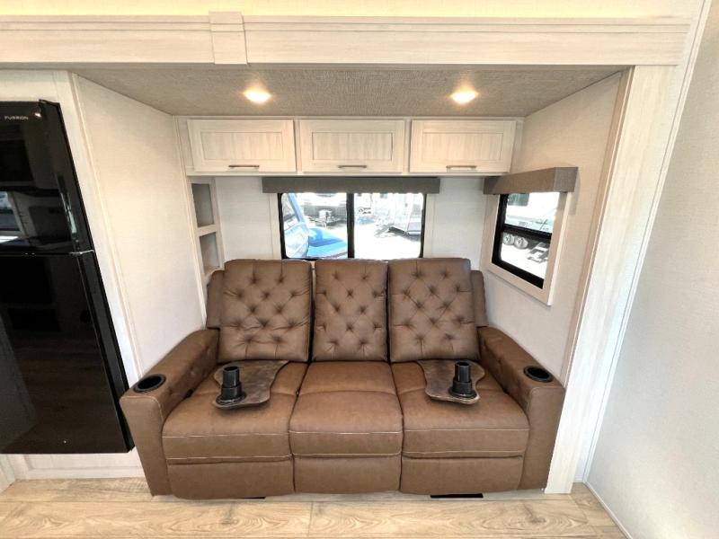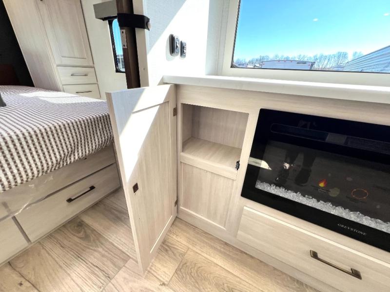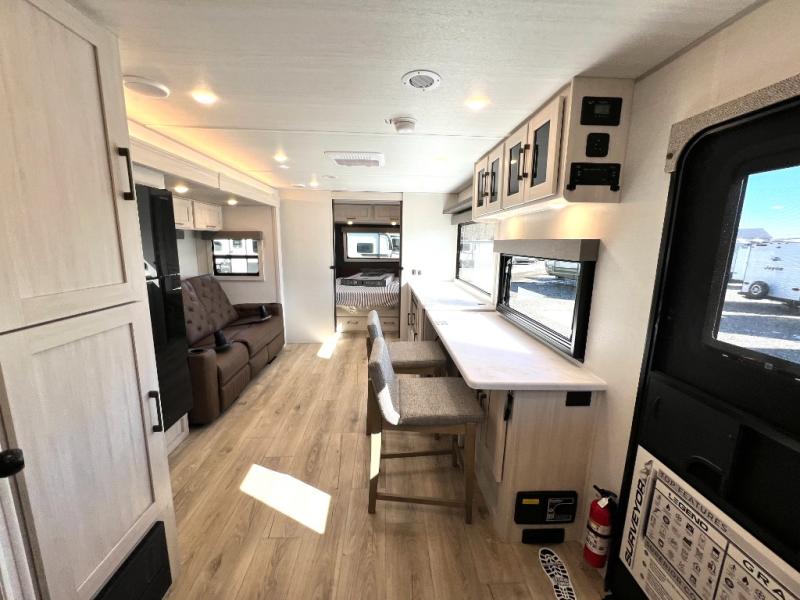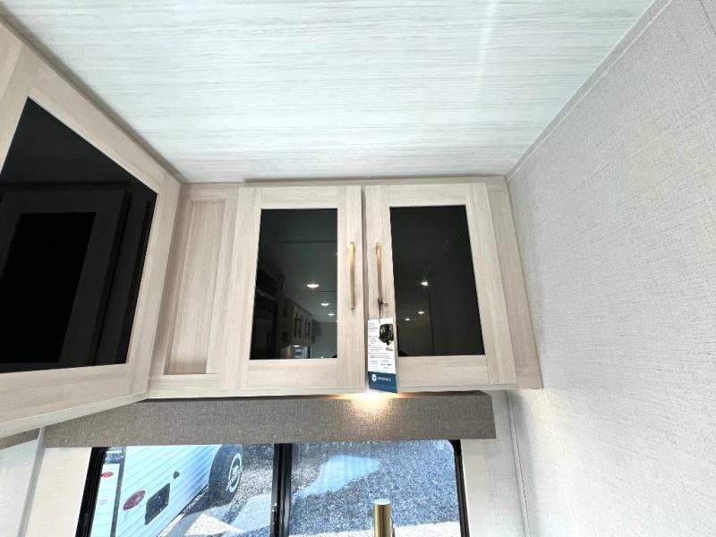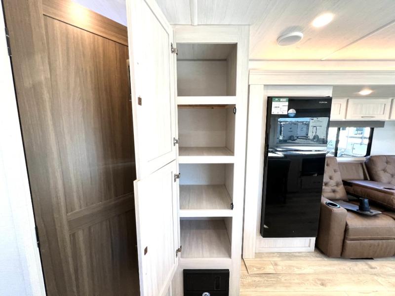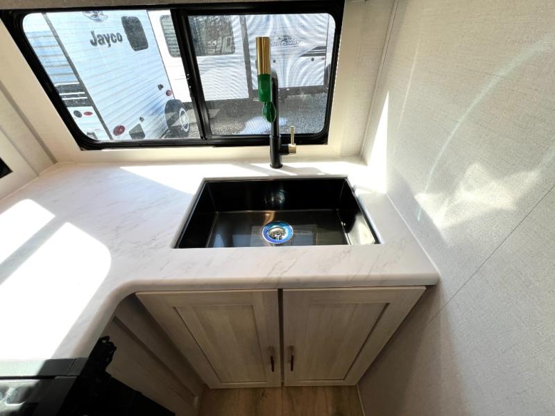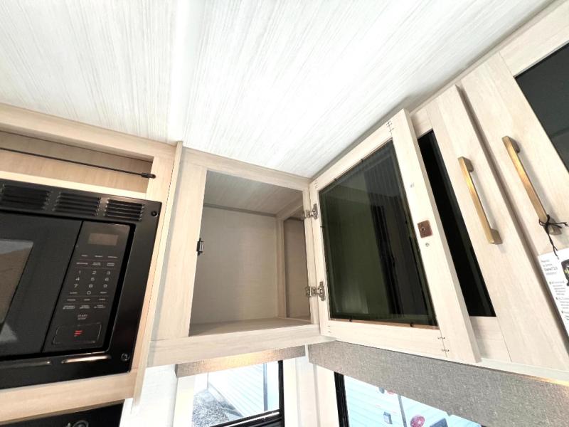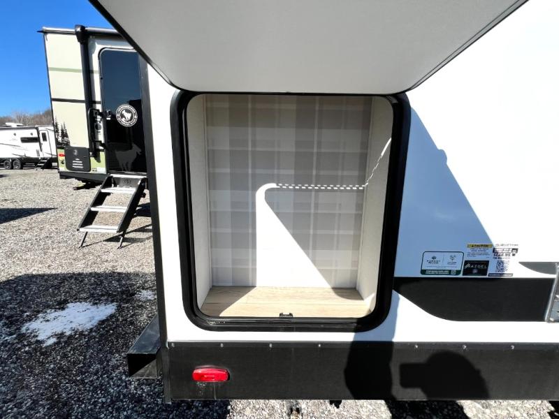 Packed with a lot of comfort into a manageable footprint is what you are getting with this model. Up front, you’ll find a cozy queen bed where you can really stretch out at the end of the day, and when it’s time to unwind, the TV lift brings your entertainment up into view across from the theater seating so you can actually relax instead of craning your neck at an awkward angle. A dedicated pantry gives you real space for dry goods and snacks so the kitchen doesn’t feel cluttered, even on longer trips. Outside, this floorplan really leans into campsite living with a handy outside kitchen that keeps you in the action while you’re cooking.