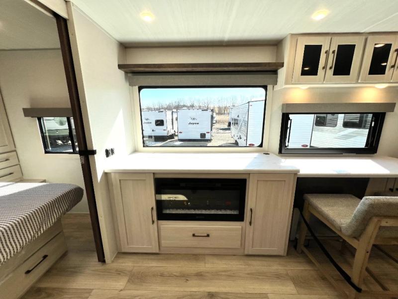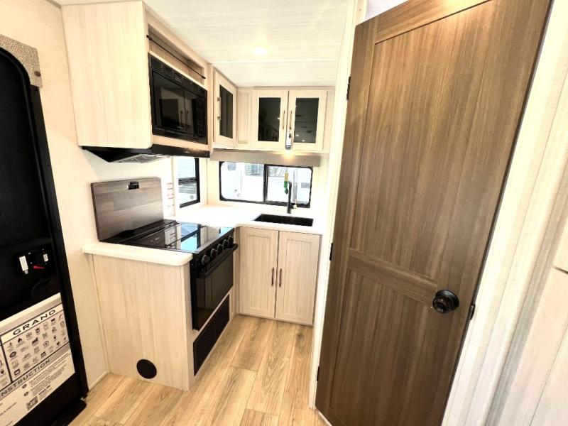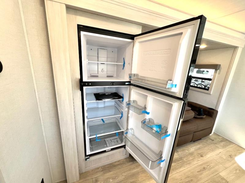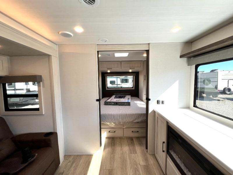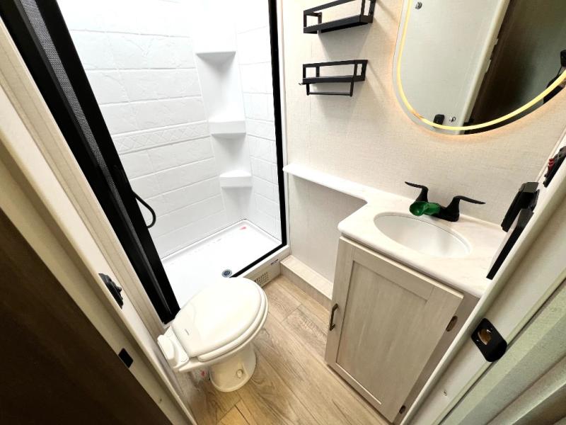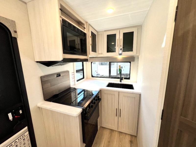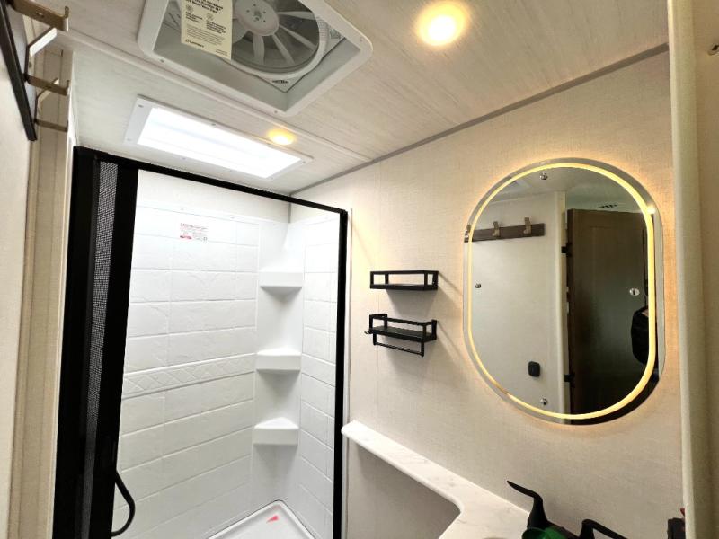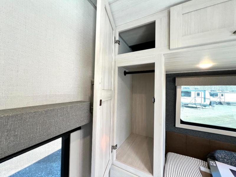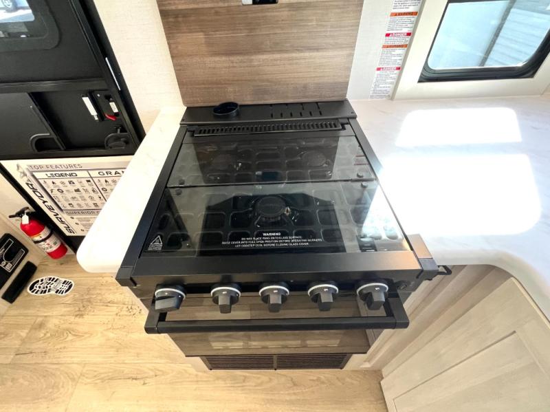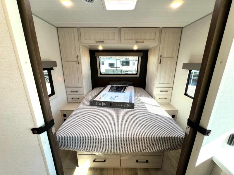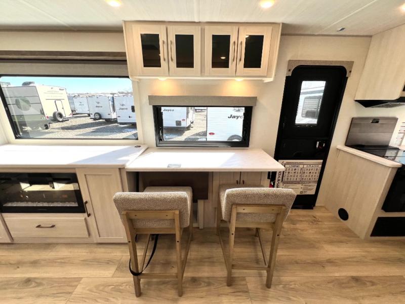 Packed with a lot of comfort into a manageable footprint is what you are getting with this model. Up front, you’ll find a cozy queen bed where you can really stretch out at the end of the day, and when it’s time to unwind, the TV lift brings your entertainment up into view across from the theater seating so you can actually relax instead of craning your neck at an awkward angle. A dedicated pantry gives you real space for dry goods and snacks so the kitchen doesn’t feel cluttered, even on longer trips. Outside, this floorplan really leans into campsite living with a handy outside kitchen that keeps you in the action while you’re cooking.
