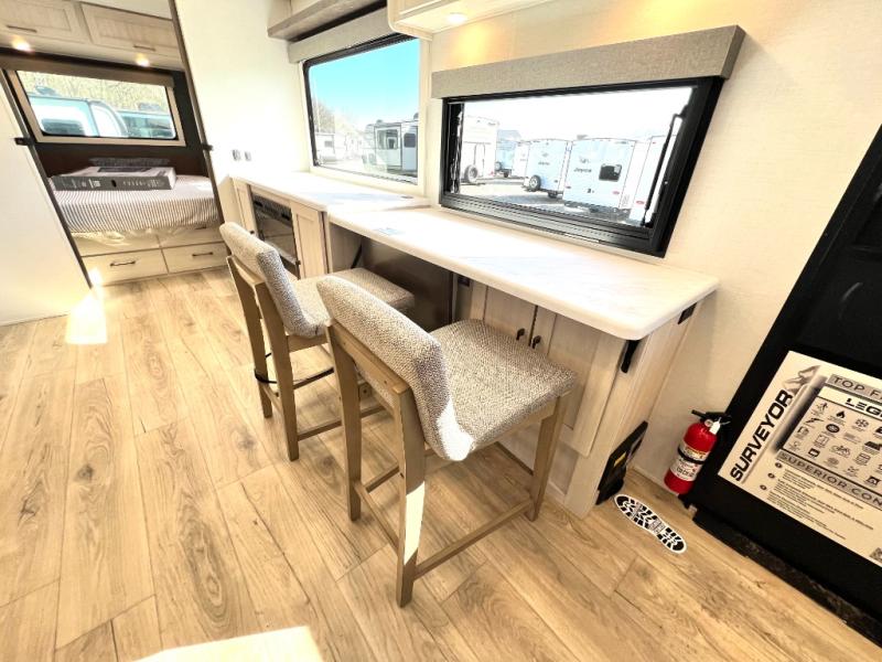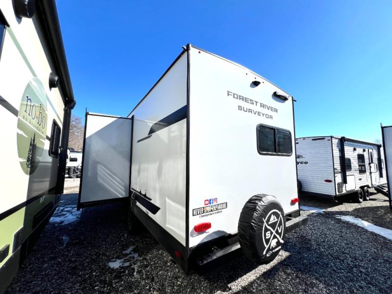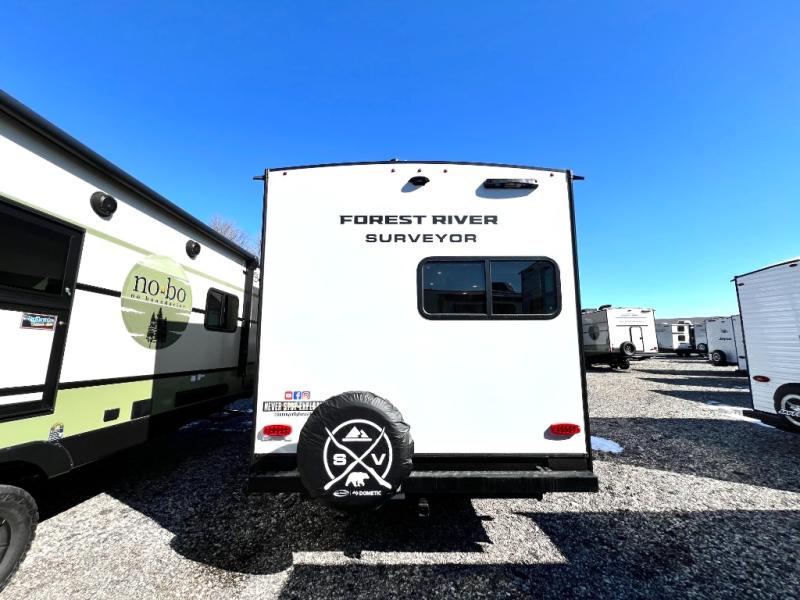 With any Surveyor Legend travel trailer by Forest River you will enjoy quality craftsmanship, convenient amenities, and at-home comforts. The Azdel composite walls provide a longer-lasting trailer, and the power tongue jack with hitch light makes getting back on the road quick and easy. There are also Goodyear® tires and a tire pressure monitoring system (TPMS) for more confident, hassle-free towing. Each model is built with thoughtful details like slam-latch exterior baggage doors and an automotive-style tinted front windshield that gives the front cap a sleek look while letting in natural light. You’ll appreciate camping with a tankless water heater for endless hot showers, a 2" rear accessory hitch to bring bikes or extra gear along, plus a central vacuum system that helps keep your easy-to-clean interior looking fresh.