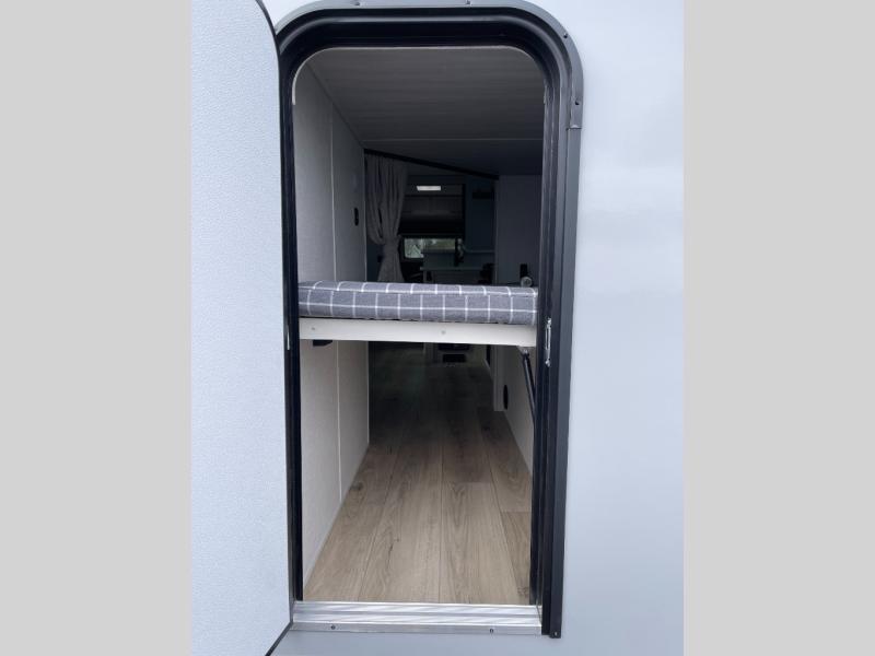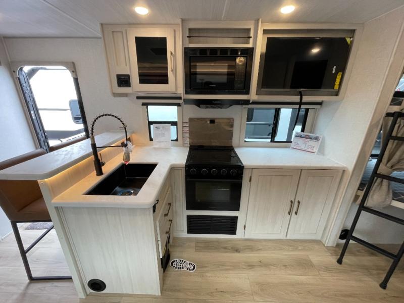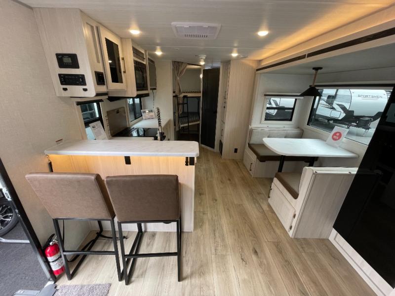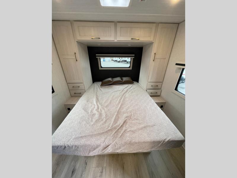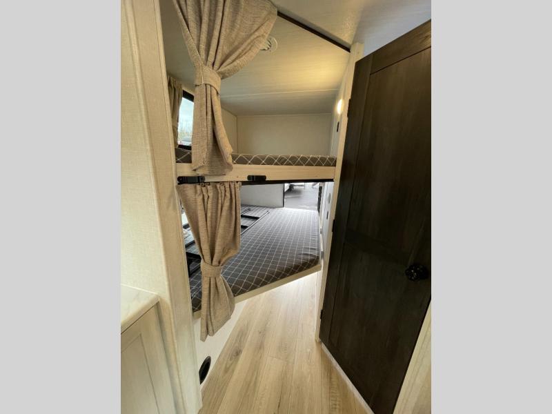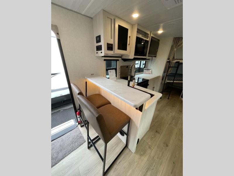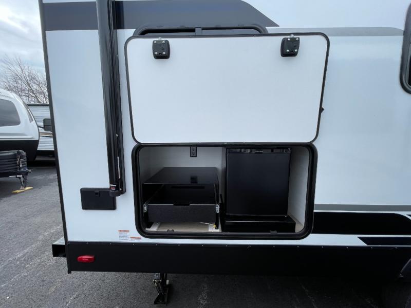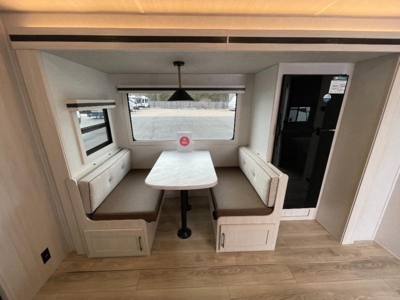 Every trip to the campground will be spent in comfort with this single slide out travel trailer. Once you arrive at the site, remove the kayaks or bikes from the rear storage door, start lunch on the outside kitchen, and put out the 15' power awning with LED lights. The interior includes a booth dinette slide with storage, a bar top with stools, plus an HD TV for movie nights. After a day of fun, head to the front private bedroom for a great night's rest on the queen bed, and you can store your belongings in the dual bedroom wardrobes!