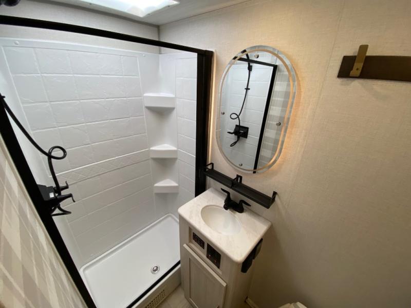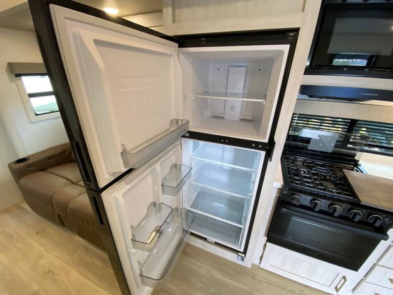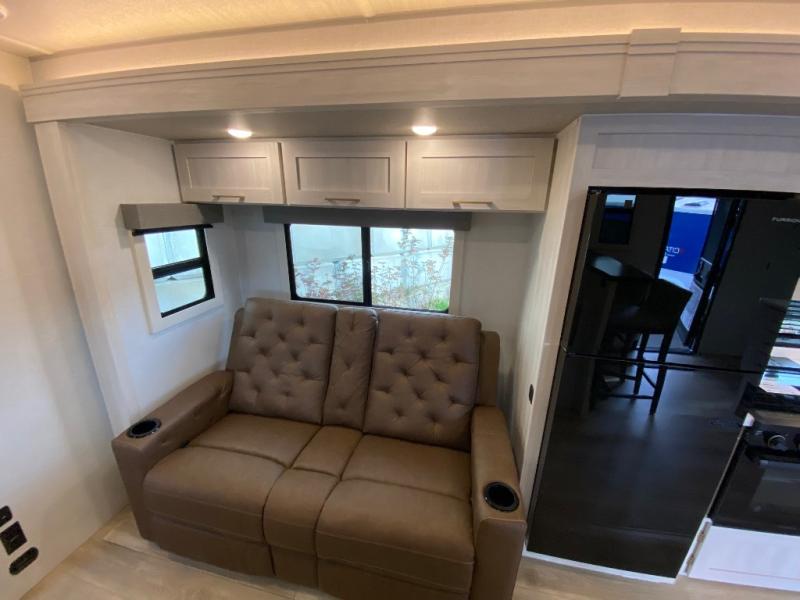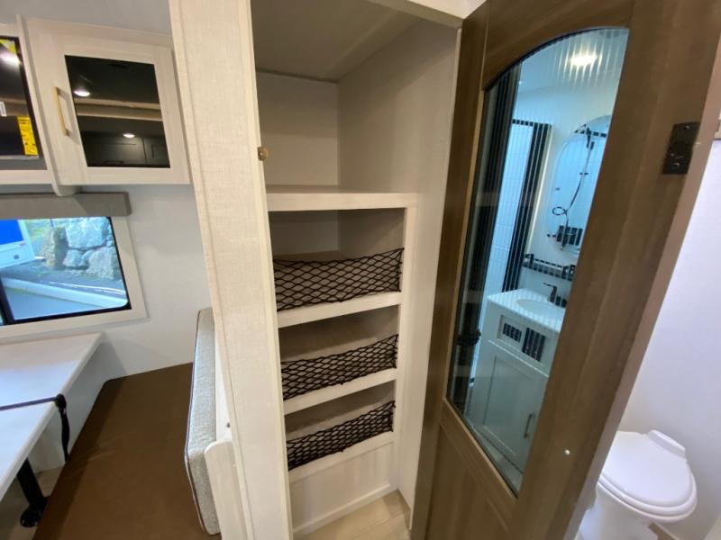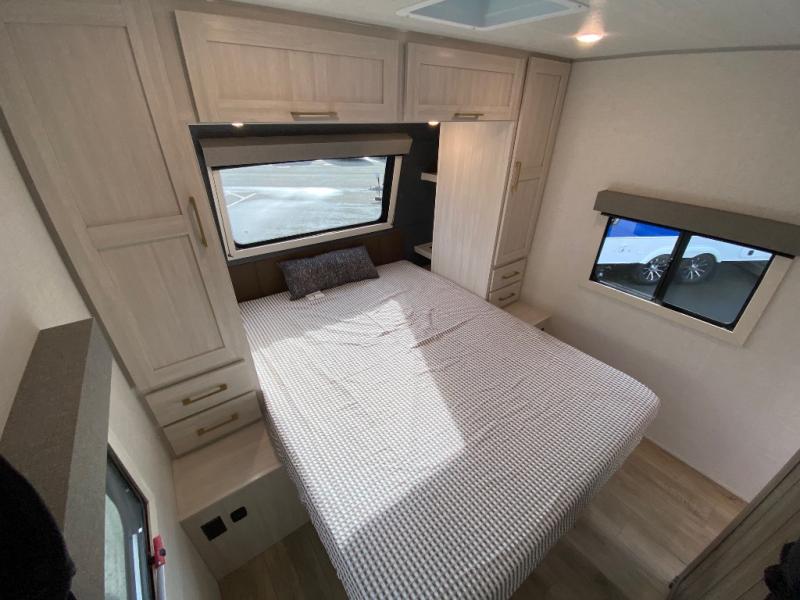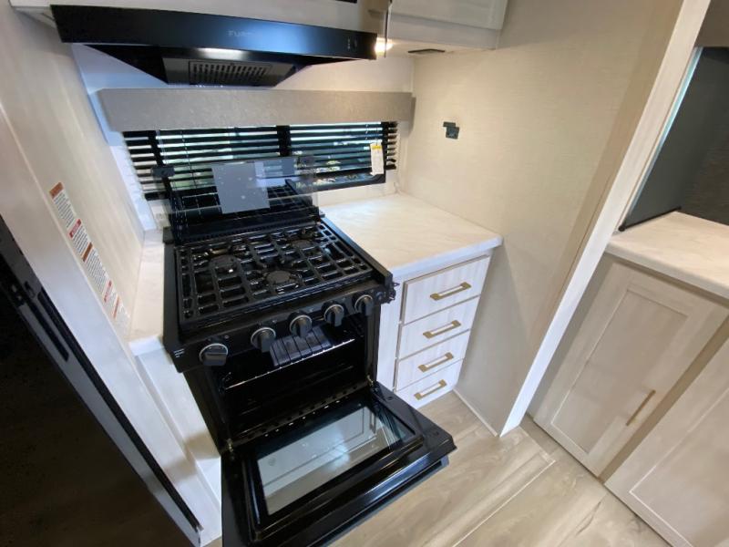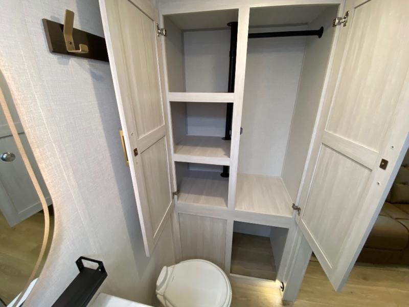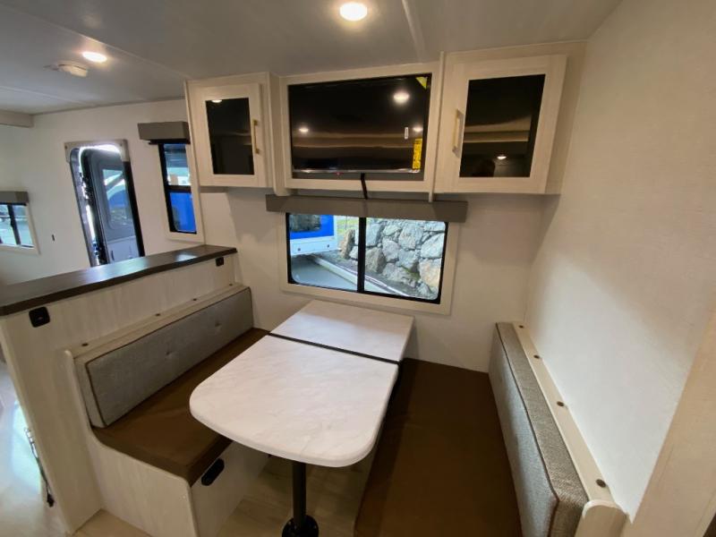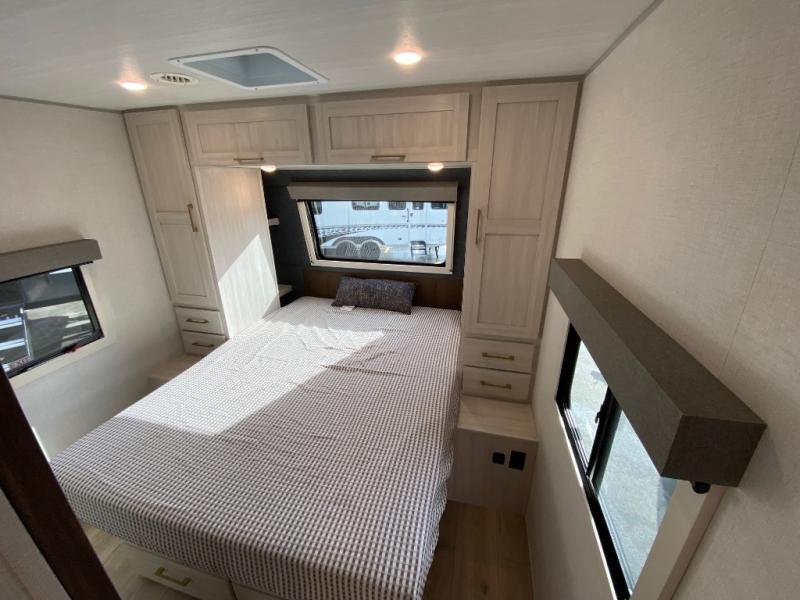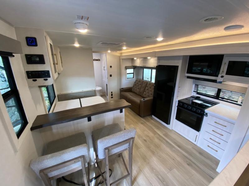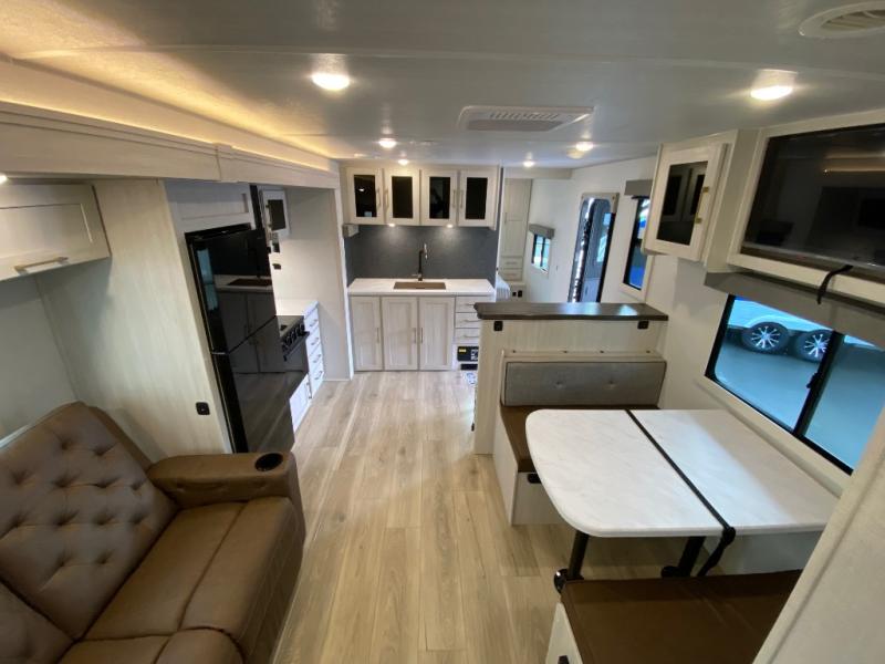Fun at the campground begins in this spacious travel trailer for five to six! You will enjoy having your own front private bedroom with a queen bed, while your guests sleep on the EZ-out sofa and booth dinette in the main living area. Breakfast can be made in the full kitchen on the residential range or outside on the exterior kitchen. There is ample storage space throughout this model, including dual bedroom wardrobes, overhead cabinets, a bath linen closet, and a walk-in pantry.