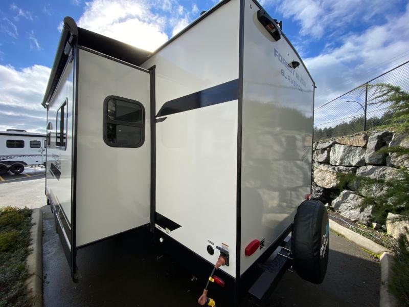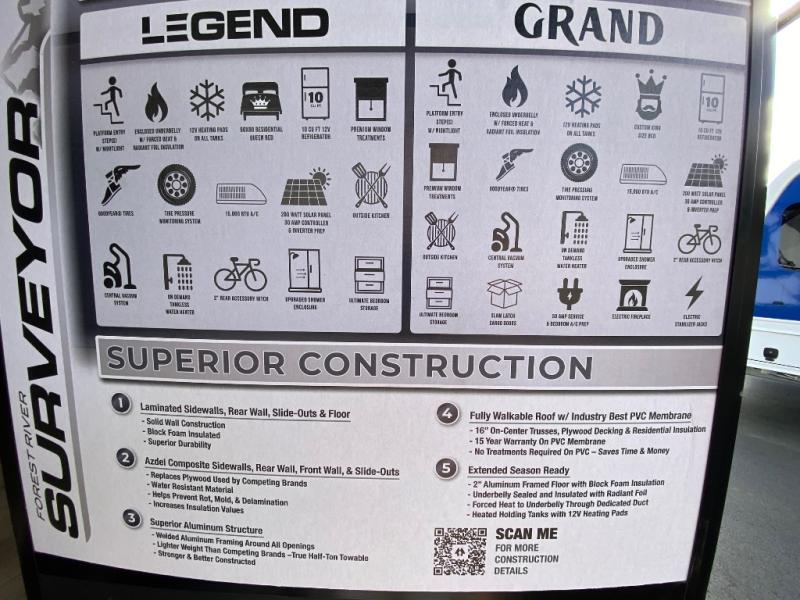 With any Surveyor Legend travel trailer by Forest River you will enjoy quality craftsmanship, convenient amenities, and at-home comforts. The Azdel composite walls provide a longer-lasting trailer, and the power tongue jack with hitch light makes getting back on the road quick and easy. There are also Goodyear® tires and a tire pressure monitoring system (TPMS) for more confident, hassle-free towing. Each model is built with thoughtful details like slam-latch exterior baggage doors and an automotive-style tinted front windshield that gives the front cap a sleek look while letting in natural light. You’ll appreciate camping with a tankless water heater for endless hot showers, a 2" rear accessory hitch to bring bikes or extra gear along, plus a central vacuum system that helps keep your easy-to-clean interior looking fresh.