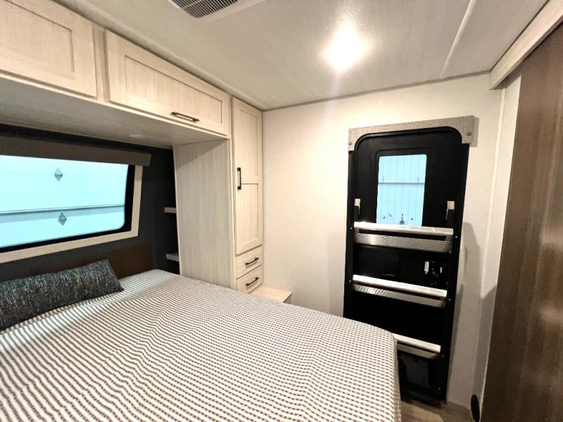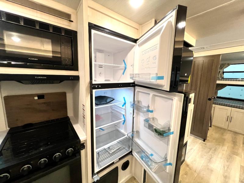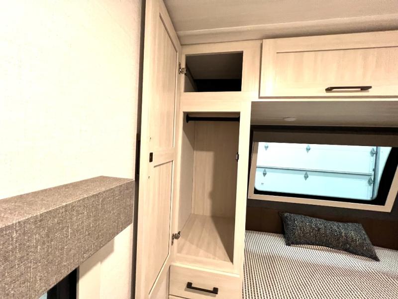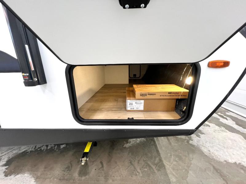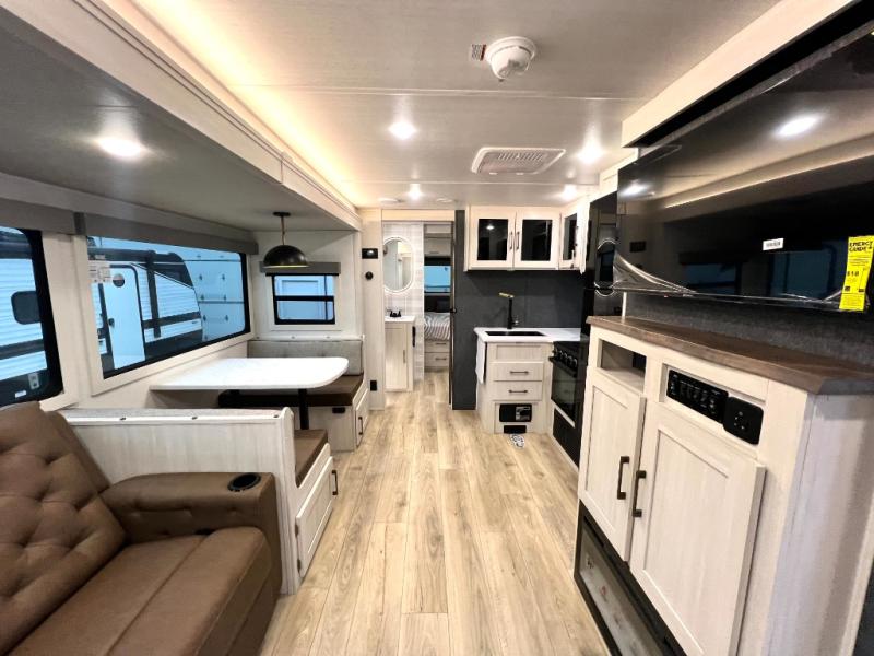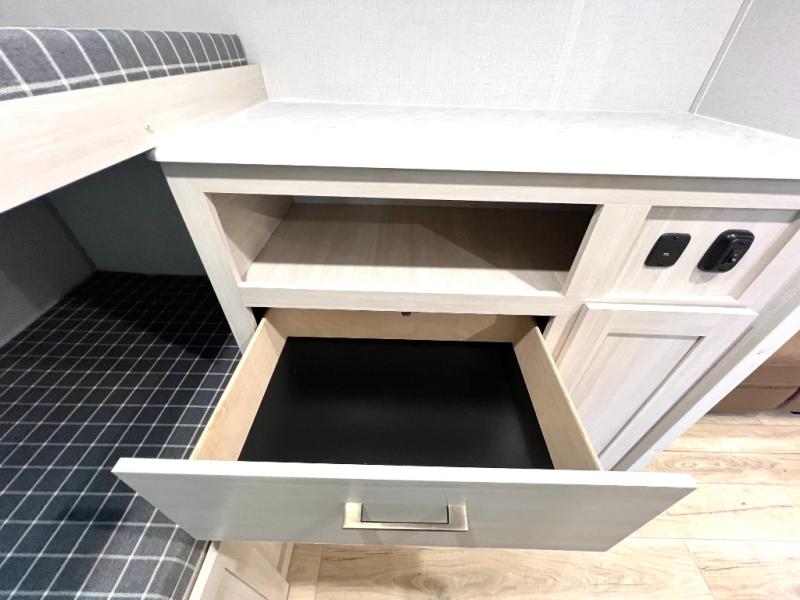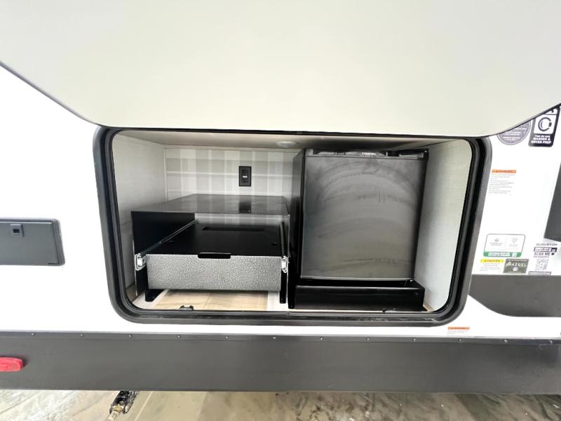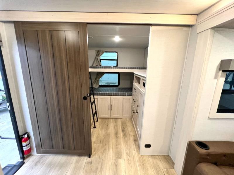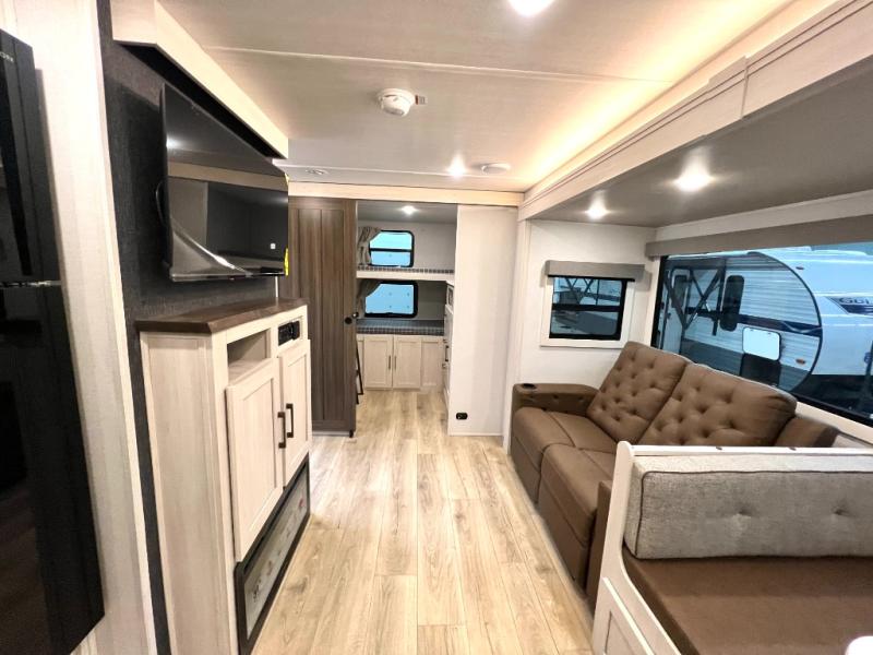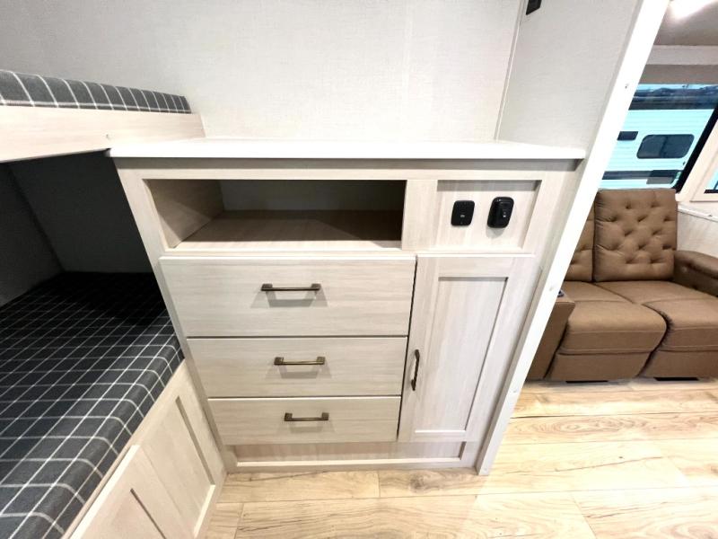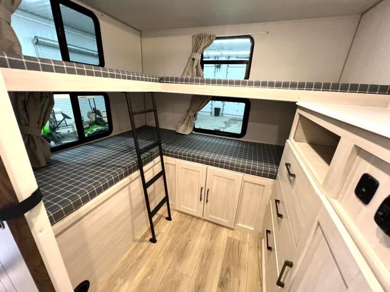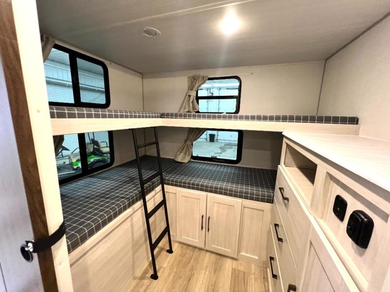 This spacious travel trailer is perfect for those who need plenty of sleeping space! There are four bunks in the bunkhouse for little ones or your friends, and the front master bedroom will feel just like home with its queen-size bed and dual drawers. You'll find a EZ-out sofa and booth dinette within the large slide in the main living area, and there is a walk-in pantry to store food, jackets, or umbrellas. And there is washer and dryer prep in the pantry if you choose to add those appliances. Don't overlook the exterior that includes an outside kitchen, a 21' electric awning, and outside storage!