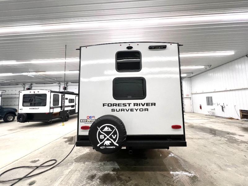 With any Surveyor Legend travel trailer by Forest River you will enjoy quality craftsmanship, convenient amenities, and at-home comforts. The Azdel composite walls provide a longer-lasting trailer, and the power tongue jack with hitch light makes getting back on the road quick and easy. There are also Goodyear® tires and a tire pressure monitoring system (TPMS) for more confident, hassle-free towing. Each model is built with thoughtful details like slam-latch exterior baggage doors and an automotive-style tinted front windshield that gives the front cap a sleek look while letting in natural light. You’ll appreciate camping with a tankless water heater for endless hot showers, a 2" rear accessory hitch to bring bikes or extra gear along, plus a central vacuum system that helps keep your easy-to-clean interior looking fresh.